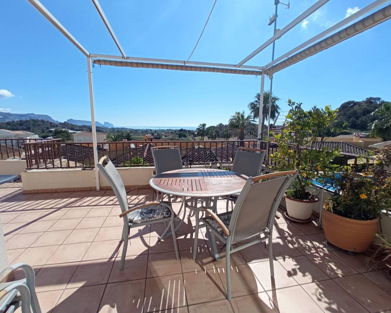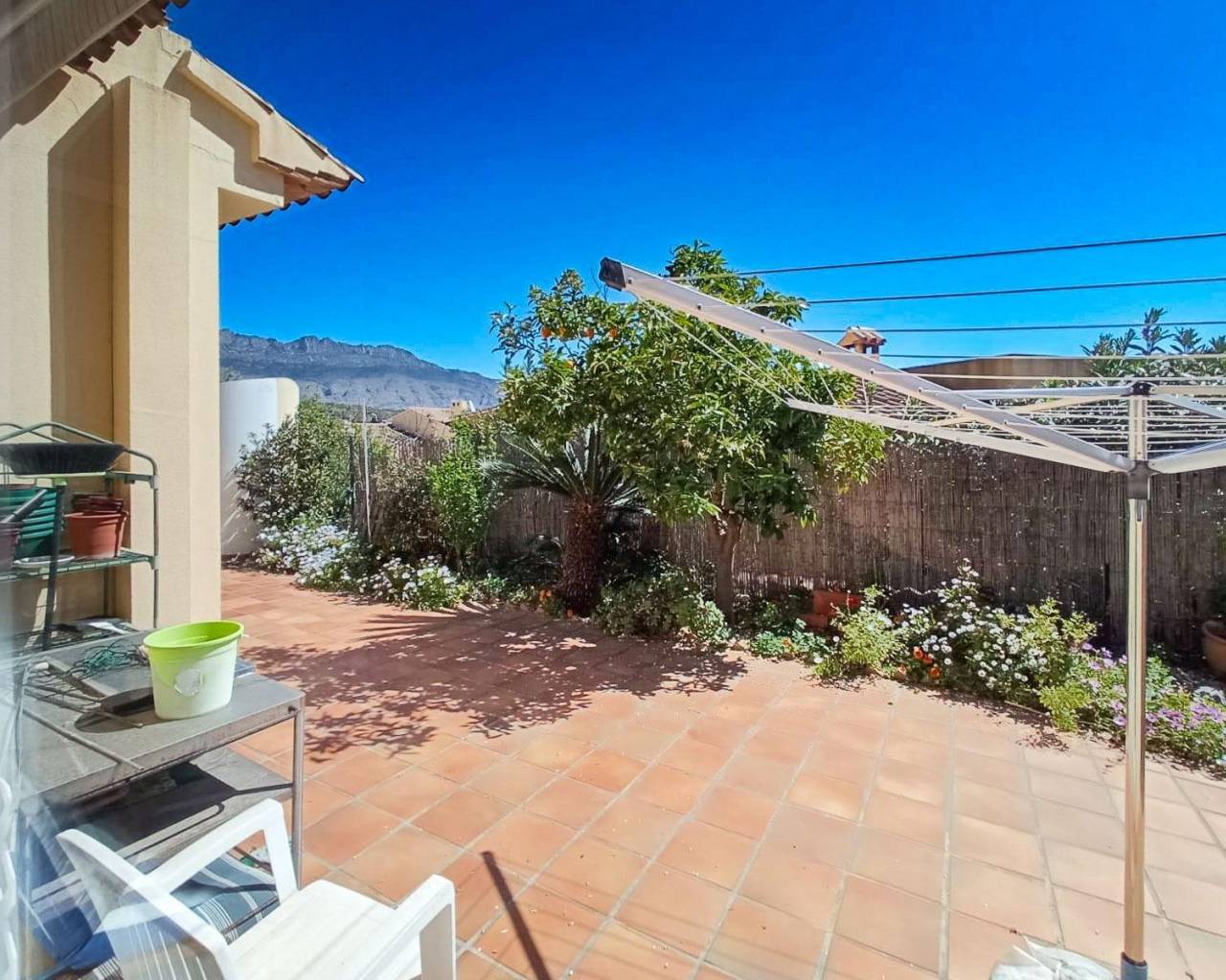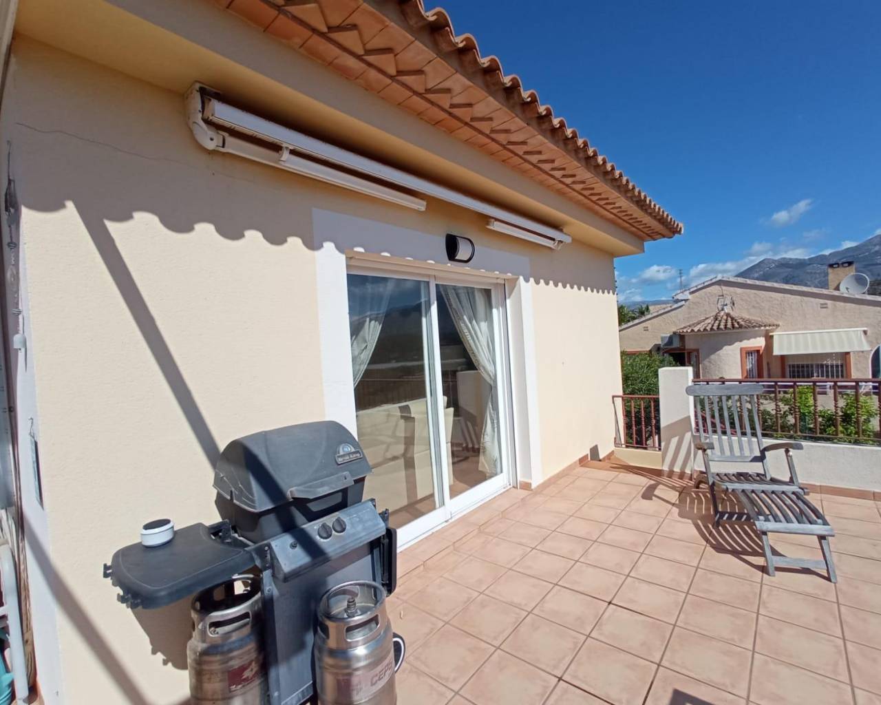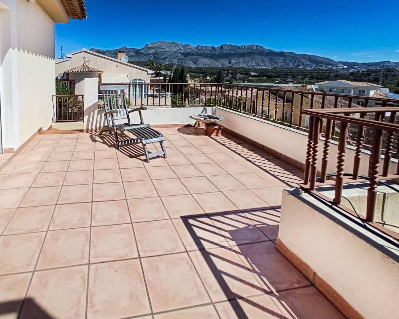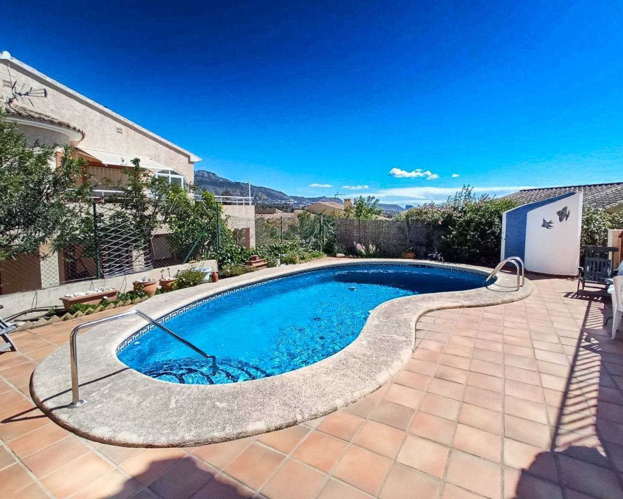 Chalet de 4 dormitorios (dividido en 2 plantas pudiendo hacerse 2 apartamentos independientes) de orientación este con amplia terraza con vistas al mar, la bahia de Altea y Sierra Bernia, garaje, piscina privada y 440m2 de parcela en urbanización tranquila cercana a supermercados.~Este chalet tiene un amplio salón comedor con mucha luz natural ya que da la terraza de impresionantes vistas. En esta planta tenemos la cocina semi-independiente totalmente equipada y amueblada, un aseo de cortesía, la habitación principal con luz natural y armario empotrados y un baño en suite con bañera y ducha aparte.~A la planta inferior se accede por un escalera interior que por un lado da a un pequeños despacho y al garaje / trastero y por otro, a través de una puerta (que podría ser cerrado o incluso tapada) un apartamento de 3 dormitorios, salón, baño completo y puerta independiente al exterior. Todas las habitaciones tienen luz natural. La principal con armario empotrado, una segunda con cama simple y armario empotrado y una tercera, con cristalera directa al patio y al jardín.~La parcela de 440m2 incluye la piscina, zona de patio, jardines y parking en bajada al garaje con puerta automática y portón eléctrico.~La vivienda esta situada entre Altea y La Nucía, en la misma calle hay un supermercado y otro establecimiento cerca.~A cinco minutos en coche está el centro de Altea, y Alfaz y La Nucía a 10 minutos.~~~~