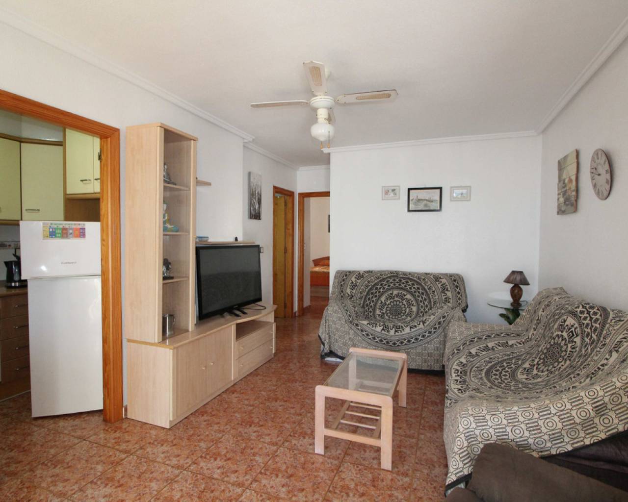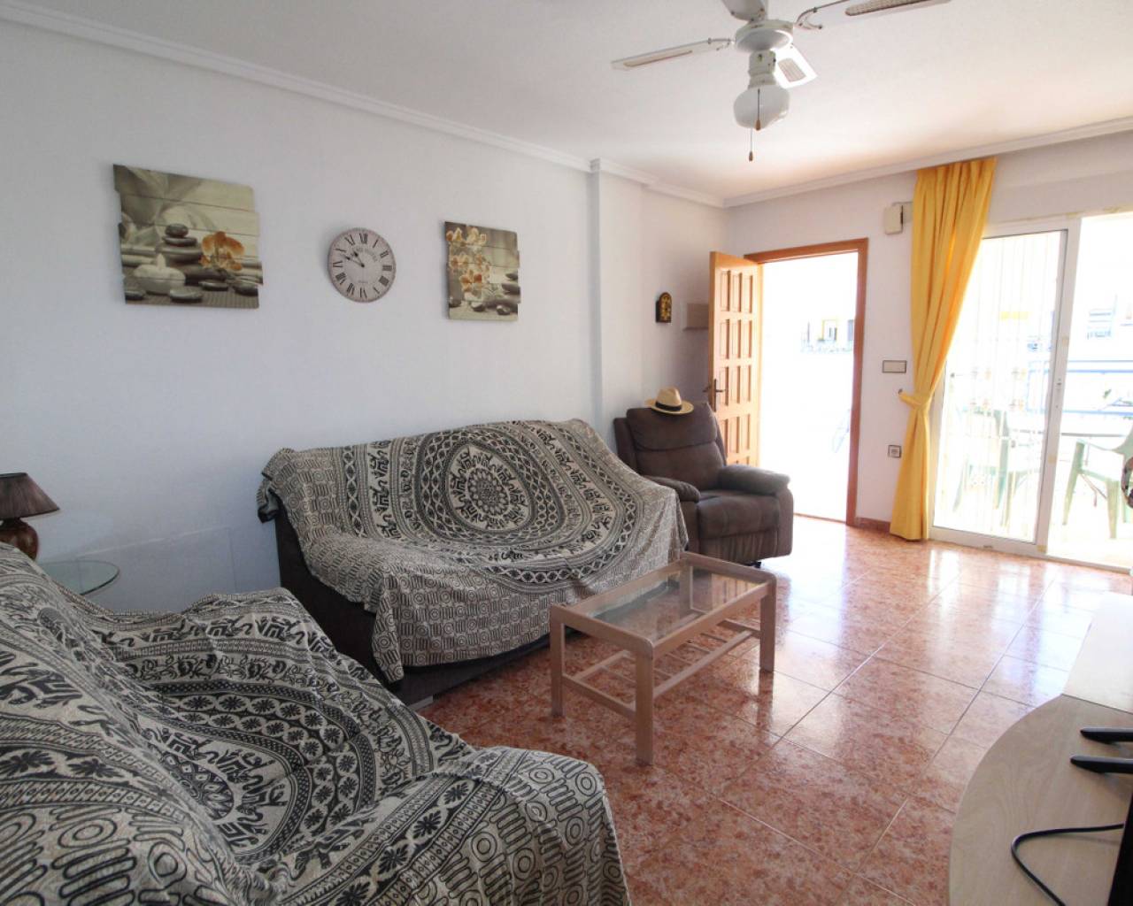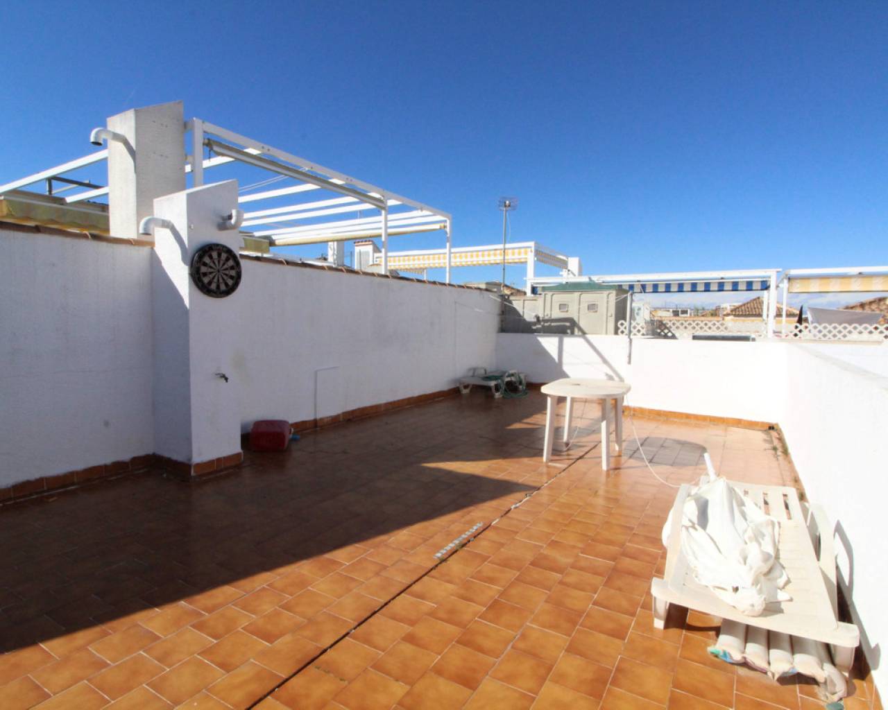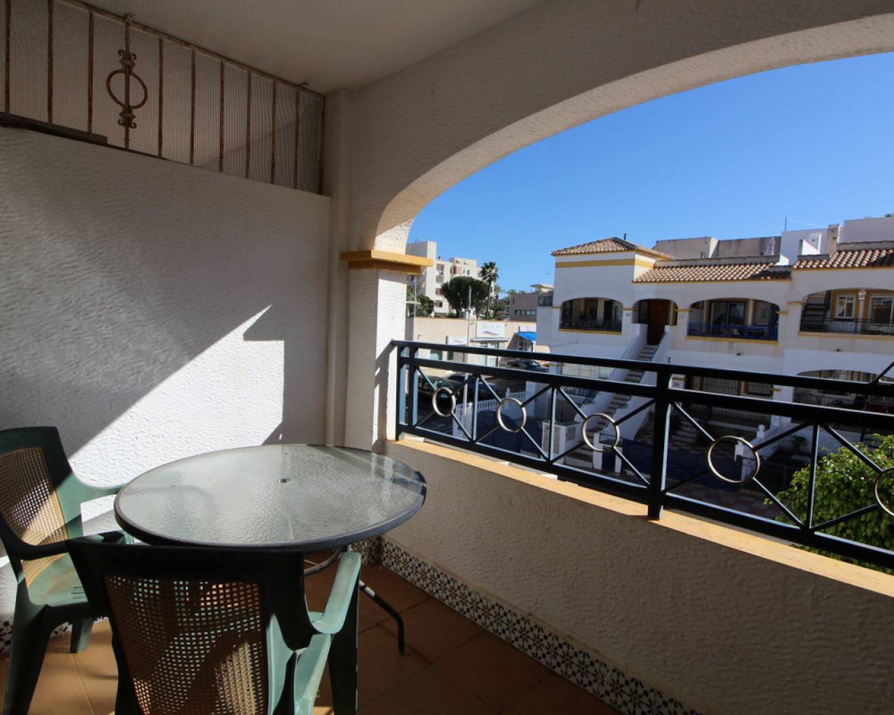 Les presentamos este ático, ubicado en la zona alta de Gran Alacant, en una urbanización cerrada, muy cerca de colegios, institutos, polideportivo, restaurantes, tiendas, bares, paradas de autobús y centro médico. Al entrar, encontrará un salón-comedor con acceso al balcón y al solárium. La cocina está equipada con vitrocerámica, horno, lavadora y frigorífico/congelador. El apartamento cuenta con dos dormitorios, ambos con armarios empotrados, y un baño con ducha/bañera. Al salir al balcón, unas escaleras suben al solárium, el cual es del mismo tamaño que el área de la vivienda, con vistas a Alicante y al mar. Este apartamento está orientado al sur, lo que le permitirá disfrutar del sol todo el año.