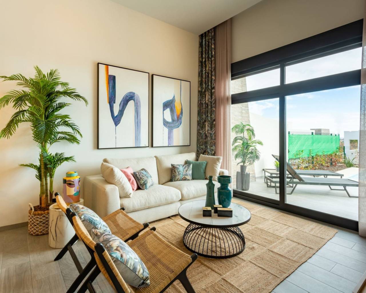 Estas modernas casas adosadas se encuentran dentro del exclusivo La Finca Resort. Diseñadas en una sola planta, cada vivienda cuenta con 3 dormitorios, 2 baños, una cocina contemporánea con barra de desayuno y una luminosa zona de estar con acceso directo al espacio exterior. El exterior ofrece un jardín privado, piscina privada y aparcamiento dentro de la parcela. Las viviendas están equipadas con un sistema de aire acondicionado instalado por conductos, mientras que los baños incluyen espejos y mamparas de ducha completas para mayor comodidad. Los residentes también tienen acceso a un área común con piscina, jardines paisajísticos y una zona de hamacas, creando el entorno perfecto para disfrutar de la vida mediterránea de forma relajada. 1801 - Casa Muestra Futura