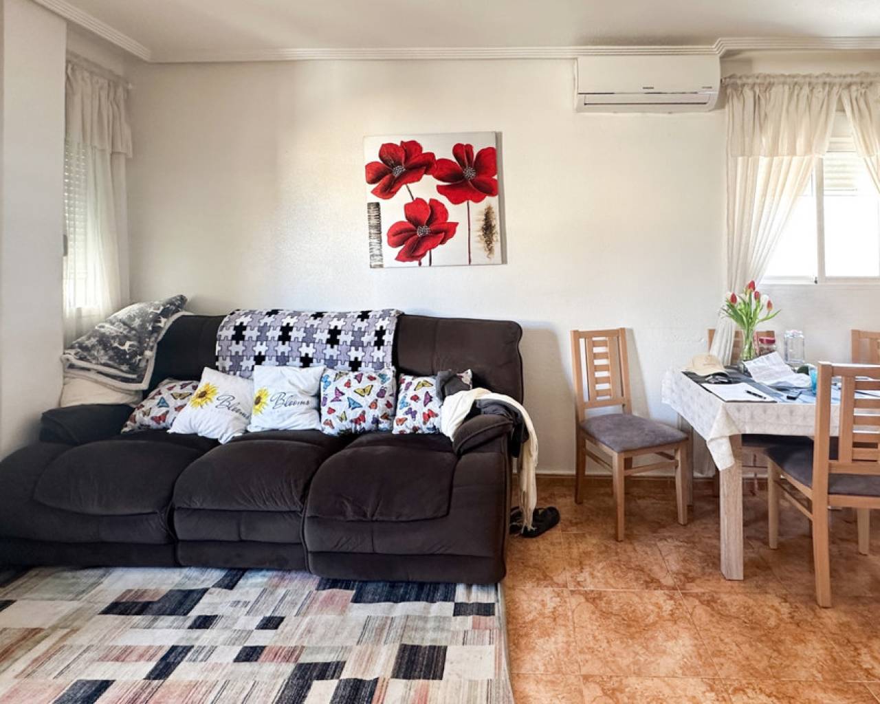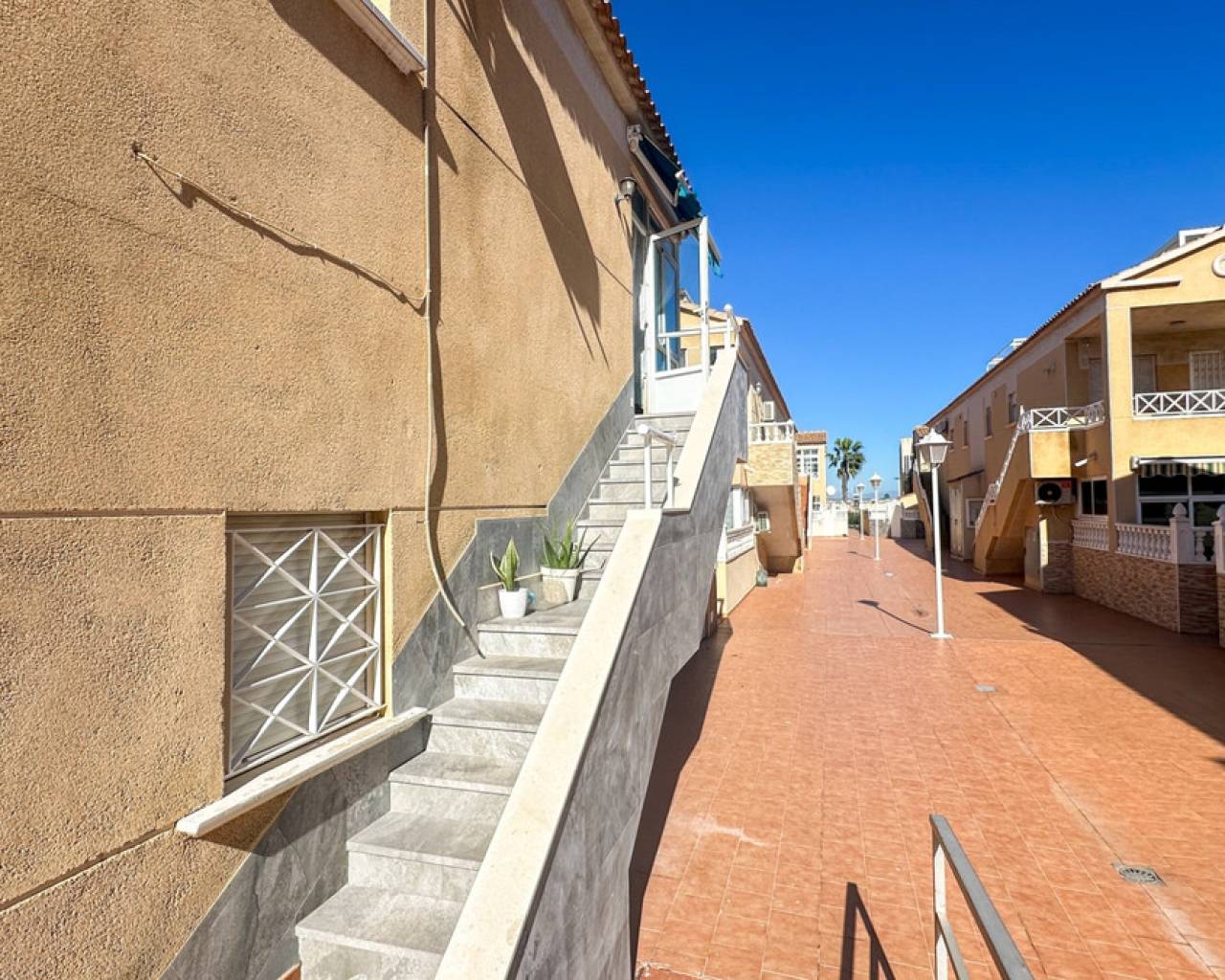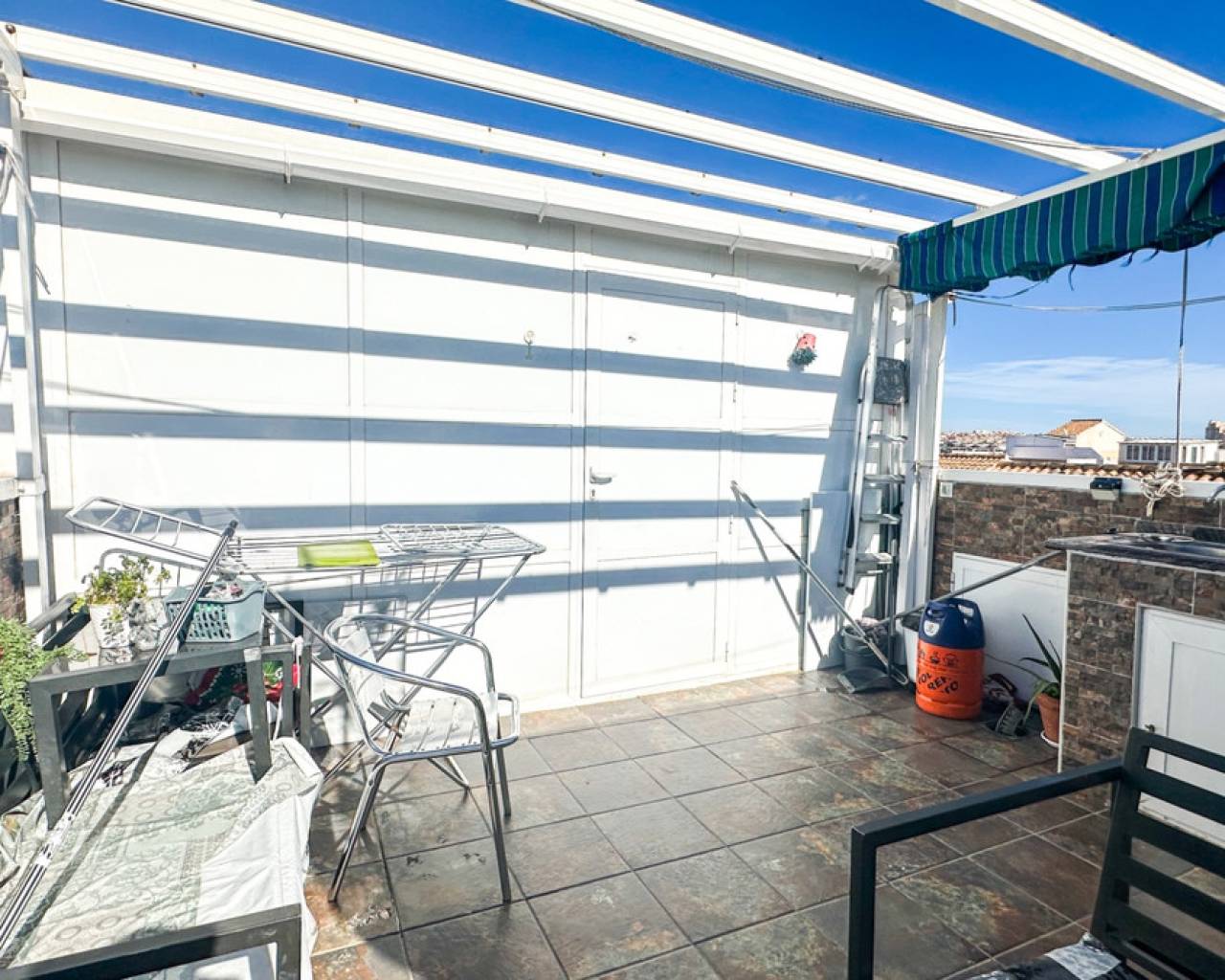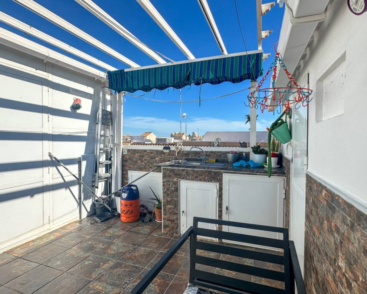 Este encantador bungalow en la planta superior en Torrevieja ofrece una cómoda vida mediterránea en una comunidad bien mantenida.La zona principal de la vivienda cuenta con 2 luminosos dormitorios y 1 baño moderno, junto con una amplia sala de estar y comedor que da acceso a una terraza privada, perfecta para disfrutar del sol.Una de las características más destacadas es el solárium privado, que ha sido mejorado con un dormitorio adicional y un baño, lo que lo convierte en el lugar ideal para recibir invitados, familiares o como un retiro privado. El solárium también ofrece mucho espacio para tomar el sol, comer al aire libre y relajarse.La propiedad forma parte de una comunidad con una hermosa piscina comunitaria, que ofrece un refrescante escape durante los meses más cálidos.También existe la opción de comprar hasta 2 plazas de garaje, que no están incluidas en el precio de venta.Ubicada cerca de servicios locales, playas y enlaces de transporte, este bungalow es perfecto como casa de vacaciones, inversión para alquiler o residencia permanente en la Costa Blanca.
