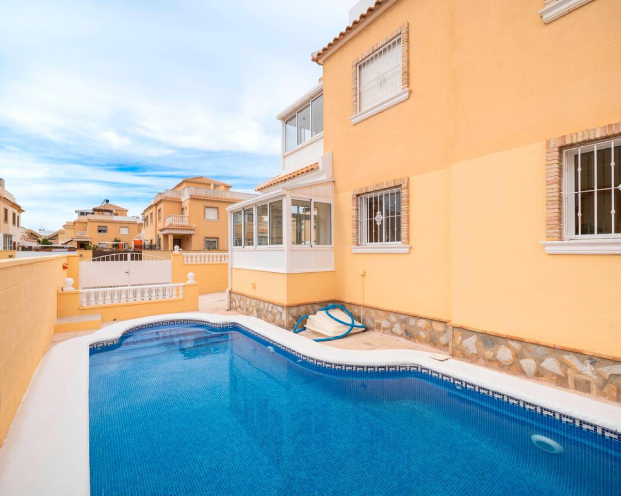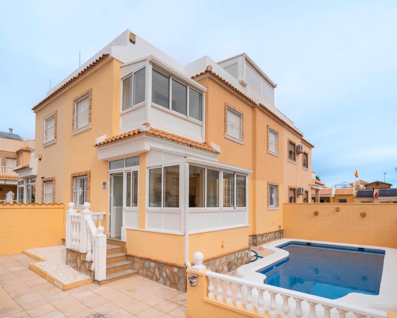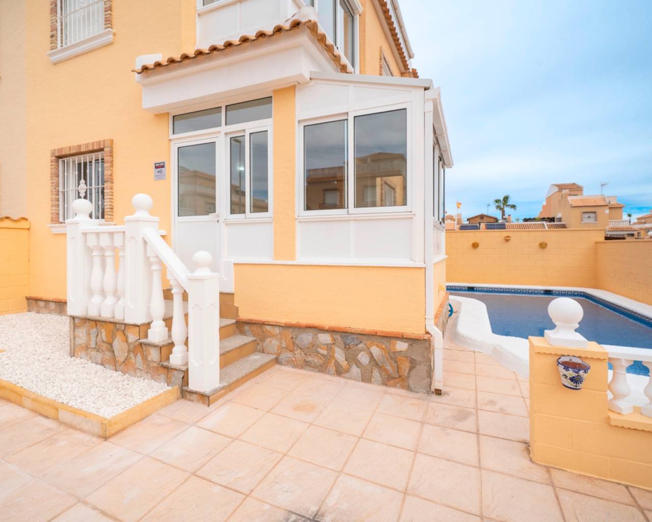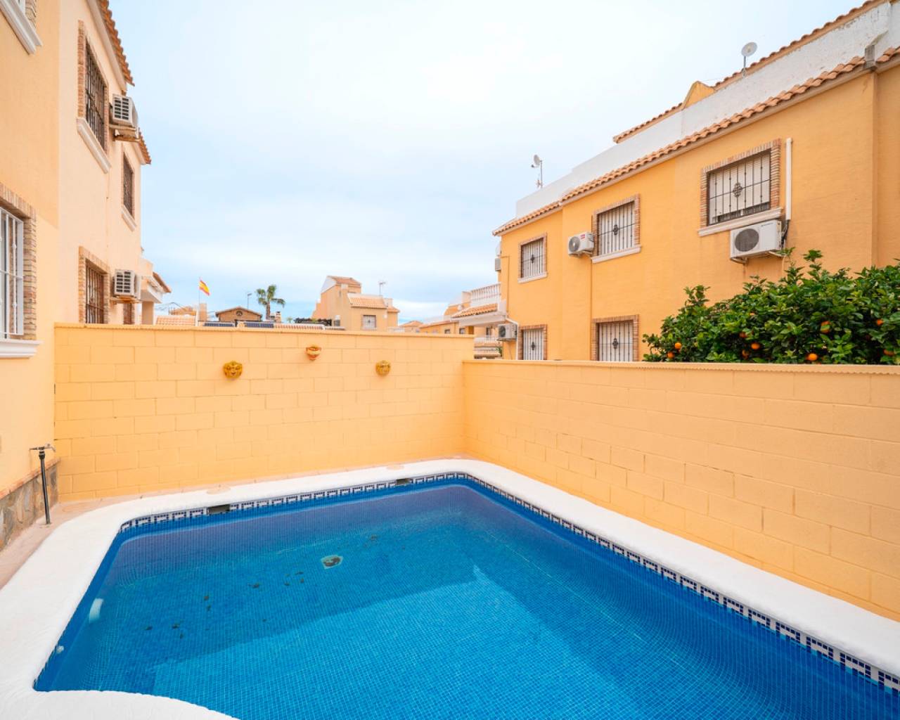 Propiedad distribuida en dos plantas más solárium, ubicada en una parcela privada con jardín y piscina propia, dentro de una urbanización con dos piscinas comunitarias en Ciudad Quesada (Rojales). En la planta de acceso se encuentra la parcela con terraza y piscina privada, un recibidor acristalado, salón-comedor, cocina independiente con mobiliario a estrenar y encimera de mármol negro, y un baño completo. La primera planta dispone de tres dormitorios, el principal con armario empotrado y acceso a una terraza acristalada, además de un segundo baño completo. En la planta superior se ubica un solárium exterior de 25 m² y un espacio acristalado tipo torreón de 8 m², ideal como zona polivalente o trastero. Situada cerca de supermercados, zonas naturales y todos los servicios, a pocos minutos del centro de Rojales y de las playas.