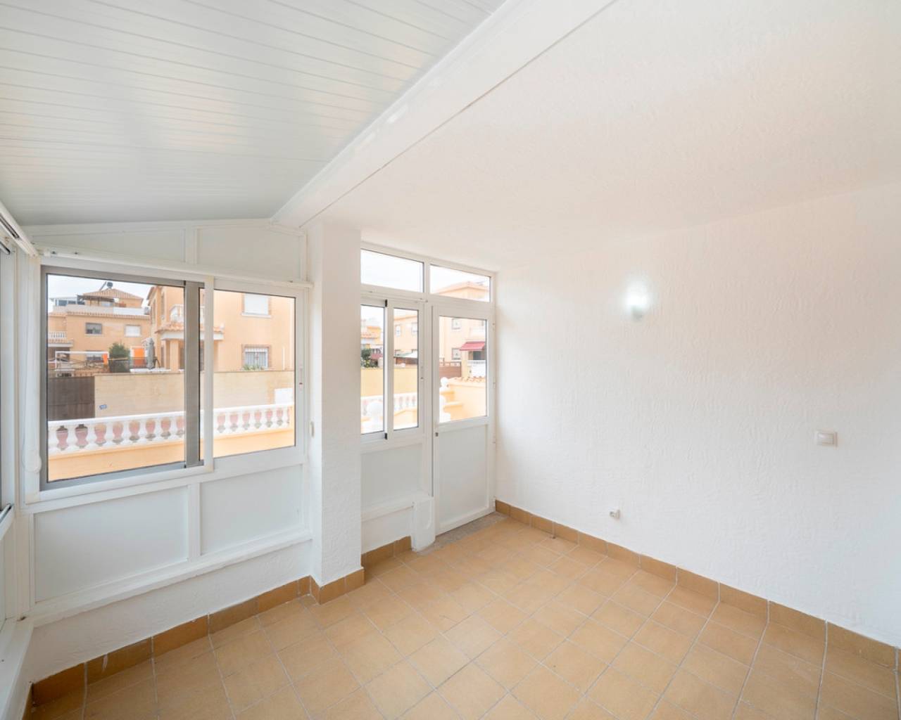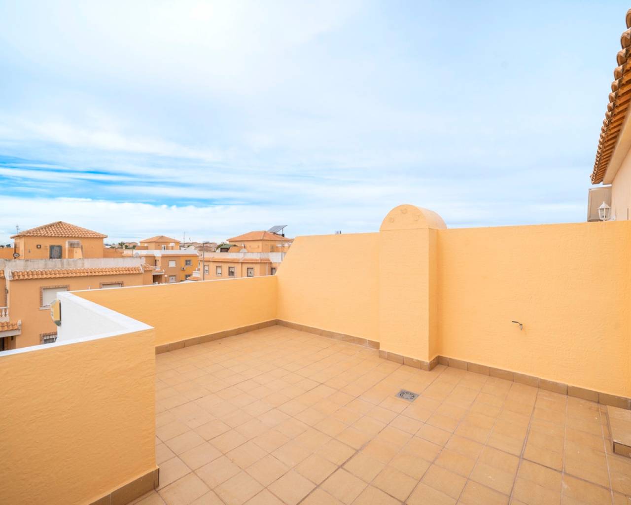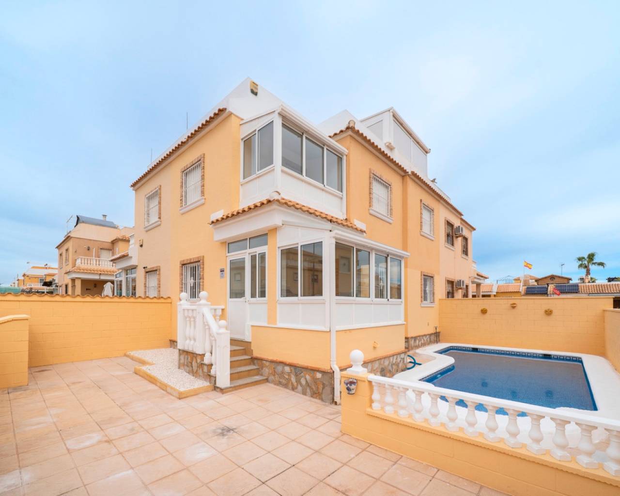 Propiedad distribuida en dos plantas más solárium, ubicada en una parcela privada con jardín y piscina propia, dentro de una urbanización con dos piscinas comunitarias en Ciudad Quesada (Rojales). En la planta de acceso se encuentra la parcela con terraza y piscina privada, un recibidor acristalado, salón-comedor, cocina independiente con mobiliario a estrenar y encimera de mármol negro, y un baño completo. La primera planta dispone de tres dormitorios, el principal con armario empotrado y acceso a una terraza acristalada, además de un segundo baño completo. En la planta superior se ubica un solárium exterior de 25 m² y un espacio acristalado tipo torreón de 8 m², ideal como zona polivalente o trastero. Situada cerca de supermercados, zonas naturales y todos los servicios, a pocos minutos del centro de Rojales y de las playas.