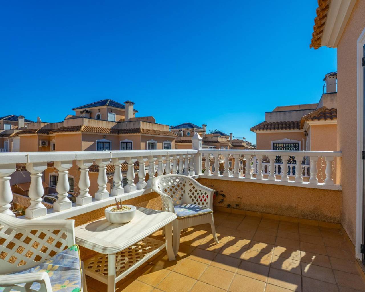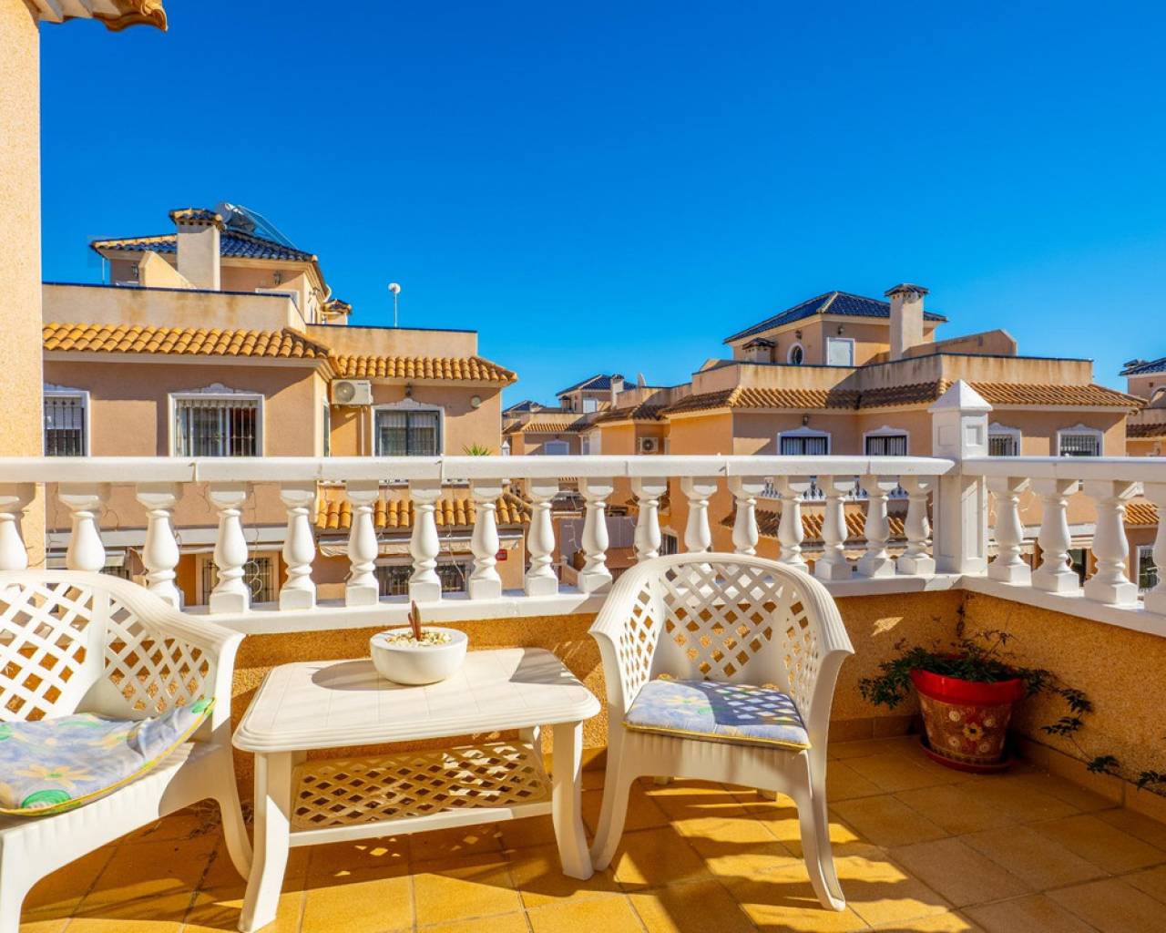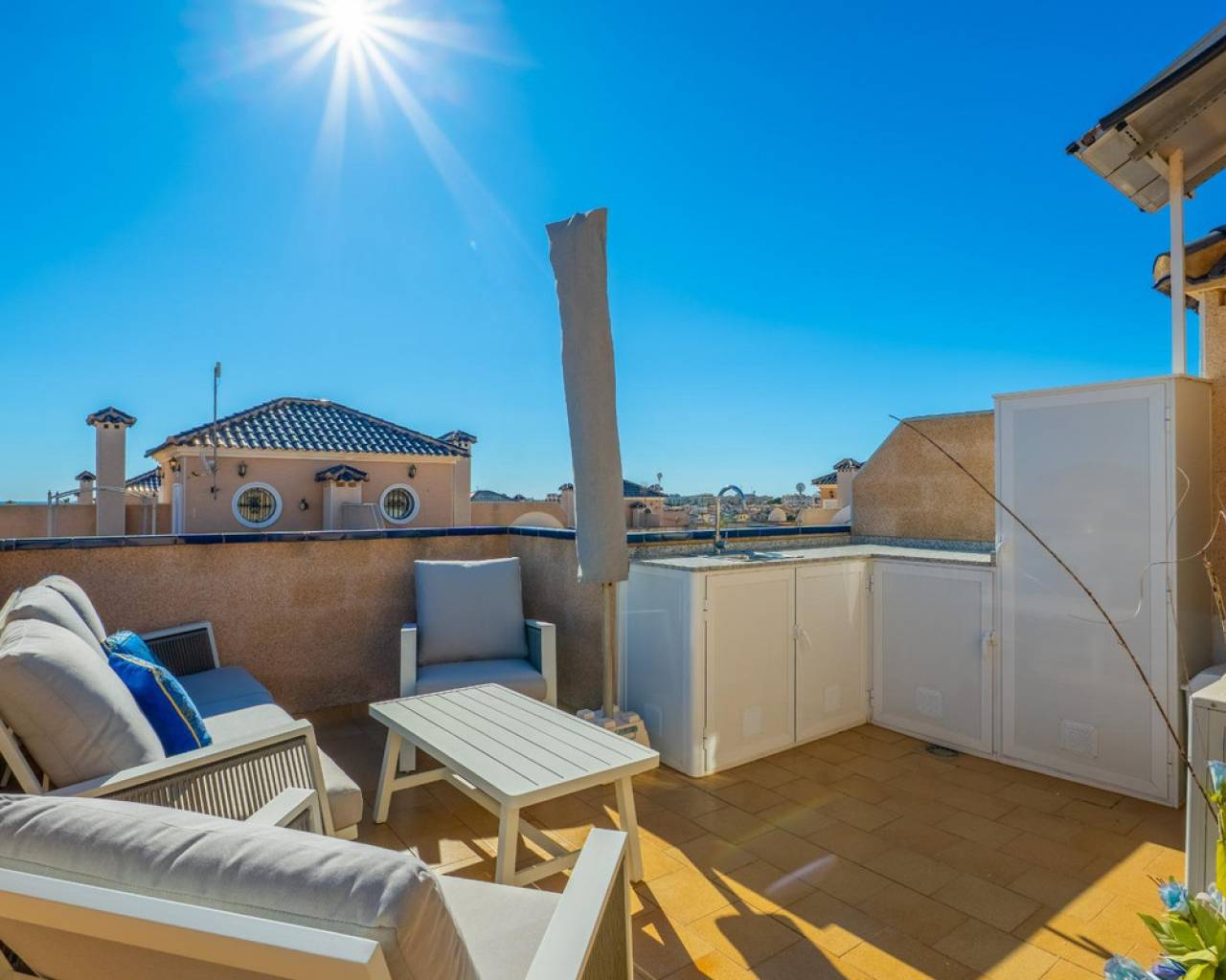 Os presentamos esta encantadora casa dúplex en el Residencial Vista Azul, en Orihuela Costa, una de las zonas más demandadas de la Costa Blanca. Ubicada en un entorno residencial muy valorado, permite disfrutar del clima mediterráneo con tranquilidad y un estilo de vida activo y saludable. La vivienda ofrece una distribución cómoda en dos plantas más solárium. Cuenta con un amplio y luminoso salón amueblado con chimenea, cocina moderna de concepto abierto totalmente equipada, 2 dormitorios y 2 baños completos. Dispone además de una luminosa terraza con zona de descanso y un jardín cuidado con espacio de descanso y aparcamiento dentro de la parcela. Incluye trastero privado. Una cosa por destacar de esta villa son sus placas solares. Se encuentra en Residencial Vista Azul y dispone de piscina comunitaria y zonas ajardinadas. Se encuentra a aproximadamente 1km del mar y a 1700m del Centro Comercial La Zenia Boulevard, con todos los servicios esenciales cercanos: supermercados, restaurantes, tiendas y farmacias. Una ubicación ideal por su tranquilidad, buenas playas y excelente clima, perfecta tanto como residencia habitual como inversión.