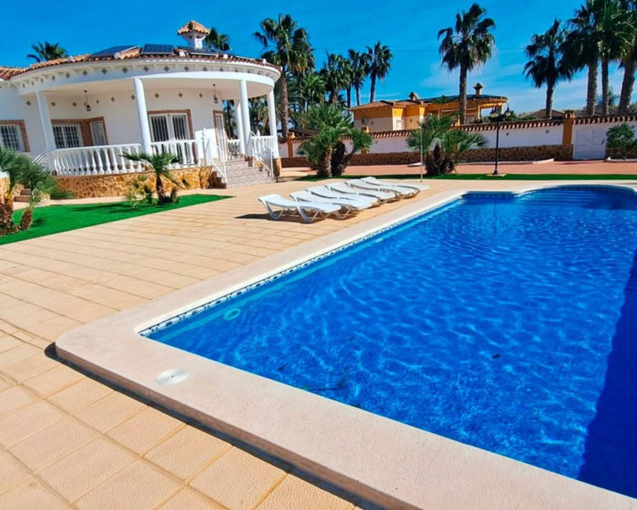 Esta fantástica casa de campo independiente de tres dormitorios en Catral se encuentra en un hermoso campo abierto, ofreciendo tranquilidad, privacidad y un entorno espectacular, a solo 5 minutos en coche del pueblo, con todos los servicios. La propiedad se beneficia de una excelente red de carreteras a lo largo de la costa, con las playas y el campo de golf La Finca a aproximadamente 20 minutos, lo que la convierte en una ubicación ideal en la Costa Blanca Sur. Esta impresionante villa de 163 m² se distribuye en una sola planta y se encuentra en una parcela de 2.329 m² con un hermoso jardín y completamente amurallada. El interior cuenta con un exclusivo salón curvo con aire acondicionado y chimenea, además de dos puertas acristaladas que se abren a una terraza cubierta, perfecta para disfrutar de la vida interior y exterior. La cocina americana equipada incluye una barra americana y una puerta que da al exterior, mientras que un amplio arco conduce a una zona versátil que puede utilizarse como comedor o zona de estar adicional. Hay tres dormitorios dobles, todos con armarios empotrados, además de un baño familiar y dos aseos con ducha, uno de ellos en suite. En el exterior, la propiedad ofrece acceso a un solárium privado donde podrá disfrutar de vistas panorámicas al campo, además de contar con paneles solares. La amplia parcela está diseñada para facilitar el mantenimiento, con zonas pavimentadas, zonas de césped artificial y palmeras maduras. Una gran piscina privada de 10 x 5 ofrece el espacio perfecto para relajarse y disfrutar, mientras que hay un amplio aparcamiento exterior y un garaje para dos coches con espacio de almacenamiento adicional. La villa cuenta con agua corriente y electricidad, un sistema de reserva de agua y cuatro paneles solares, lo que mejora la eficiencia y la sostenibilidad. Esta excepcional propiedad rural combina espacio, comodidad y tranquilidad, convirtiéndola en la residencia permanente perfecta o un refugio de lujo en el corazón de la Costa Blanca Sur.