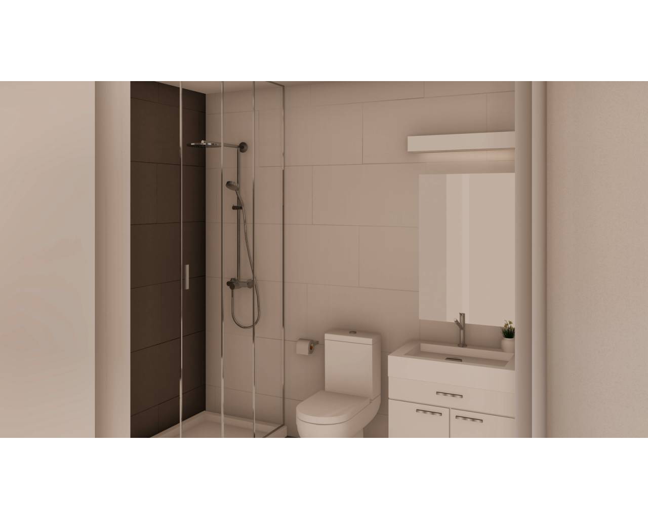 • Baños completos con muebles, espejos con luz, ducha efecto lluvia y mamparas correderas.