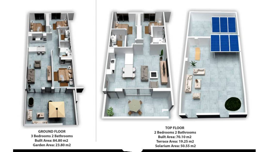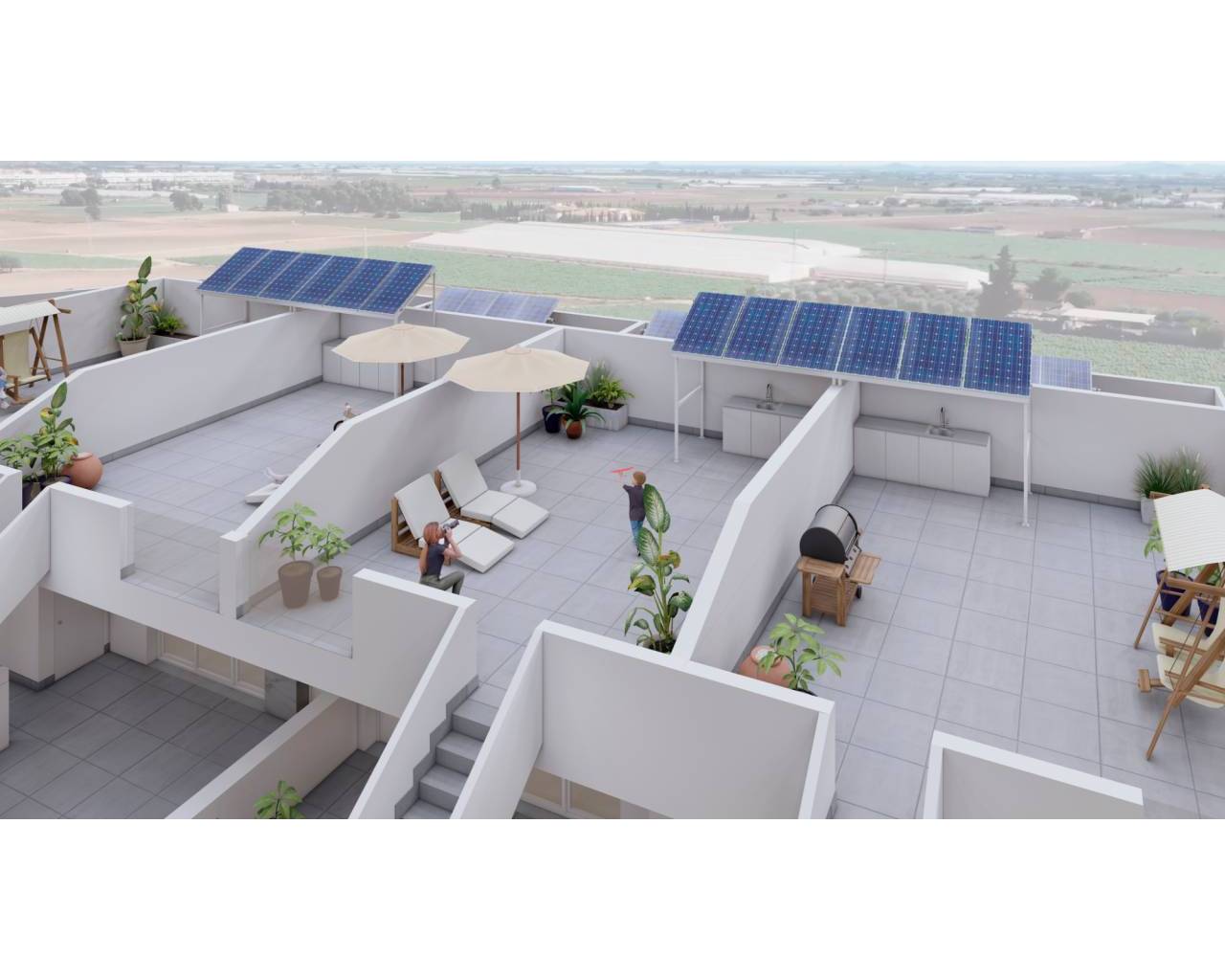 • Terraza en planta baja y solárium con cocina de verano en planta superior.