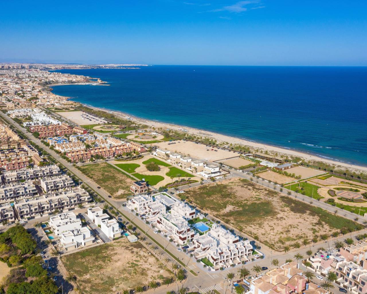 La nueva promoción está situada en segunda línea de la Playa de las Higuericas, en Torre de la Horadada. Se compone de Dúplex, Bungalow y Apartamentos de estilo moderno con un toque exclusivo. Todas las viviendas disponen de parking, amplias terrazas, zonas verdes y piscina comunitaria.
