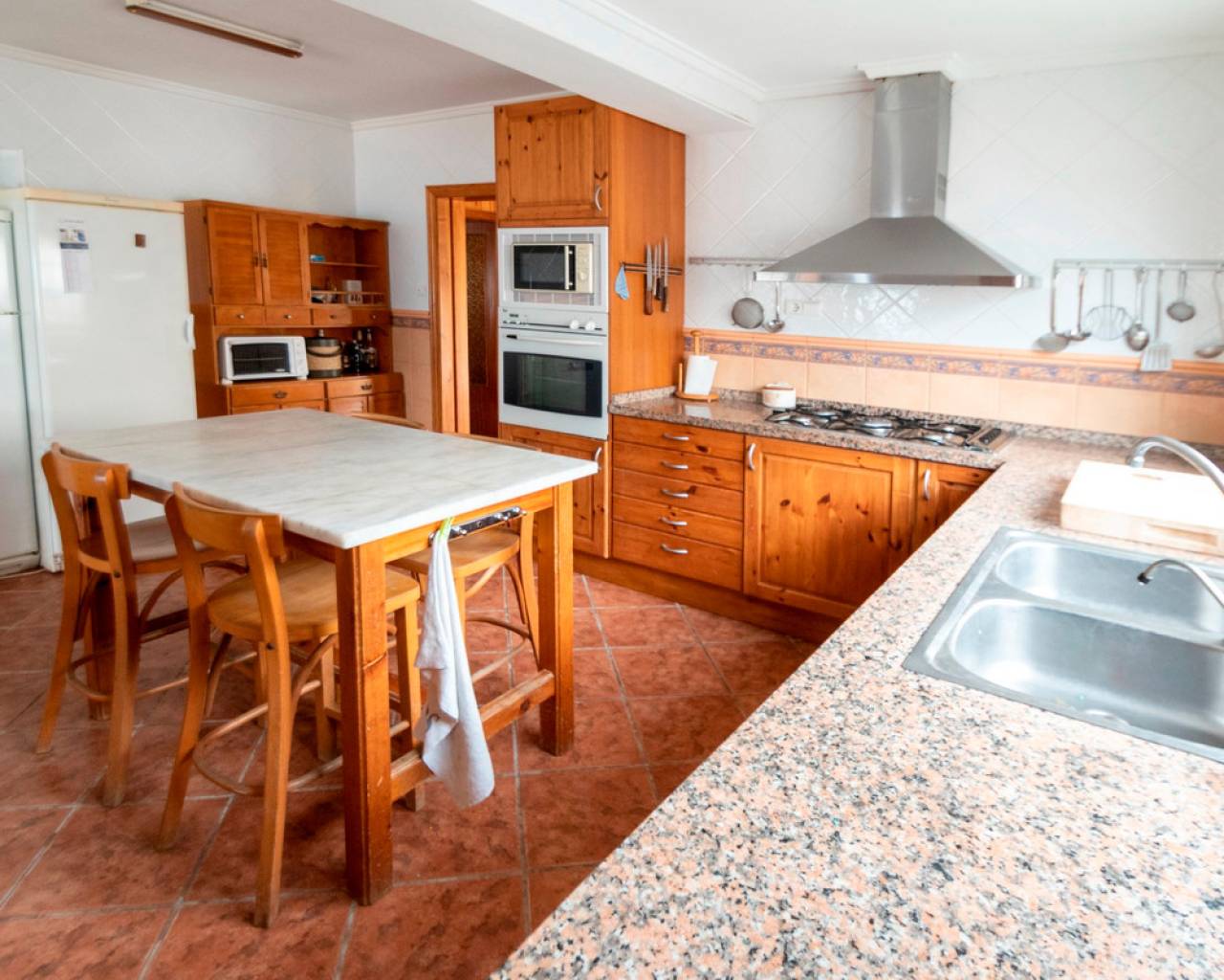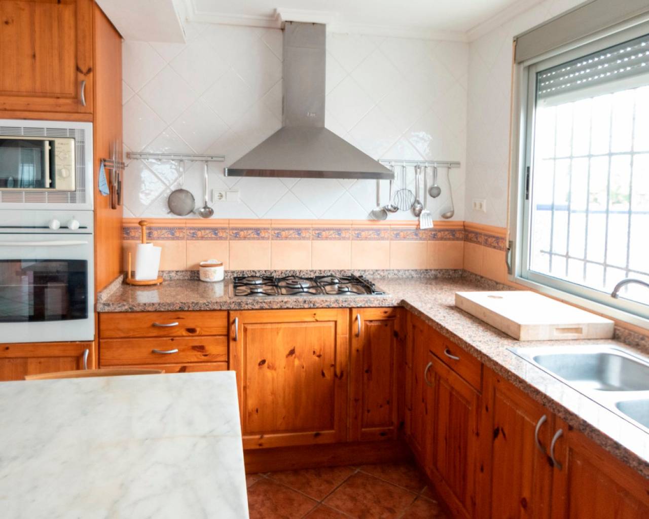 Con el interior de madera, esta casa con diseño mediterráneo te transportará a un entorno de lo más tranquilo y agradable. Encontramos la zona de día a la derecha, con una amplísima cocina-comedor donde podrás cocinar tus platos favoritos. Dispone también de una amplia despensa.