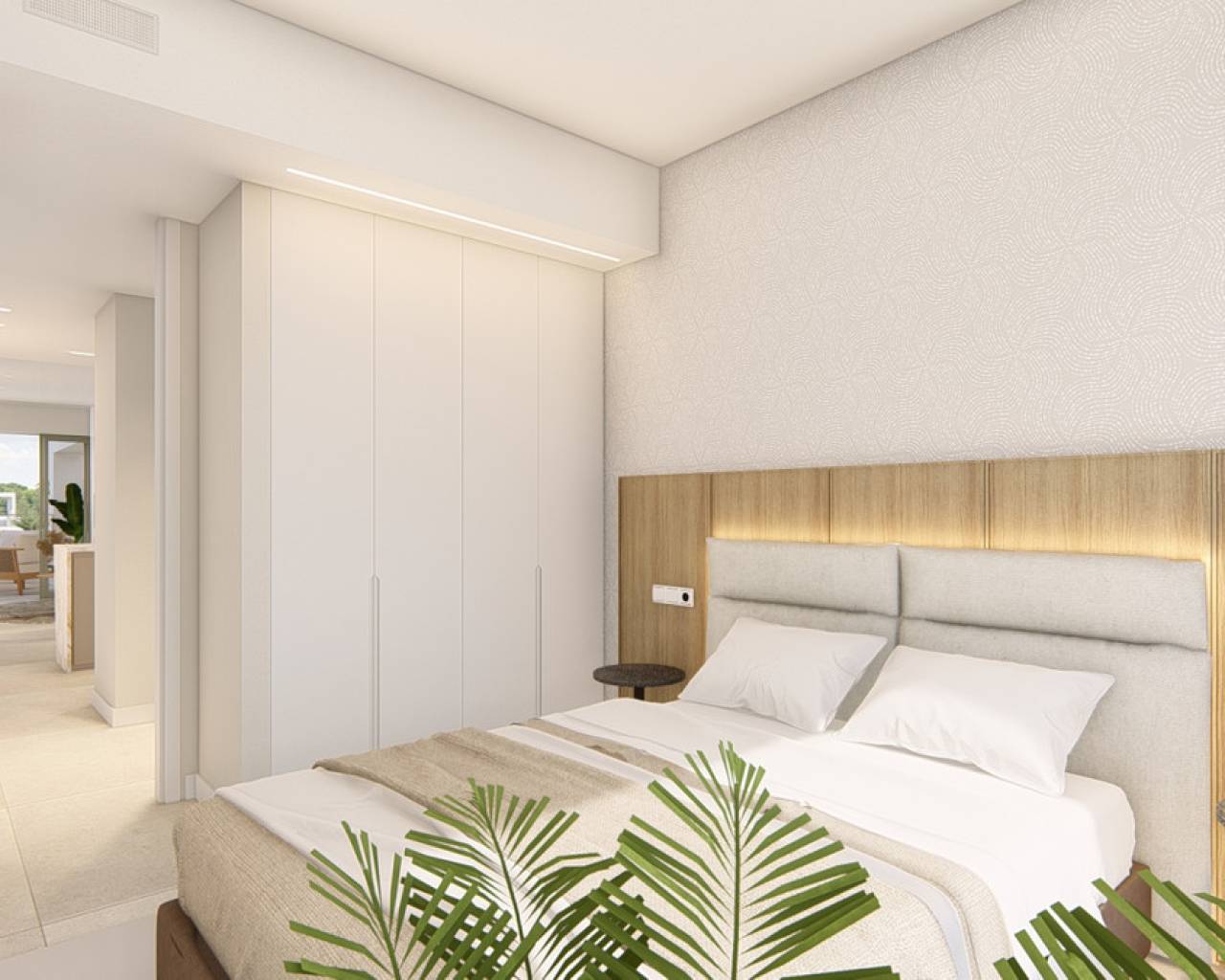 El desarrollo está compuesto por viviendas pasantes, es decir, con doble fachada, lo que permite una ventilación cruzada que facilita la aireación de las viviendas, logrando así frescor natural en verano y, por lo tanto, proporcionando un ahorro significativo en aire acondicionado. Además, gracias a la orientación este-oeste de las viviendas, se consigue un excelente confort térmico en invierno, ahorrando calefacción durante esta época del año. Si a todo esto sumamos el uso de energía aerotérmica para el agua caliente sanitaria, se produce la utilización de energías renovables en todas las viviendas. Todo ello, combinado con la alta calidad del aislamiento realizado en las viviendas, junto con la carpintería de aluminio y los acristalamientos utilizados, optimiza un gran confort térmico, gracias al cual apenas será necesario el consumo eléctrico para lograr bienestar en el interior de la vivienda. DESTACADOS Cocina totalmente equipada, incluidos los electrodomésticos. Mosquiteras y mobiliario de baño incluidos. Persianas motorizadas en ventanas. Iluminación general en todas las estancias ya incorporada. Instalación de aire acondicionado por conductos, incluida la máquina de AC. En el solárium: ducha exterior, zona reforzada con preinstalación para jacuzzi.