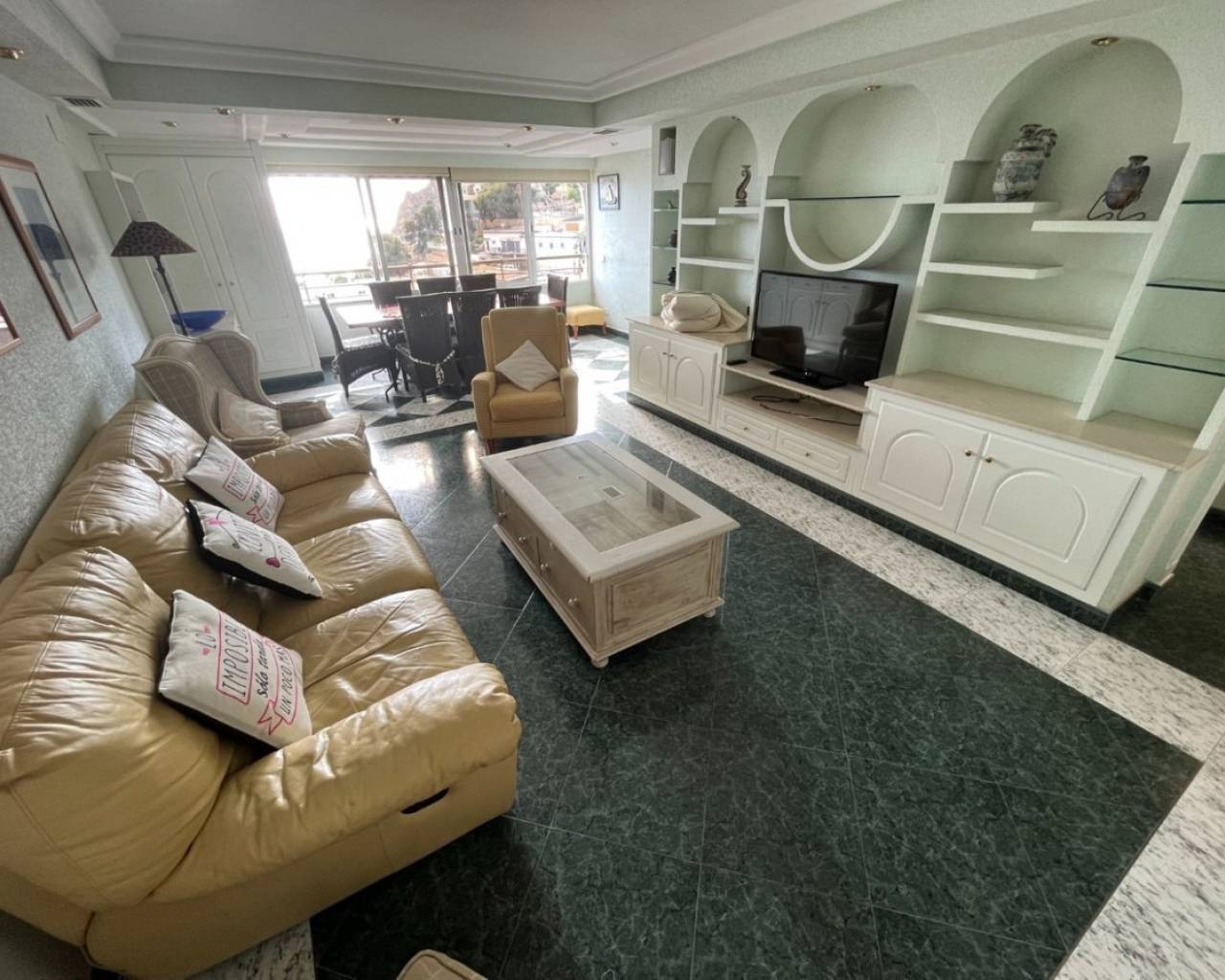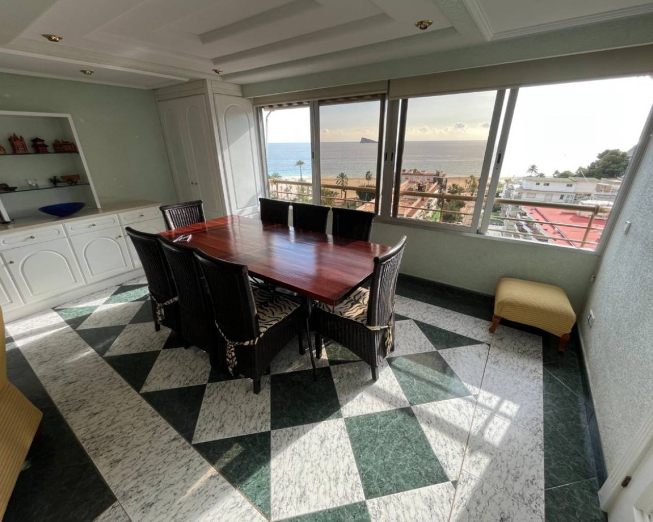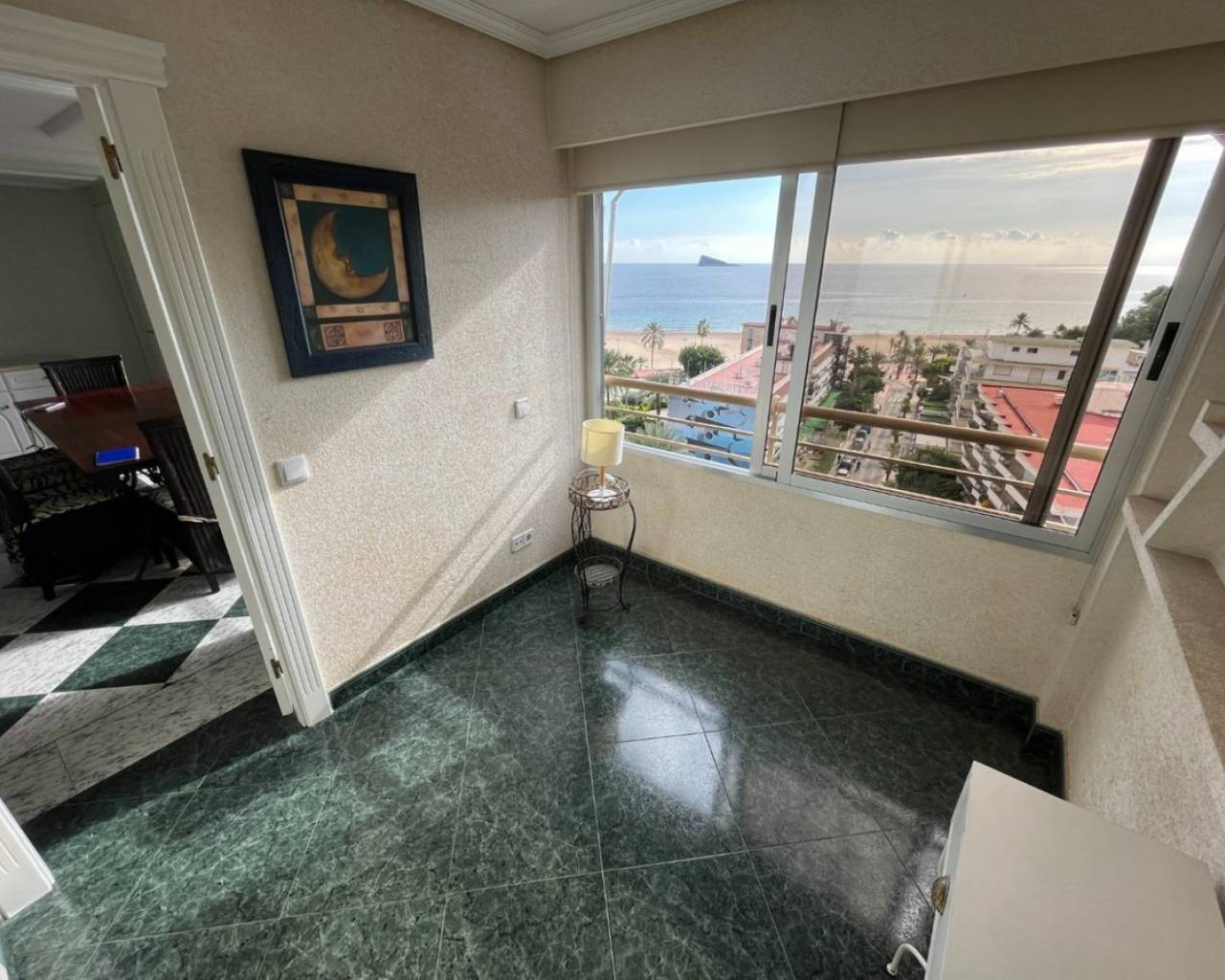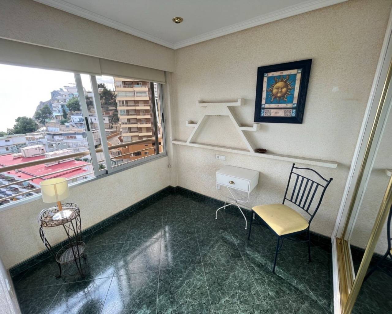 Gran Apartamento a solo 80 metros de la playa de Poniente de Benidorm, con excepcionales vistas al mar.Incluye 3 dormitorios, 2 baños, amplio salón-comedor y cocina independiente equipada. Fue reformado hace ya varios años, entro otras cosas incorporando la terraza original a la vivienda, pero se conserva en muy buen estado.Está construido con buenos materiales como: pavimentos de gres, carpintería interior lacada en blanco, cocina amueblada con electrodomésticos, armarios empotrados, aire acondicionado frío-calor por conductos, etc.Ubicado en la planta 8 de una conocida urbanización de la Playa de Poniente, con zonas comunes y ascensores recientemente renovados, dos pistas de tenis, una pista de baloncesto, piscina comunitaria y aparcamiento cubierto en superficie de libre disposición.Situado en la Playa de Poniente, en su extremo mas cercano a La Cala, bien comunicado por carretera, autobús en la puerta, y rodeado de todo tipo de comercios y servicios. Con fácil acceso a la autopista AP7 que comunica con el resto de la Costa Blanca.
