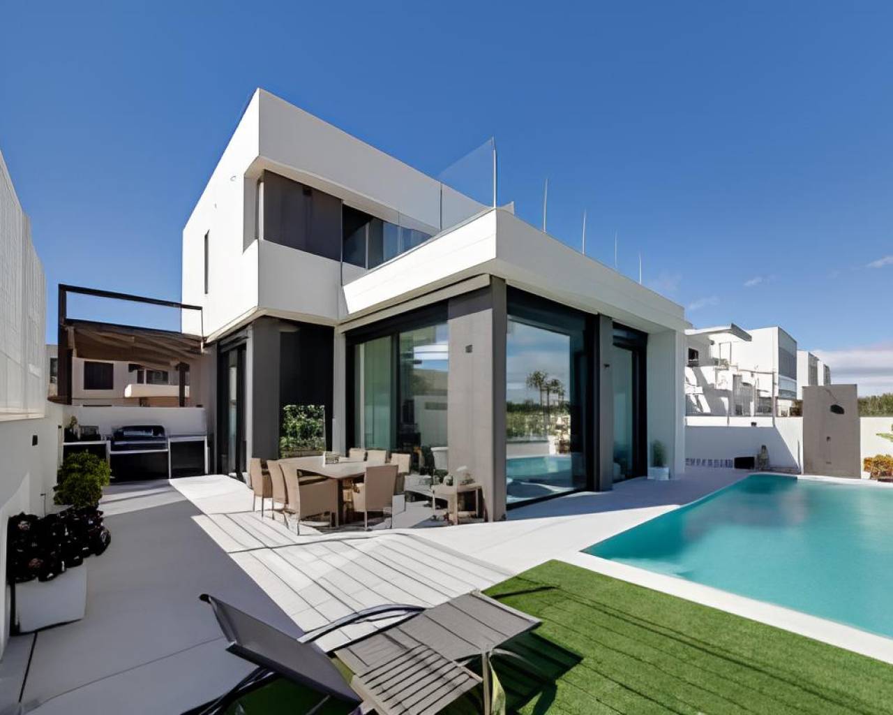 Exclusividad y armonía en plena naturaleza Esta promoción es una exclusiva promoción residencial ubicada en Pilar de la Horadada, Alicante, diseñada para fusionar lujo, confort y seguridad en un entorno natural inigualable. Cada una de las villas ofrece características de alta calidad, como puertas acorazadas para garantizar la seguridad, suelos porcelánicos, persianas motorizadas, y una eficiente climatización para maximizar el confort. Además, las cocinas están equipadas con electrodomésticos de última generación y los exteriores están cuidadosamente paisajizados con vegetación autóctona, todo ello dentro de un diseño arquitectónico moderno que asegura eficiencia energética y una estética de lujo. Esta promoción representa el equilibrio perfecto entre la innovación y la armonía con la naturaleza, ofreciendo un espacio idílico para vivir.