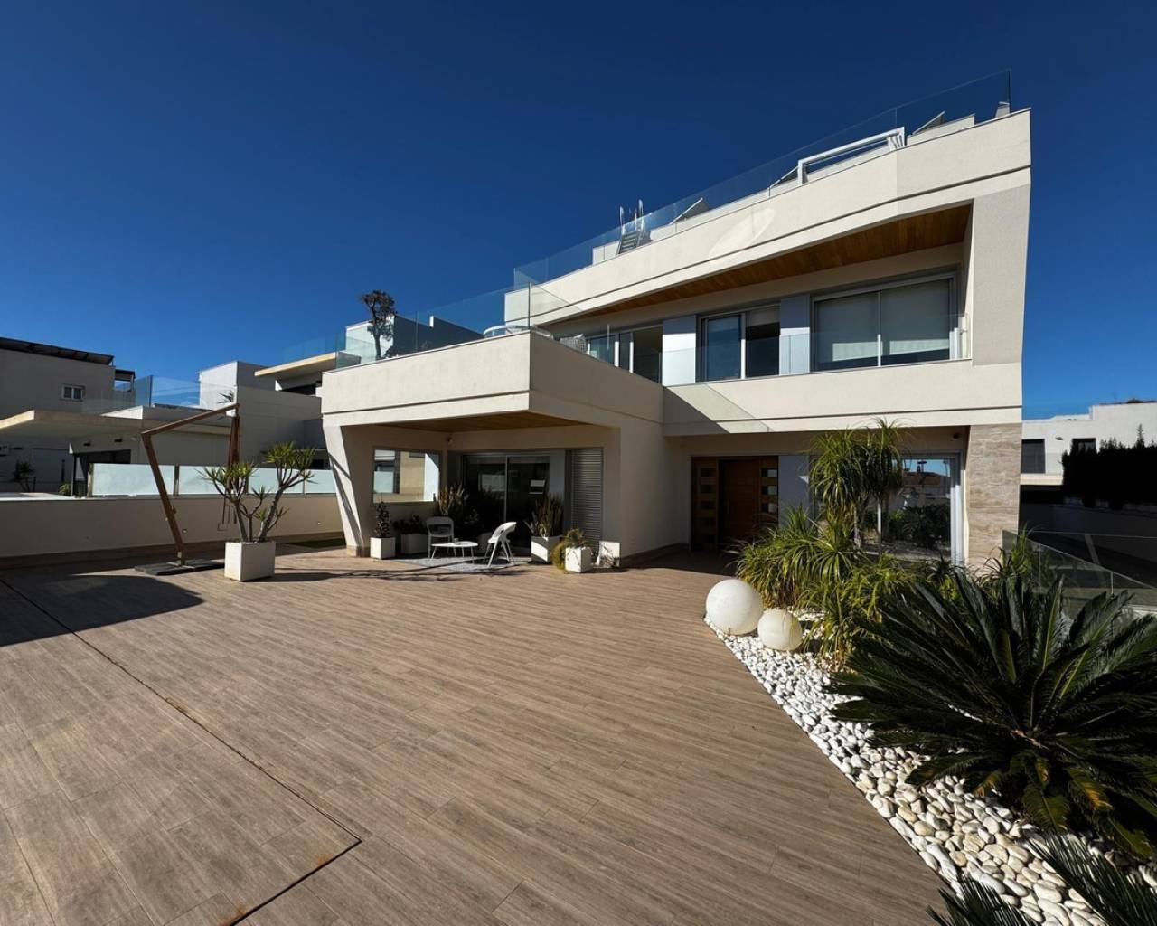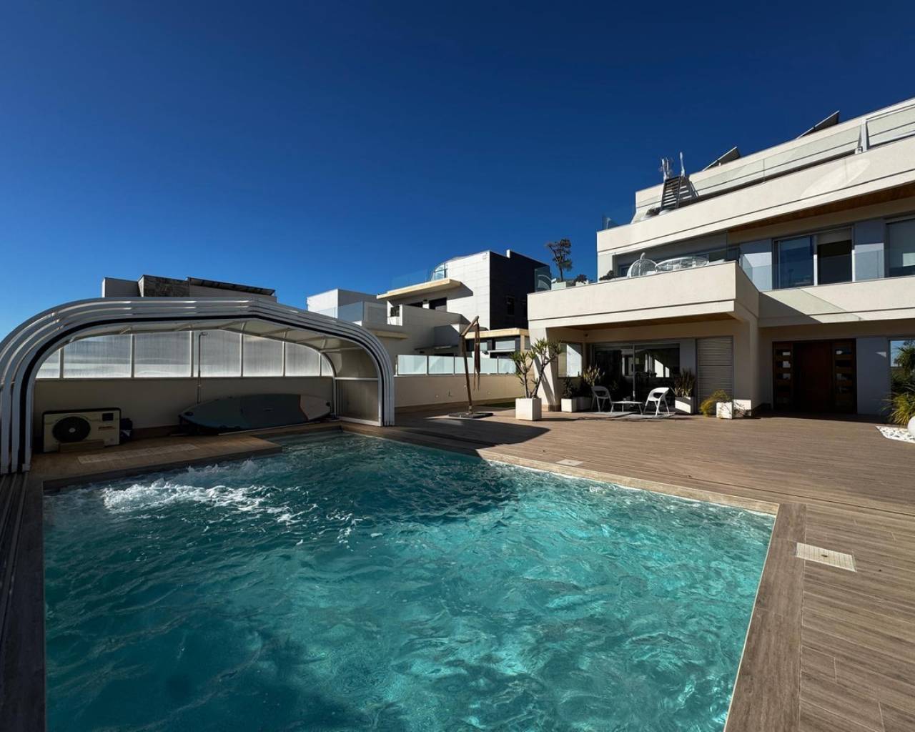 Se ofrece en venta una villa moderna y lujosa con vistas panorámicas al mar, situada en una de las zonas más exclusivas. Una propiedad diseñada para quienes valoran el espacio, la privacidad, el confort y la alta calidad en cada detalle.???? Características principales•Superficie total de la vivienda: 349 m²•Superficie útil: 230 m²•Parcela: 503 m²•Año de construcción: 2019•Distribución: 4 dormitorios•Baños: 6•Ascensor: sí•Garaje: 105 m² (amplio, cerrado)•Lavandería: independiente•Hammam: instalado•Aire acondicionado: centralizado•Piscina: privada•Distancia a la playa: 200 metros???? Zonas exteriores y vistas•Impresionantes vistas al mar desde varias estancias•Solárium privado con vistas panorámicas•En el solárium se encuentra una cocina de verano, perfecta para disfrutar de reuniones y del clima mediterráneo???? DescripciónLa villa destaca por su diseño contemporáneo, sus amplios espacios, techos altos y una distribución muy funcional.Acabados de alta calidad y ambiente luminoso en todas las estancias.El ascensor ofrece acceso cómodo a todos los niveles.La piscina privada, el gran garaje y el hammam aportan un plus de exclusividad y bienestar.Una propiedad excepcional, ideal para vivir o como residencia vacacional, ubicada a tan solo 200 metros del mar, con vistas inmejorables y todas las comodidades de una vivienda de alto nivel.