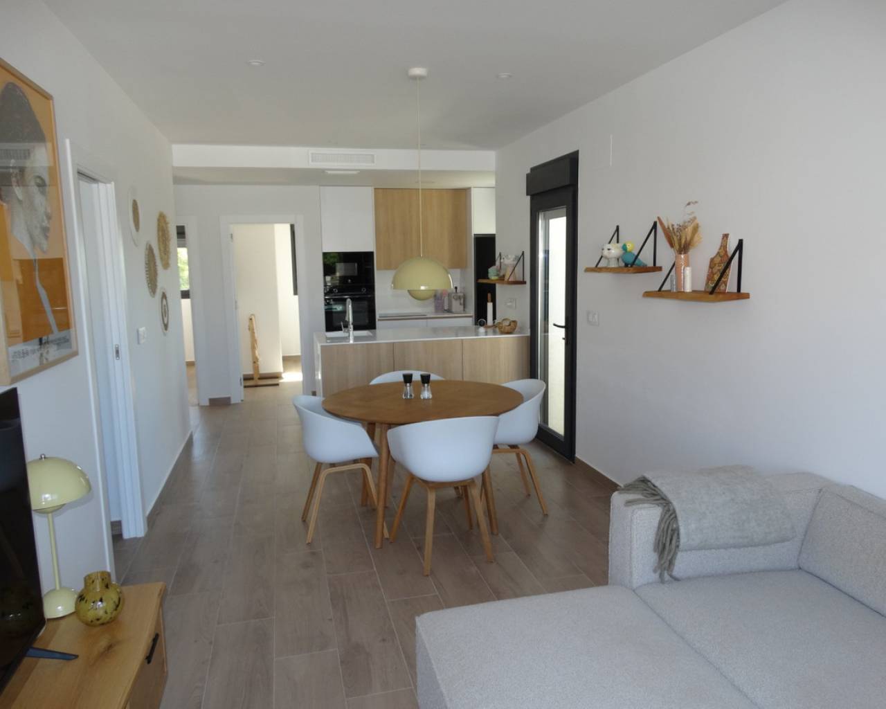 Ce superbe appartement d'angle de trois chambres, situé au premier étage d'un immeuble moderne à Pilar de la Horadada, se trouve en périphérie de la ville. La rue principale, avec ses supermarchés, boutiques, cafés et restaurants, est accessible en seulement 10 minutes à pied. La magnifique plage de Torre de la Horadada est à 10 minutes en voiture, tandis que les routes N332 et AP7 offrent d'excellentes liaisons le long de la côte. Orihuela Costa, et notamment le centre commercial La Zenia Boulevard, est à environ 10 minutes, et le golf de Lo Romero à seulement 5 minutes en voiture. Situé dans un élégant complexe construit en 2022 et organisé autour d'une belle piscine commune, l'appartement offre un espace de vie lumineux et ouvert avec des portes-fenêtres coulissantes donnant sur la terrasse. La cuisine moderne et équipée s'intègre parfaitement au séjour, créant un agencement contemporain et convivial. L'appartement comprend trois chambres doubles, toutes avec placards intégrés, dont une suite parentale avec terrasse privative et salle de douche attenante, ainsi qu'une salle de douche familiale séparée. L'accès extérieur mène à un impressionnant solarium privé de 80 m², comprenant une douche extérieure, un coin repas couvert, un espace barbecue et une pelouse synthétique : l'endroit idéal pour se détendre ou recevoir tout en profitant de la vue sur la piscine commune. La propriété bénéficie également d'un parking commun. Parmi les autres atouts, citons la climatisation Airzone et quatre panneaux solaires, pour un confort optimal et une efficacité énergétique accrue. Une superbe maison moderne, idéalement située pour savourer pleinement le style de vie méditerranéen sur la Costa Blanca Sud.