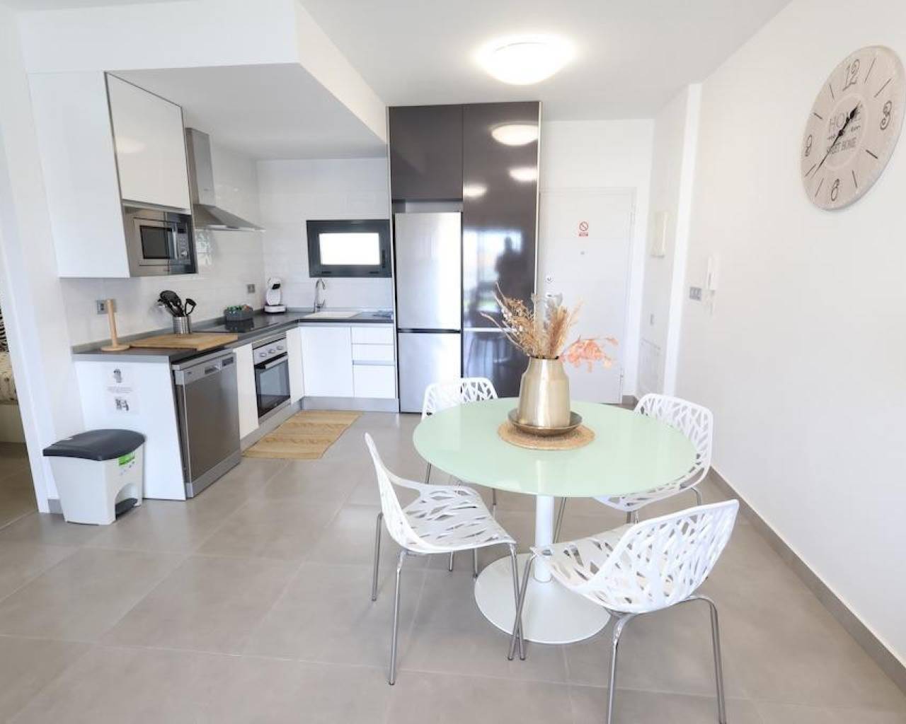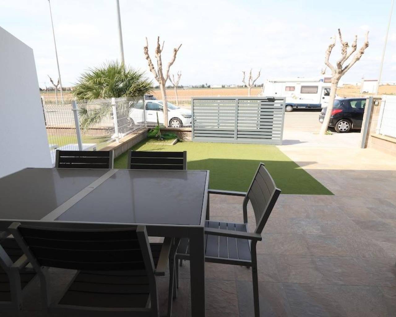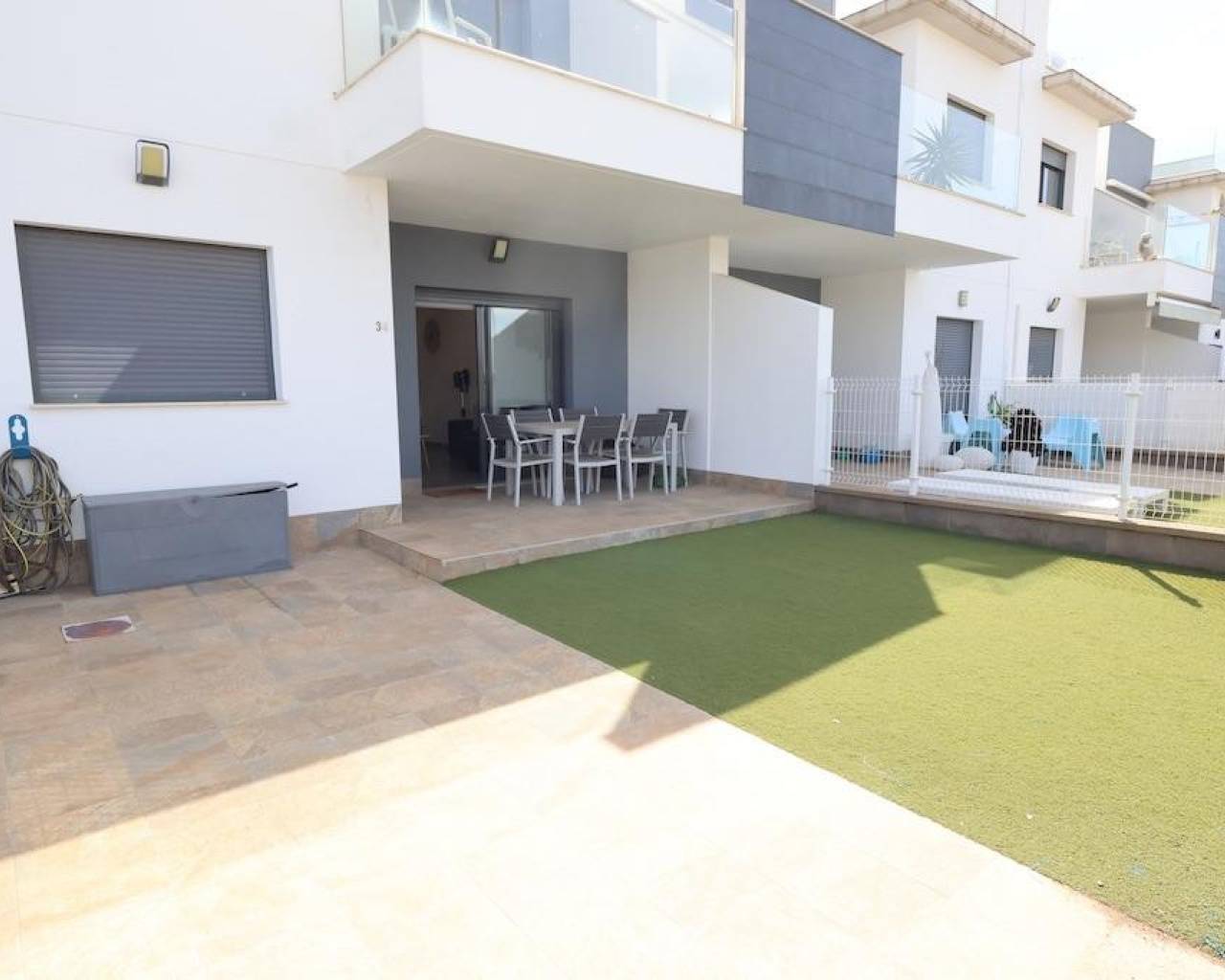 La Mar Fase III, Pilar de la Horadada, Bungalow en planta baja de 70 m2 con 2 dormitorios, 1 baño, amplio salón comedor con cocina incorporada al salón, terraza y un jardin enlosado de 30 m2 con entrada para el coche, la vivienda se vende amueblada con aire acondicionado central por conductos, el residencail cuenta con piscina comunitaria.