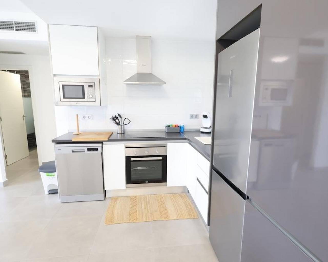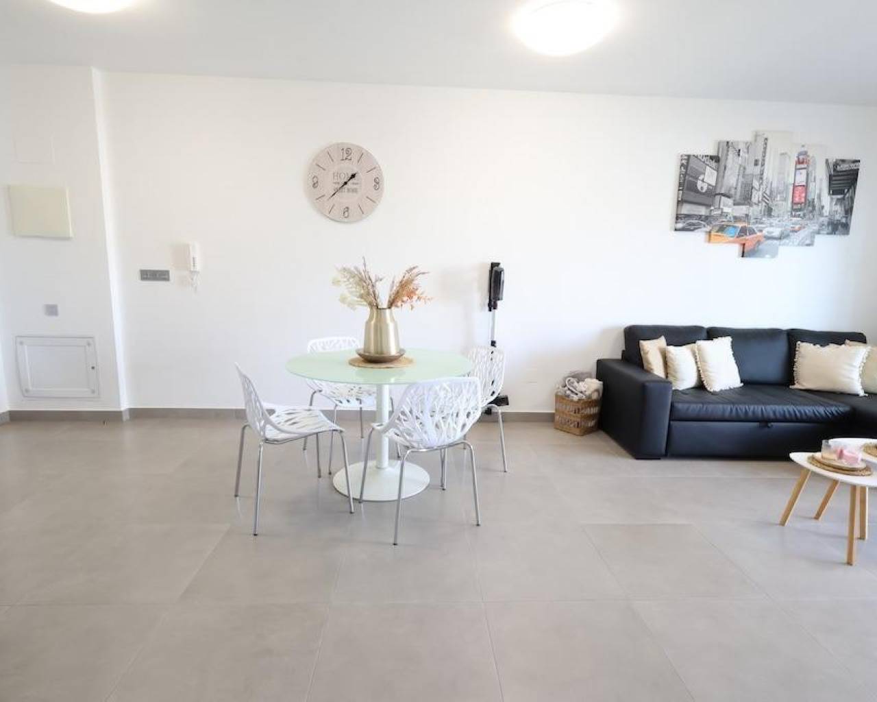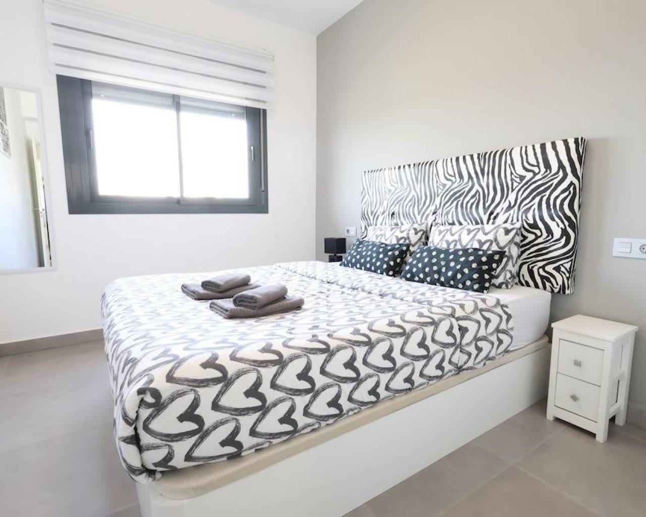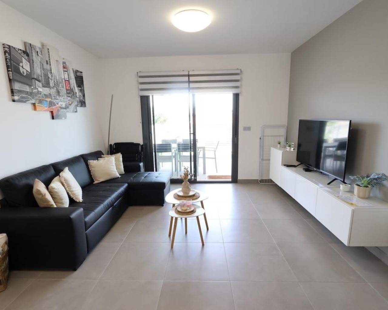 La Mar Fase III, Pilar de la Horadada, Bungalow en planta baja de 70 m2 con 2 dormitorios, 1 baño, amplio salón comedor con cocina incorporada al salón, terraza y un jardin enlosado de 30 m2 con entrada para el coche, la vivienda se vende amueblada con aire acondicionado central por conductos, el residencail cuenta con piscina comunitaria.