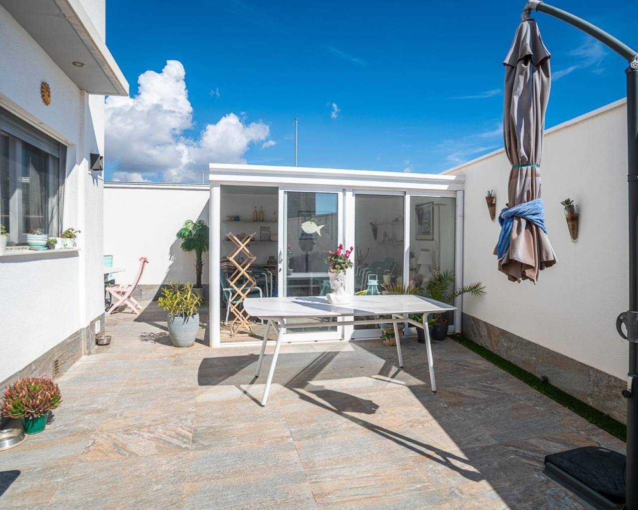 Déjese seducir por el encanto de esta lujosa villa en Pilar de la Horadada , donde la comodidad, el estilo y una ubicación inmejorable se unen. Nada más visitar esta propiedad, sentirá la relajada atmósfera mediterránea: un lugar donde solo tendrá que traer sus maletas. En la planta baja , encontrará una sala de estar amplia y luminosa con una cocina abierta totalmente equipada que se integra a la perfección con el acogedor salón-comedor. Además, aquí encontrará un dormitorio y un baño , lo que aumenta aún más la comodidad diaria. La primera planta cuenta con dos amplias habitaciones dobles, una de ellas principal con baño privado. Desde estas habitaciones se accede a una gran terraza , ideal para disfrutar del sol durante todo el día. Además, dispone de un solárium con cocina exterior , el lugar perfecto para pasar largas veladas con familiares y amigos. En el exterior, esta villa también está totalmente equipada para disfrutar del clima mediterráneo. El precioso jardín cuenta con una acogedora zona de descanso y una piscina privada con jacuzzi , donde podrá relajarse con total privacidad. Además, se ha creado un espacio cubierto adicional que puede servir perfectamente como casa de huéspedes, sala de ocio o zona de estar extra . Asimismo, hay un práctico trastero detrás de la cocina, ideal para guardar cosas. La vivienda está acabada con materiales de alta calidad y excelentes prestaciones , entre las que se incluyen armarios empotrados, aire acondicionado, calefacción por suelo radiante, ventanas de aluminio con doble acristalamiento Climalit, puertas interiores de madera y elegantes suelos de gres . Además, su ubicación es especialmente conveniente: a tan solo 50 metros de Mercadona y a unos 2 kilómetros de la playa , lo que permite tener todos los servicios y la costa al alcance de la mano. Esta villa representa una oportunidad única para aquellos que desean disfrutar del lujo, la comodidad y el estilo de vida mediterráneo en la Costa Blanca. ¿Le interesa esta preciosa villa? Contáctenos hoy mismo para obtener más información o programar una visita. Quizás pronto sea su nuevo hogar bajo el sol español.