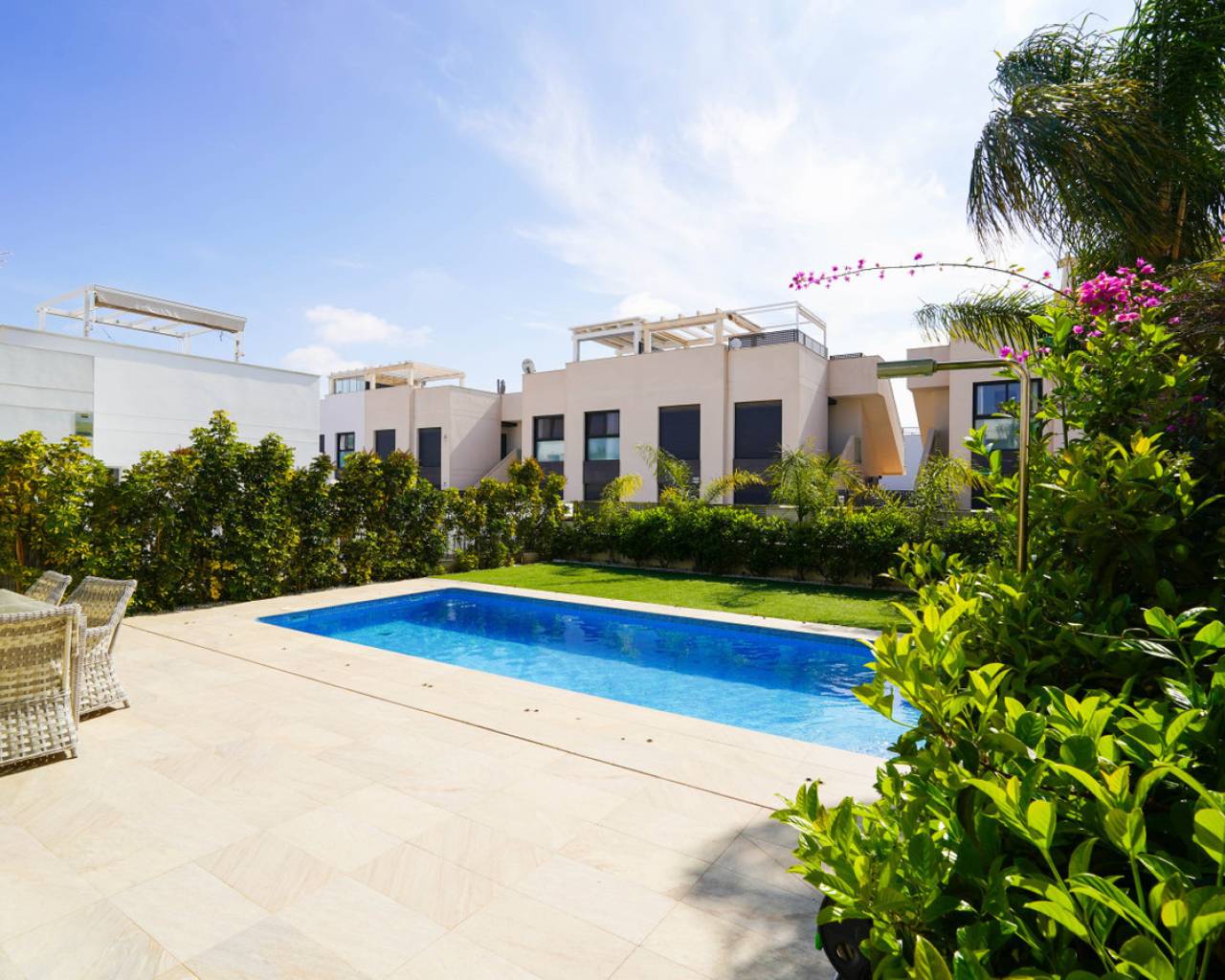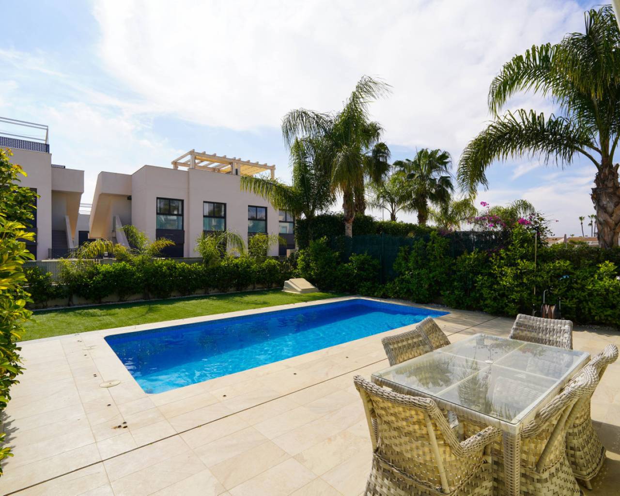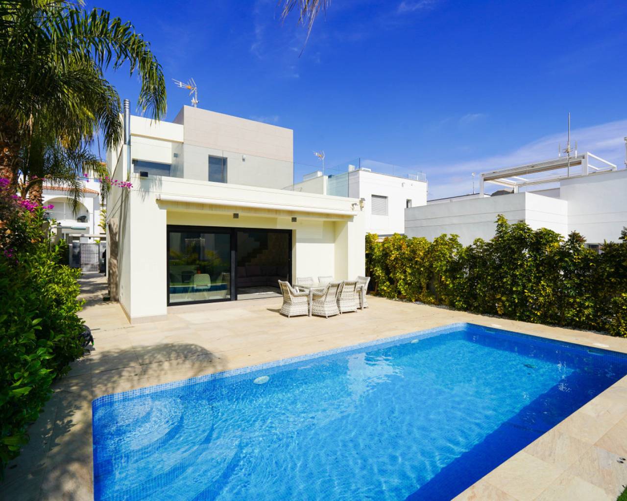 Este magnífico chalet independiente ubicado en Ciudad Quesada ofrece piscina privada, garaje cubierto y aire acondicionado, a solo 7 km de las playas de Guardamar del Segura y a menos de 300 metros del supermercado Consum. Construido en 2014 sobre una parcela de 400 m2, dispone de un jardín cuidado y amplios espacios para disfrutar del clima mediterráneo durante todo el año. La casa presenta una distribución moderna con tres dormitorios luminosos, dos baños completos con plato de ducha y un aseo adicional. El suelo radiante y el aire acondicionado garantizan confort en cualquier época del año. Además, el garaje cubierto añade comodidad y seguridad para su vehículo. Perfecto para familias que buscan privacidad y tranquilidad o para inversores que desean una propiedad en una ubicación privilegiada de la Costa Blanca. Cerca de todos los servicios esenciales y a escasa distancia de la playa, este chalet es una oportunidad única. Contáctenos para concertar una visita presencial o solicitar una visita virtual y planos.