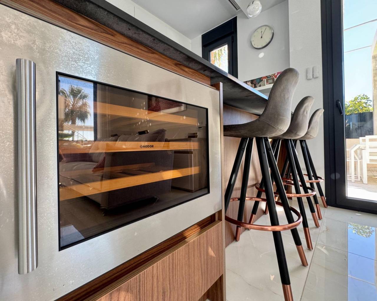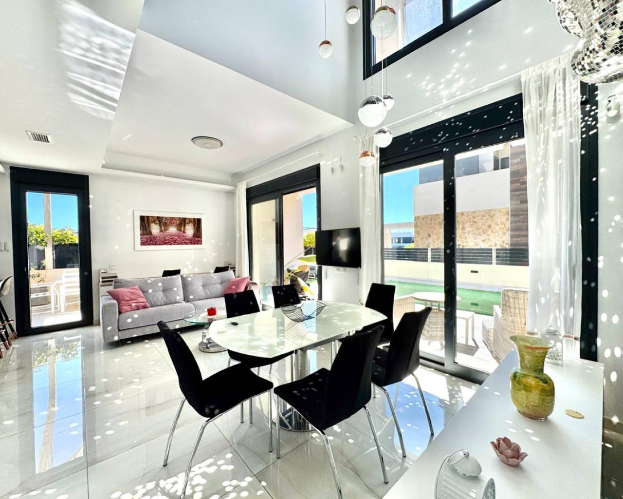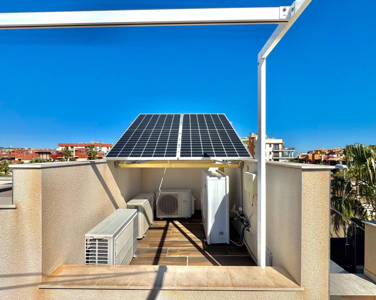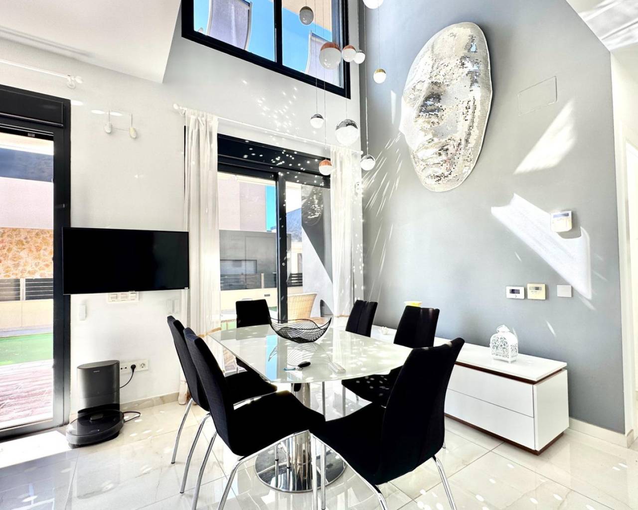 villa independiente moderna construida en 2021, lista para entrar a vivir y completamente amueblada, situada en una zona tranquila y soleada cerca de la playa y de todos los servicios. esta elegante vivienda combina espacio, luz y confort y es ideal tanto para vivir todo el año como para disfrutarla como segunda residencia en la costa blanca. la villa cuenta con 285 m2 construidos y 185 m2 útiles, distribuidos en dos plantas más un amplio sótano. en el interior encontramos cuatro dormitorios y cuatro baños, con una distribución moderna y abierta y grandes ventanas panorámicas que aportan mucha luz natural. en el exterior se puede disfrutar de un jardín privado con piscina, varias terrazas y un precioso solárium en la azotea con jacuzzi. gracias a su orientación sur la vivienda disfruta de sol durante casi todo el día. la propiedad también dispone de aire acondicionado, calefacción eléctrica individual, armarios empotrados, trastero y plaza de aparcamiento privada. los paneles solares aportan mayor eficiencia energética y reducen los costes de electricidad. la ubicación es ideal: la playa se encuentra a solo cinco minutos en coche, supermercados a cinco minutos y un centro comercial a unos diez minutos. el aeropuerto de alicante está a aproximadamente 45 minutos. una villa moderna y confortable, perfecta para disfrutar del estilo de vida mediterráneo.