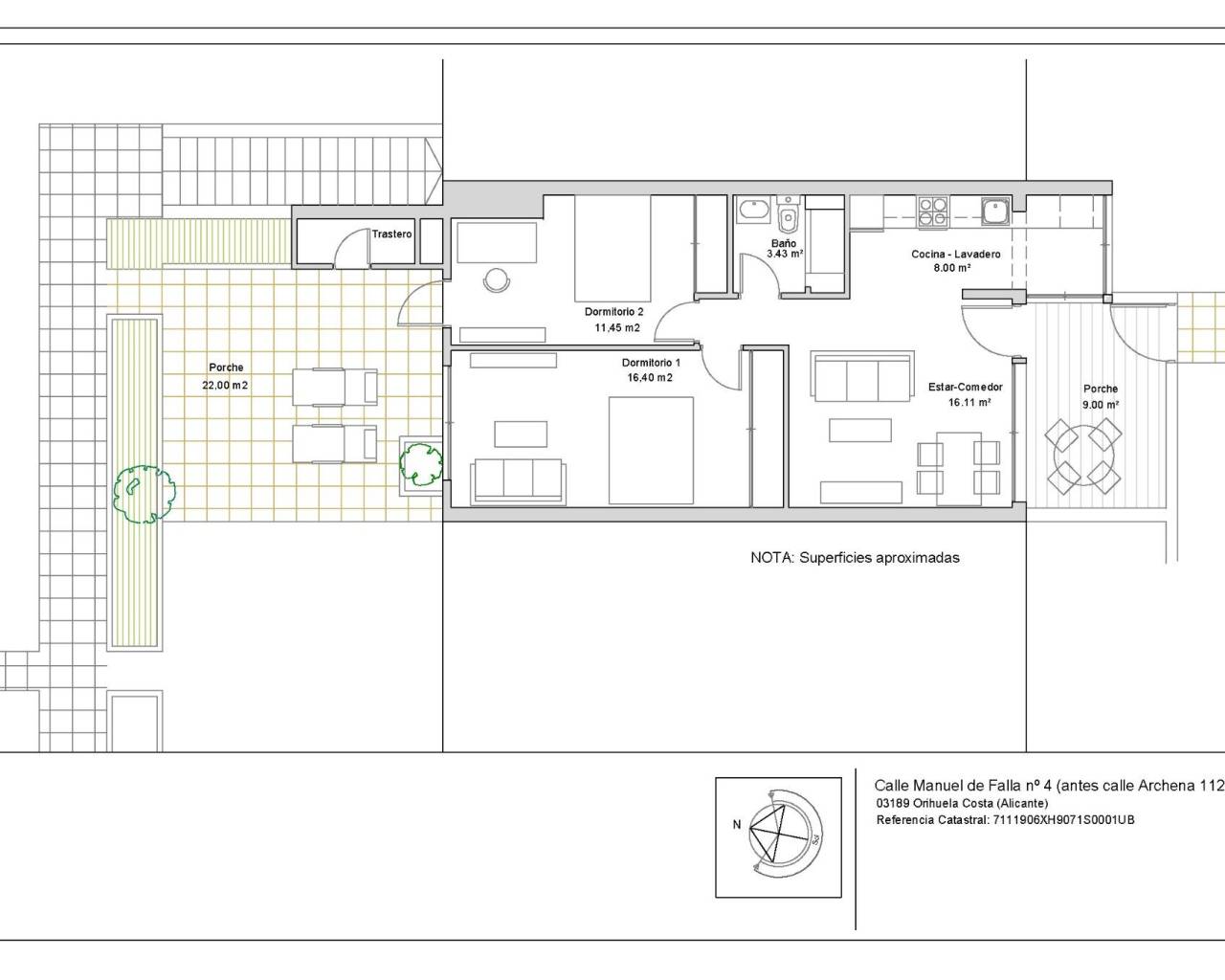 Descubre una vivienda donde la amplitud y el diseño moderno se encuentran en cada rincón. Este bungalow cuenta con dos grandes dormitorios, equipados con armarios empotrados de máxima capacidad, y un baño contemporáneo que incluye plato de ducha. La cocina a estrenar está totalmente equipada y conecta perfectamente con un acogedor porche frontal y una amplia terraza trasera ideal para tus momentos de relax o cenas al aire libre. Los interiores destacan por sus suelos laminados cálidos imitación madera natural, instalaciones completamente nuevas (fontanería y electricidad) además del práctico trastero exterior incluido.~~En cuanto a los exteriores, disfrutarás de un espacio privado equipado con toldo perfecto para leer o tomar café al aire libre; mientras que la gran terraza posterior ofrece versatilidad total para eventos sociales bajo las estrellas rodeado por exuberantes jardines comunitarios meticulosamente cuidados durante todo el año – brindando paz absoluta e intimidad constante.~~Ubicado estratégicamente: A solo minutos caminando encontrarás CC La Rioja (restaurantes), farmacia e incluso supermercados como Dialprix; sin olvidar estar justo frente a prestigiosos campos de golf! En coche llegarás rápidamente a Zenia Boulevard -el centro comercial más grande- así como Vilamartín Plaza lleno servicios médicos extraordinarios junto opciones gastronómicas variadas entre otras maravillas locales dentro del Paraíso Costero - accediendo velozmente hacia playas galardonadas tales como La Zenia o Cabo Roig.