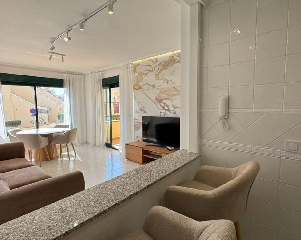 Este excepcional apartamento ubicado en la prestigiosa zona de Lomas de Campoamor ofrece un estilo contemporáneo y comodidad inigualable. Con una superficie construida de 83 m2, esta unidad situada en planta baja elevada cuenta con orientación sur, garantizando vistas despejadas que iluminarán su hogar durante todo el día. La propiedad ha sido completamente reformada e incluye dos amplios dormitorios y dos baños equipados, uno de ellos con ducha a ras del suelo para mayor confort. Su interior destaca por mobiliario de diseño moderno y materiales como piedra natural y baldosas porcelánicas grandes que aportan elegancia al espacio. Aire acondicionado inverter, instalado en todas las estancias, calefacción central a gas así como caldera doble asegurando bienestar climático tanto frío como calor. Aproveche las instalaciones comunitarias que incluyen una piscina bien mantenida rodeada por zonas verdes ajardinadas; además está estratégicamente localizado cerca campos golfísticos. Sin patios interiores ni ruidos molestos gracias a su buen aislamiento acústico. Hogar ideal preparado para disfrutarlo desde el primer momento.