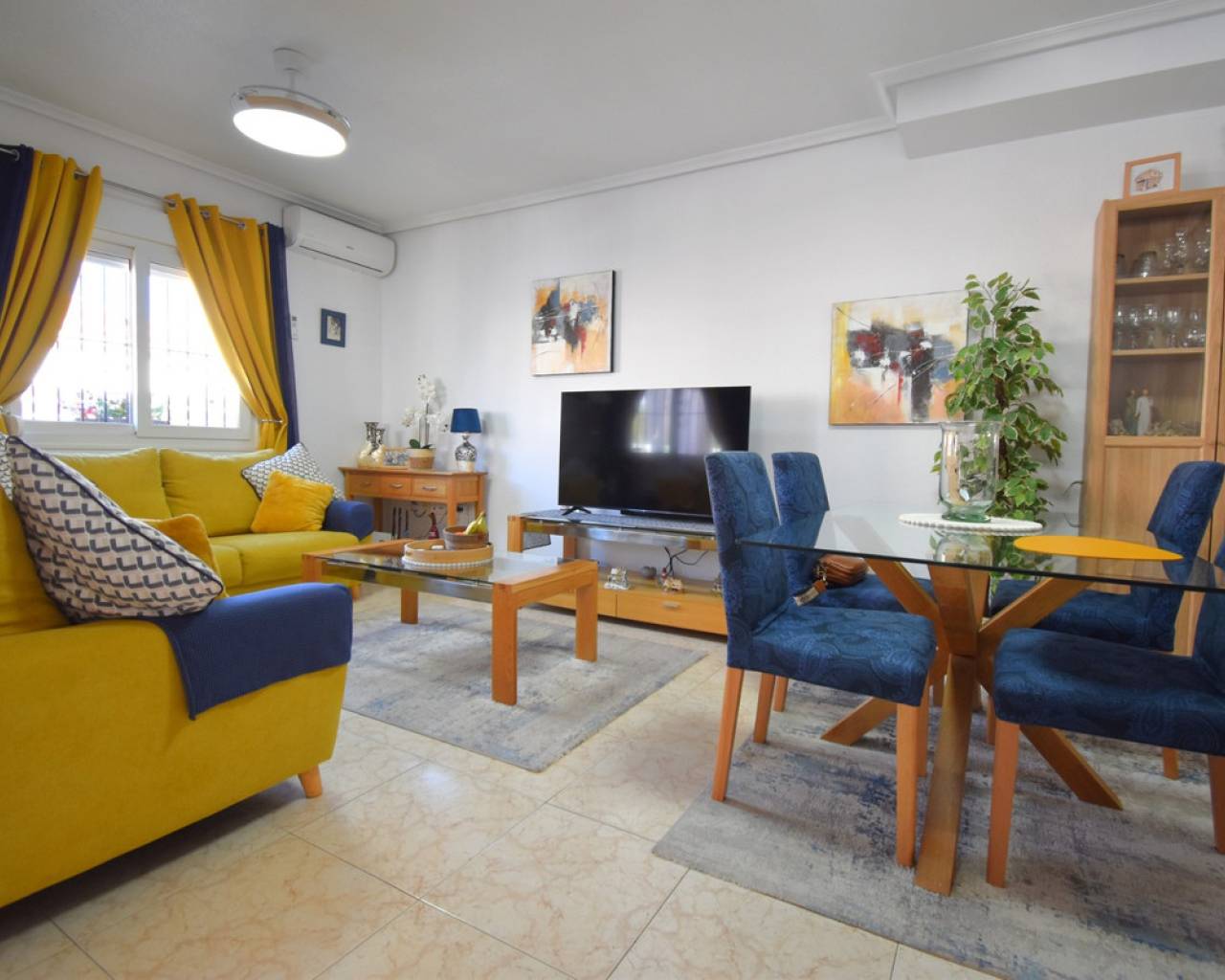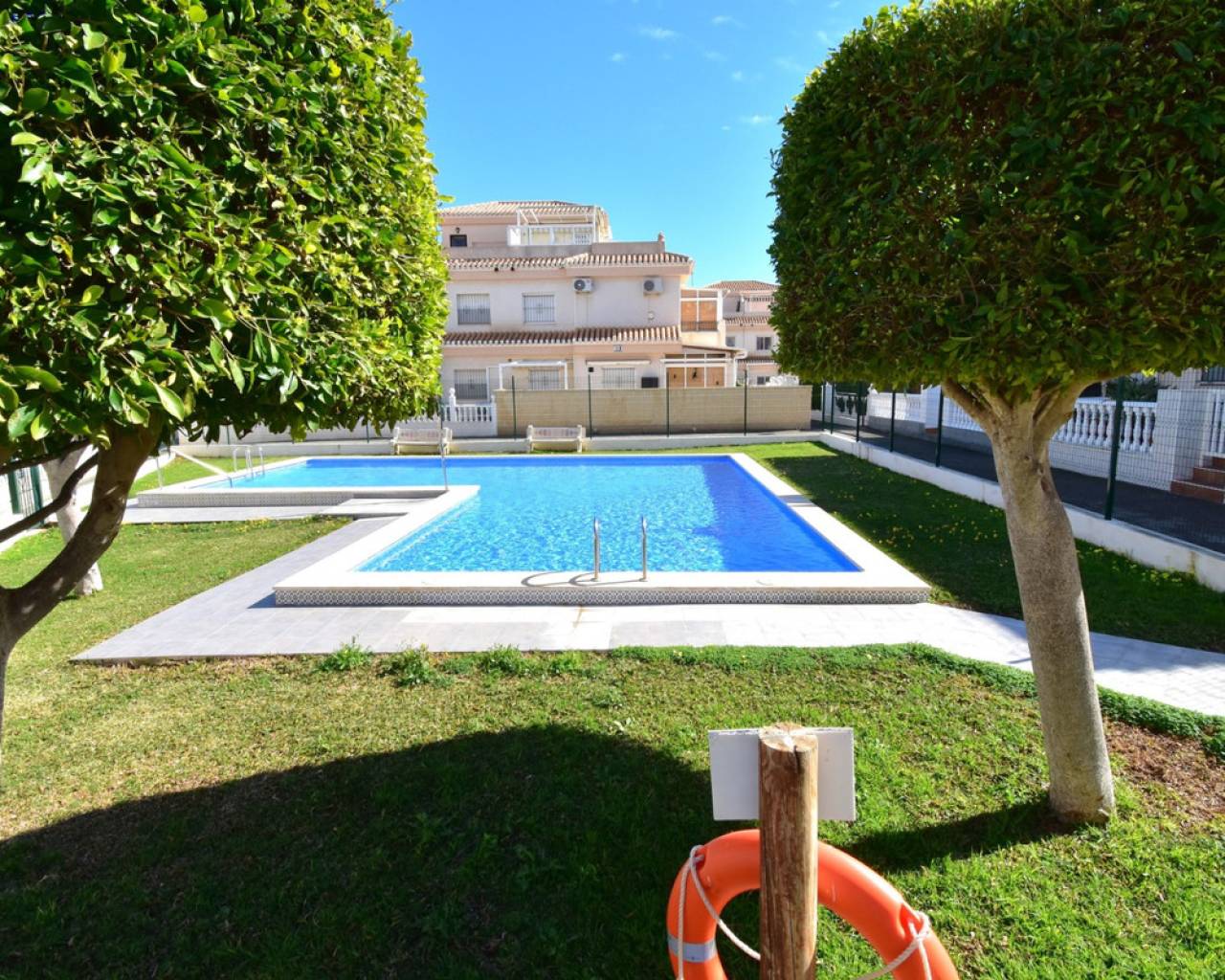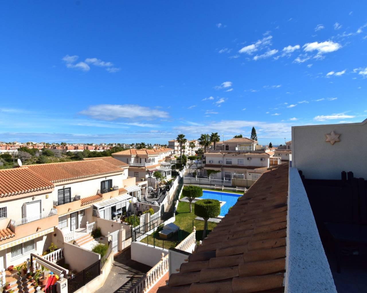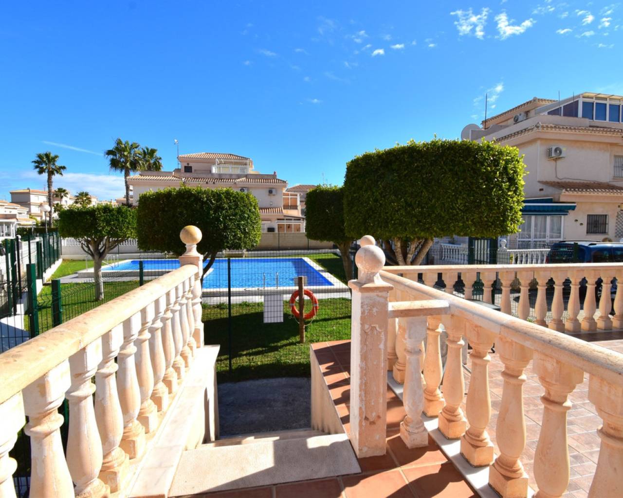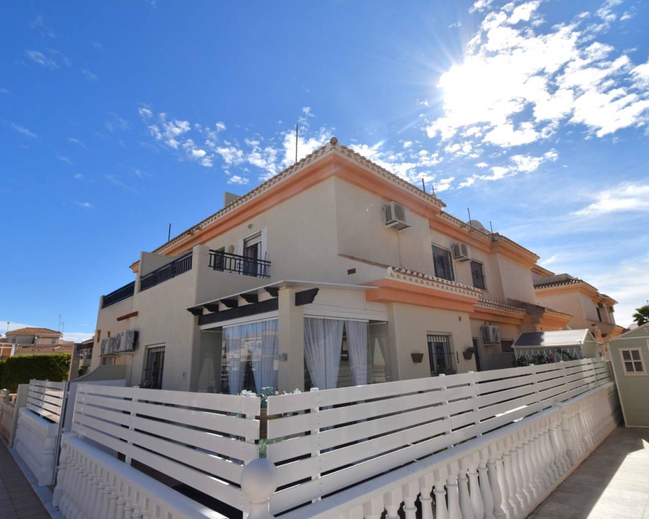 Esta villa cuádruple de tres dormitorios en esquina en Playa Flamenca se encuentra en una zona conocida por su popular mercadillo sabatino, a solo 10 minutos a pie del centro comercial La Zenia Boulevard. También hay un supermercado de una importante cadena y una variedad de restaurantes cerca. Las hermosas playas están a unos 20 minutos a pie o 5 minutos en coche, mientras que una selección de campos de golf de calidad se encuentra a 10 minutos. Situada en el corazón de Orihuela Costa, esta es una ubicación privilegiada en la Costa Blanca Sur. Esta casa de 98 m², bellamente presentada y meticulosamente mantenida, ofrece un alojamiento amplio y luminoso. La terraza de entrada se ha cerrado con cortinas de cristal de alta calidad, creando un espacio habitable versátil adicional. En el interior, el salón-comedor se integra con una moderna cocina americana blanca y equipada. La planta baja también cuenta con un dormitorio doble y un baño con ducha. En la primera planta, hay dos dormitorios dobles más, el principal con acceso a una amplia terraza privada. Un segundo baño con ducha da servicio a esta planta. Desde el interior de la propiedad, se accede al solárium privado, con vistas a la piscina comunitaria. El jardín rodea dos lados de la propiedad y está completamente embaldosado para facilitar su mantenimiento, con la ventaja adicional de un trastero. La atractiva piscina comunitaria está rodeada de césped y una selección de árboles maduros bien cuidados, lo que proporciona un entorno agradable para relajarse. Las características adicionales incluyen ventiladores de techo y aire acondicionado para mayor comodidad durante todo el año. Esta magnífica villa cuádruple en esquina ofrece espacio, estilo y una ubicación inmejorable, lo que la convierte en una opción ideal como residencia permanente, casa de vacaciones o inversión en la Costa Blanca Sur.