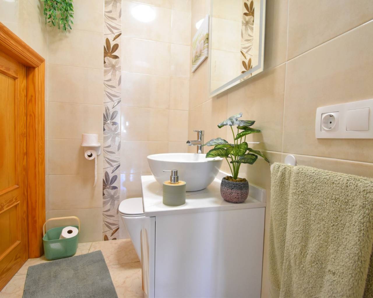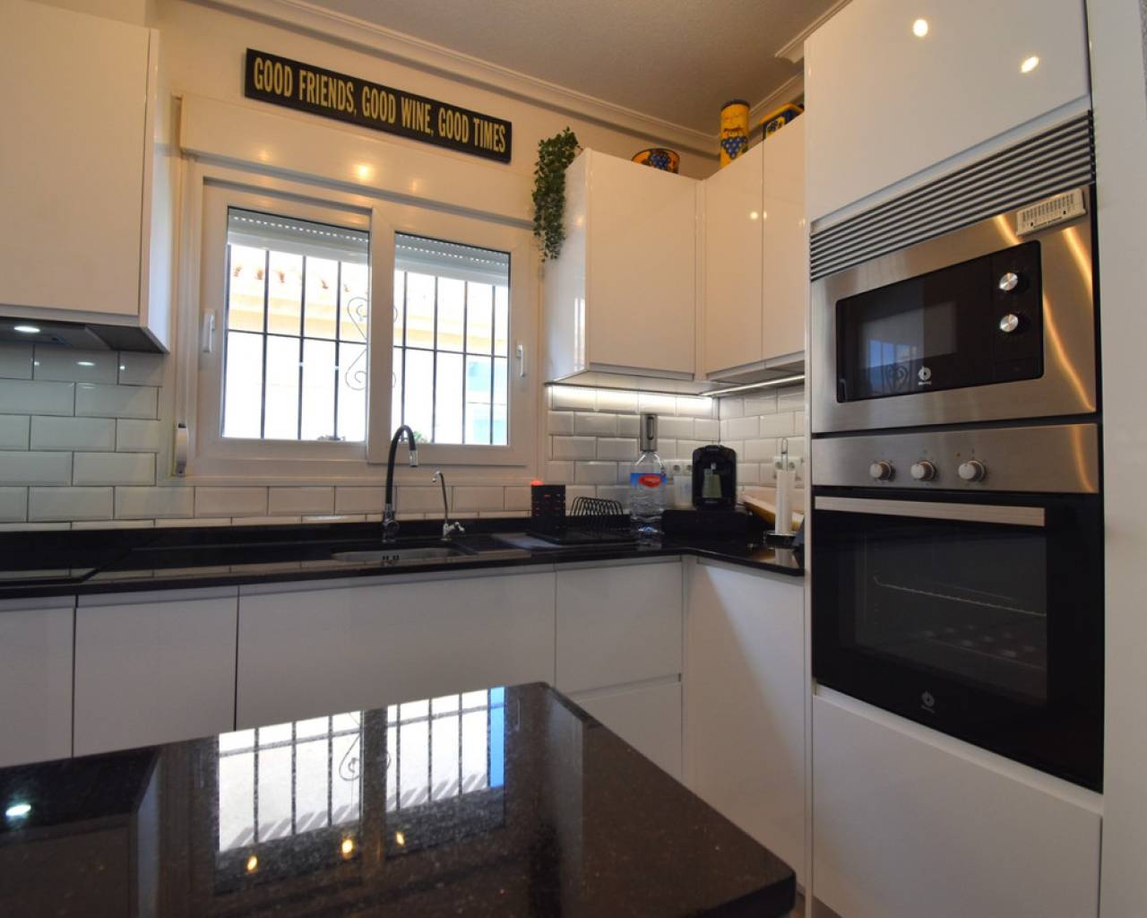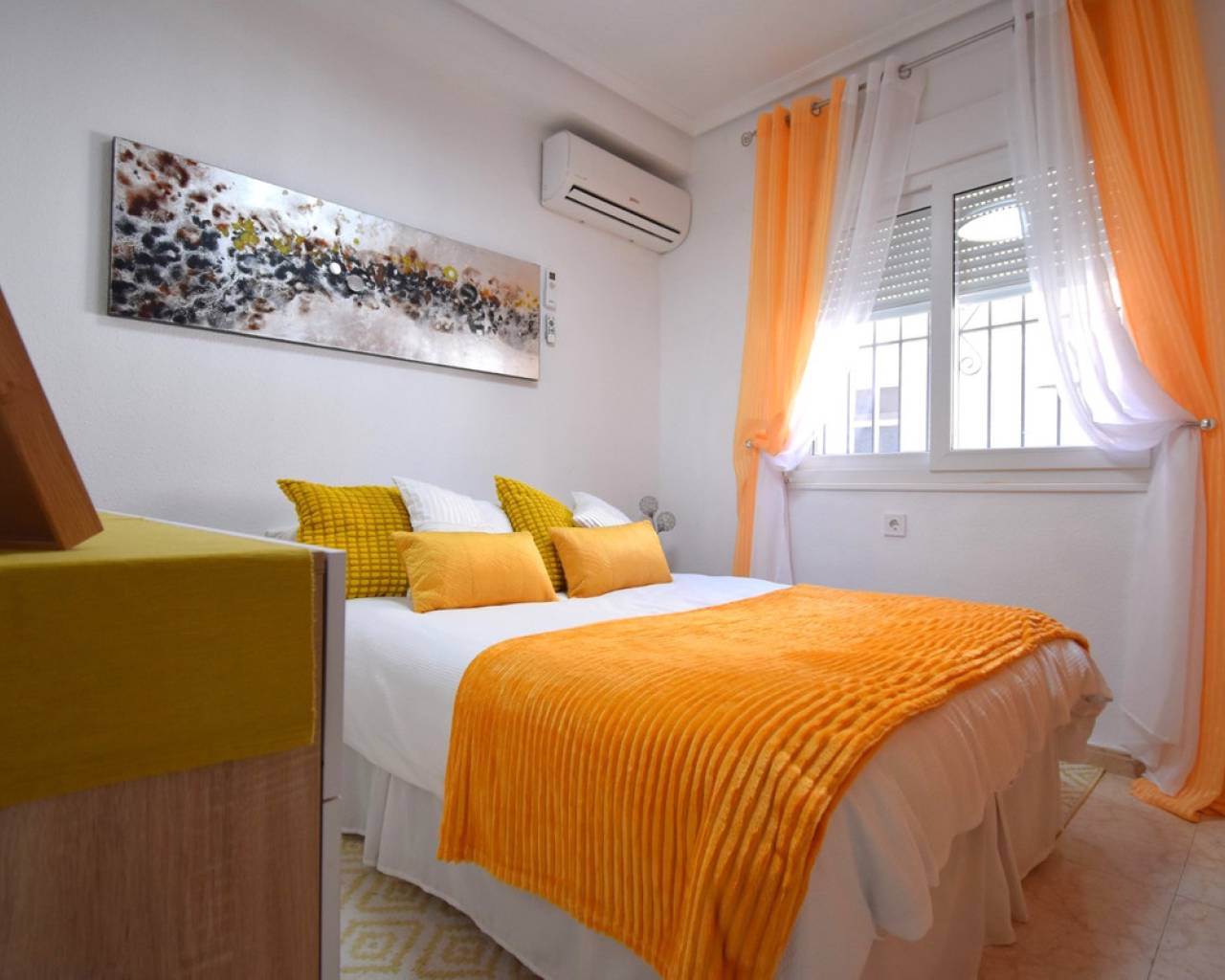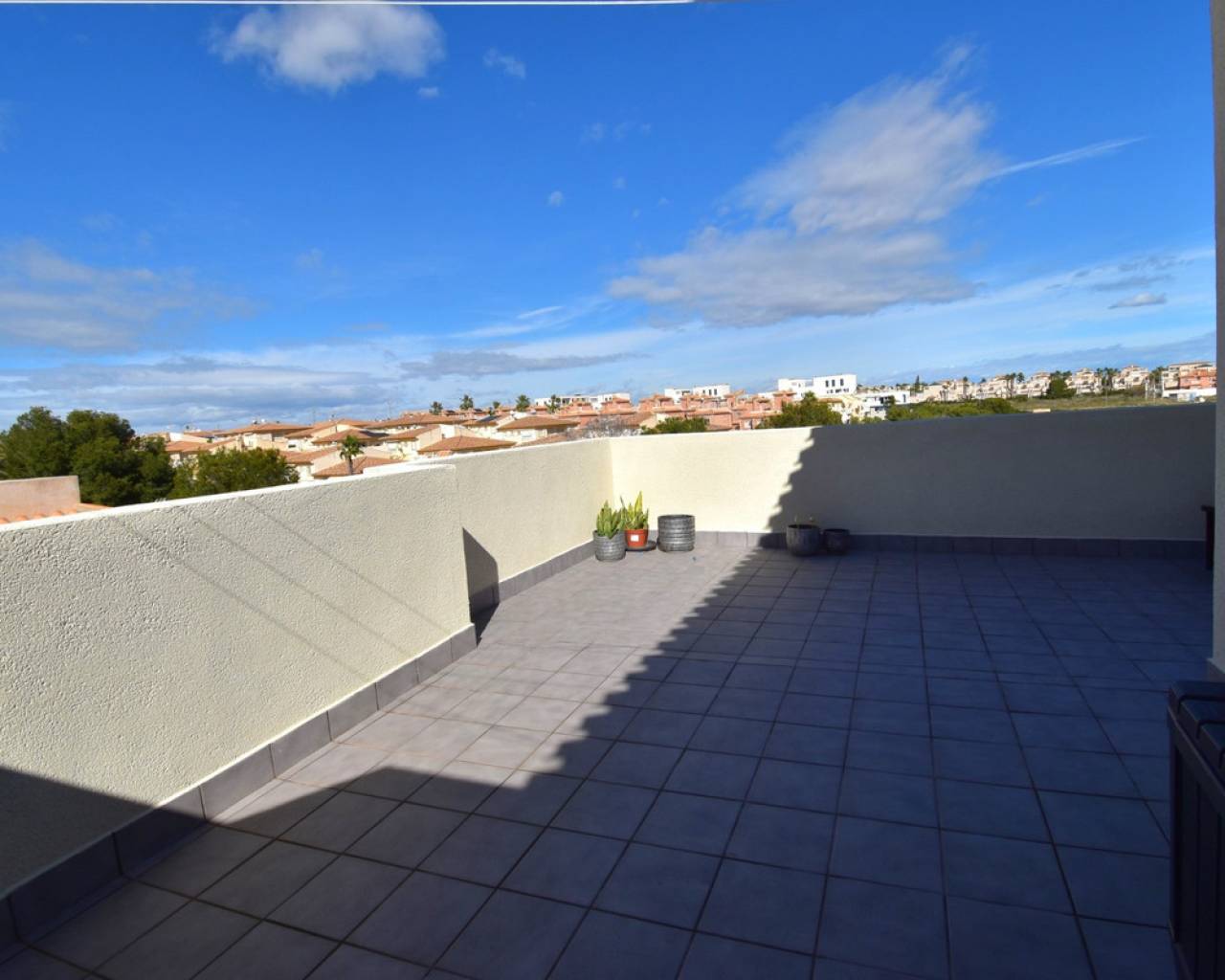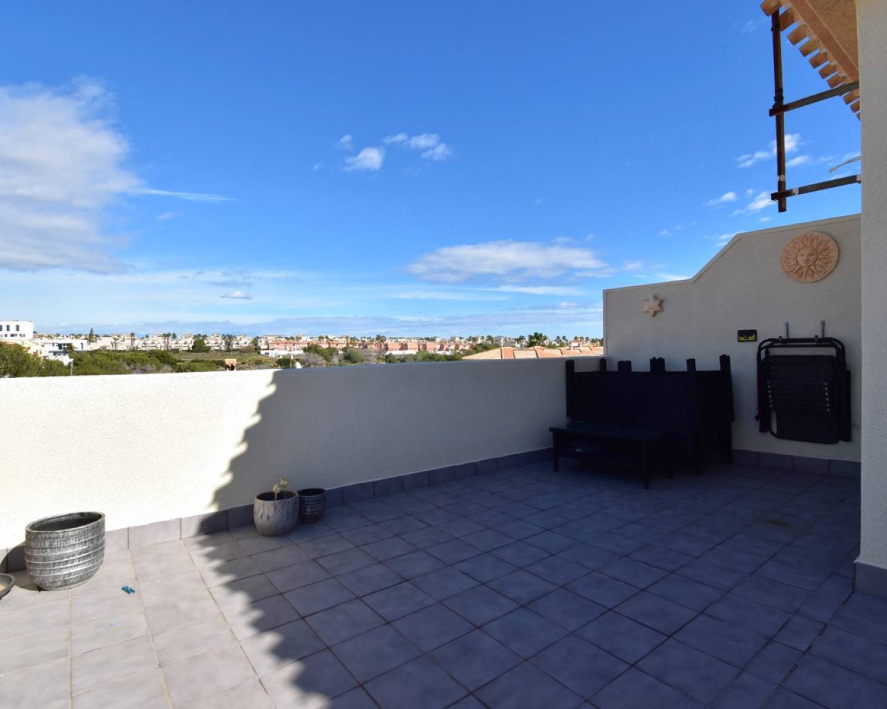 Esta villa cuádruple de tres dormitorios en esquina en Playa Flamenca se encuentra en una zona conocida por su popular mercadillo sabatino, a solo 10 minutos a pie del centro comercial La Zenia Boulevard. También hay un supermercado de una importante cadena y una variedad de restaurantes cerca. Las hermosas playas están a unos 20 minutos a pie o 5 minutos en coche, mientras que una selección de campos de golf de calidad se encuentra a 10 minutos. Situada en el corazón de Orihuela Costa, esta es una ubicación privilegiada en la Costa Blanca Sur. Esta casa de 98 m², bellamente presentada y meticulosamente mantenida, ofrece un alojamiento amplio y luminoso. La terraza de entrada se ha cerrado con cortinas de cristal de alta calidad, creando un espacio habitable versátil adicional. En el interior, el salón-comedor se integra con una moderna cocina americana blanca y equipada. La planta baja también cuenta con un dormitorio doble y un baño con ducha. En la primera planta, hay dos dormitorios dobles más, el principal con acceso a una amplia terraza privada. Un segundo baño con ducha da servicio a esta planta. Desde el interior de la propiedad, se accede al solárium privado, con vistas a la piscina comunitaria. El jardín rodea dos lados de la propiedad y está completamente embaldosado para facilitar su mantenimiento, con la ventaja adicional de un trastero. La atractiva piscina comunitaria está rodeada de césped y una selección de árboles maduros bien cuidados, lo que proporciona un entorno agradable para relajarse. Las características adicionales incluyen ventiladores de techo y aire acondicionado para mayor comodidad durante todo el año. Esta magnífica villa cuádruple en esquina ofrece espacio, estilo y una ubicación inmejorable, lo que la convierte en una opción ideal como residencia permanente, casa de vacaciones o inversión en la Costa Blanca Sur.