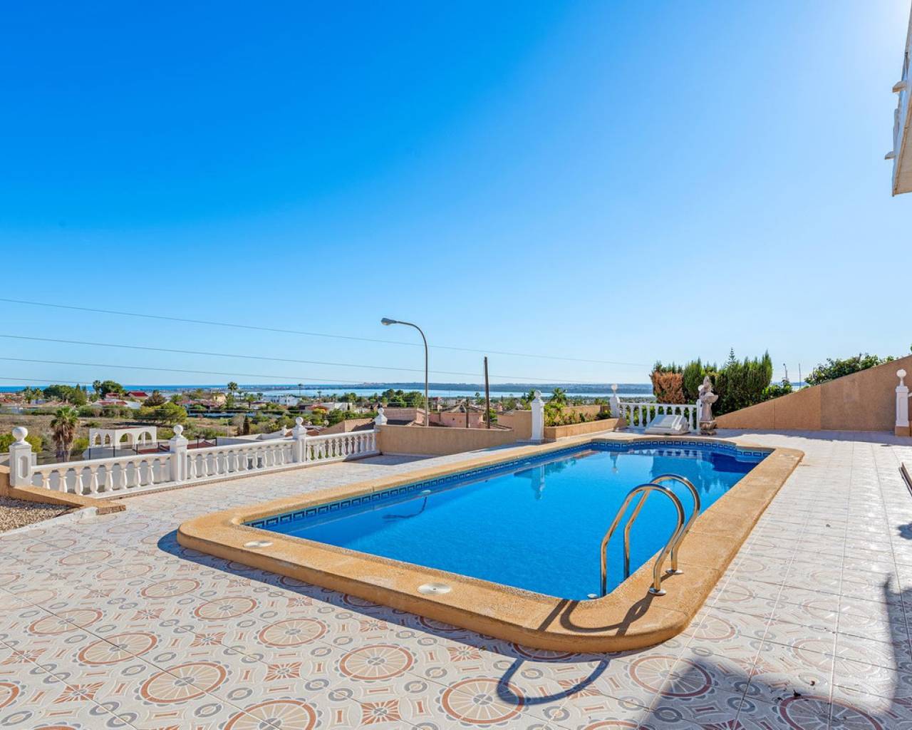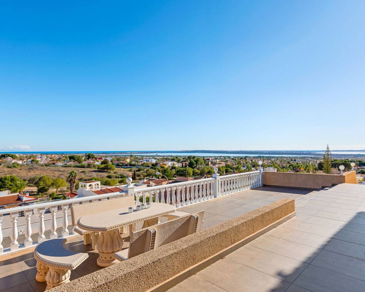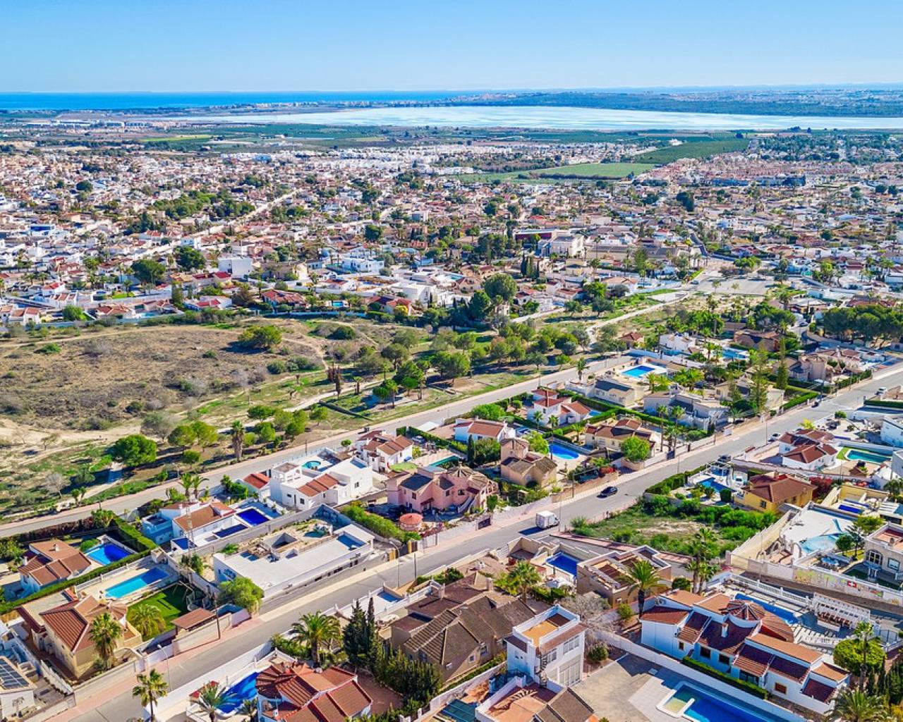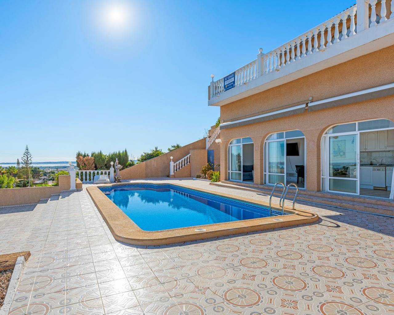 Bienvenido a lo que podría ser la vista más impresionante de Ciudad Quesada. Esta elegante y espaciosa villa con orientación sureste ofrece vistas panorámicas que se extienden desde el resplandeciente mar Mediterráneo hasta las famosas Salinas Rosadas y la exuberante vegetación de la Laguna de La Mata. Ubicada en una generosa parcela de 925 metros cuadrados, esta casa de hermoso diseño combina comodidad y espacio, con múltiples terrazas, un apartamento privado para invitados y una gran piscina para disfrutar plenamente del estilo de vida al aire libre que caracteriza a España. Se accede a la propiedad directamente desde el nivel de la calle a un amplio garaje privado con espacio suficiente para aparcar cómodamente dos vehículos. Desde aquí, una escalera conduce a la zona de la piscina, donde se encuentra el apartamento de invitados independiente. El apartamento es totalmente independiente y cuenta con una cocina y sala de estar de planta abierta, un baño privado con ducha y varias grandes puertas de cristal que dan a la terraza y la piscina. Este espacio es perfecto para recibir visitas o como oportunidad de alquiler. Justo al lado del apartamento, también hay un práctico trastero ideal para guardar cojines, muebles de exterior o accesorios de piscina. La zona exterior de esta planta es espectacular. Una preciosa piscina de diez por cinco metros está rodeada por una amplia terraza abierta, ideal para tomar el sol o disfrutar del entretenimiento. Un acogedor comedor a la sombra, decorado con coloridas buganvillas, crea un rincón tranquilo y privado para comer al aire libre mientras se disfruta de vistas panorámicas al mar. Desde esta terraza, se puede acceder a la casa principal, que se abre a otra amplia terraza con vistas panorámicas aún mejores: esta vez a las Salinas Rosadas, los pueblos cercanos de Guardamar del Segura y Rojales, y las lejanas aguas azules del Mediterráneo. Se accede a la parte principal de la casa a través de un salón-terraza totalmente acristalado. Este solárium es el lugar perfecto para disfrutar del café de la mañana mientras se contempla el amanecer. Gracias a los toldos instalados para mayor sombra durante los meses más cálidos, este espacio se puede disfrutar cómodamente durante todo el año. Desde el solárium, se puede acceder al pasillo, donde se encuentra un aseo de invitados, o directamente al corazón de la casa: el luminoso y abierto comedor. Justo delante hay un despacho privado, que podría convertirse fácilmente en un cuarto dormitorio si lo desea. A la izquierda del comedor se encuentra una cocina moderna y bien equipada con un elegante acabado blanco y un gran frigorífico de dos puertas. Conectado a la cocina hay un amplio lavadero, que también conduce a un espacio de almacenamiento adicional situado a pocos pasos. Junto al lavadero hay un despacho que es el cuarto dormitorio. Al otro lado del comedor se encuentra una amplia sala de estar, con una acogedora chimenea, perfecta para las noches más frescas. Aquí encontrará un amplio espacio para relajarse con la familia o los amigos, incluyendo espacio para un sofá grande y un sistema de entretenimiento. Más allá del salón se encuentra el ala de los dormitorios. Hay tres amplios dormitorios en total, cada uno con armarios empotrados y luz natural. El dormitorio principal cuenta con su propio baño en suite, mientras que los dos dormitorios restantes comparten un segundo baño elegante y funcional. Cada detalle de esta casa se ha mantenido con esmero y se ha decorado con buen gusto. La propiedad se vende completamente amueblada, lo que significa que puede mudarse de inmediato y comenzar a disfrutar de la vida bajo el sol español sin tener que mover un dedo. En el exterior, la parcela está ingeniosamente diseñada en varios niveles para maximizar el sol y la sombra durante todo el día. Ya sea que esté descansando junto a la piscina, leyendo en la terraza superior o disfrutando de una cena tranquila bajo las estrellas, siempre encontrará el lugar perfecto. El jardín está bellamente embaldosado y cuidadosamente plantado, con un paisajismo de bajo mantenimiento que añade encanto y color durante todo el año. Ubicada en una zona tranquila y consolidada, la villa está a un corto paseo de tiendas, bares y restaurantes, con el centro de Ciudad Quesada a menos de quince minutos a pie. Las galardonadas playas de Guardamar del Segura y La Mata están a un corto trayecto en coche, y varios pueblos con encanto como Benijófar, Benimar y Rojales están a poca distancia. Esta es realmente una de las propiedades con mejores vistas en Ciudad Quesada, que combina elegancia, funcionalidad y algunos de los mejores paisajes de la Costa Blanca. Ya sea que busque una residencia permanente, una escapada vacacional o una inversión con un excelente potencial de alquiler, esta propiedad lo tiene todo. Para apreciar plenamente todo lo que esta casa ofrece, le recomendamos encarecidamente visitarla.