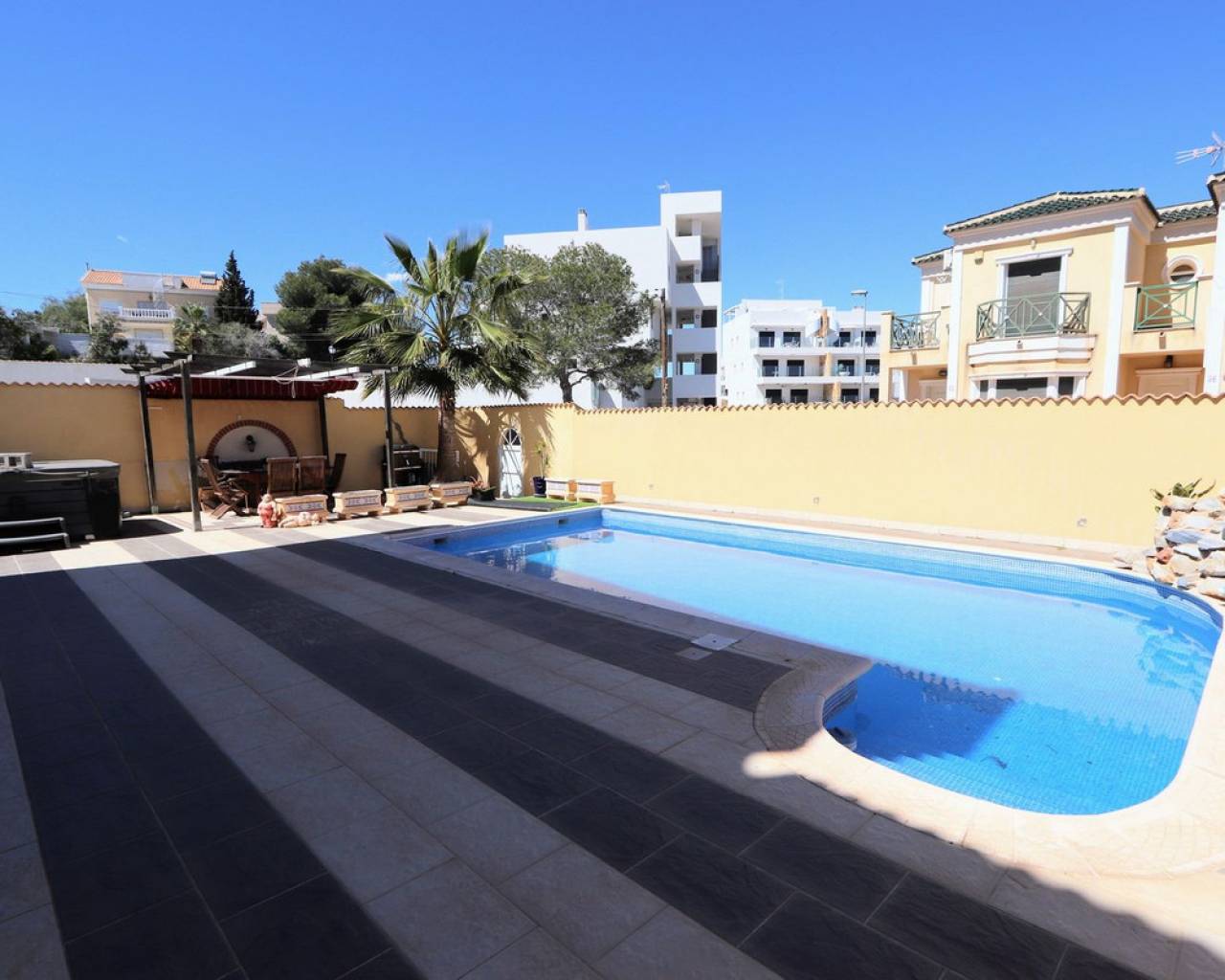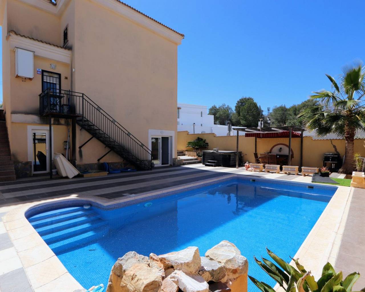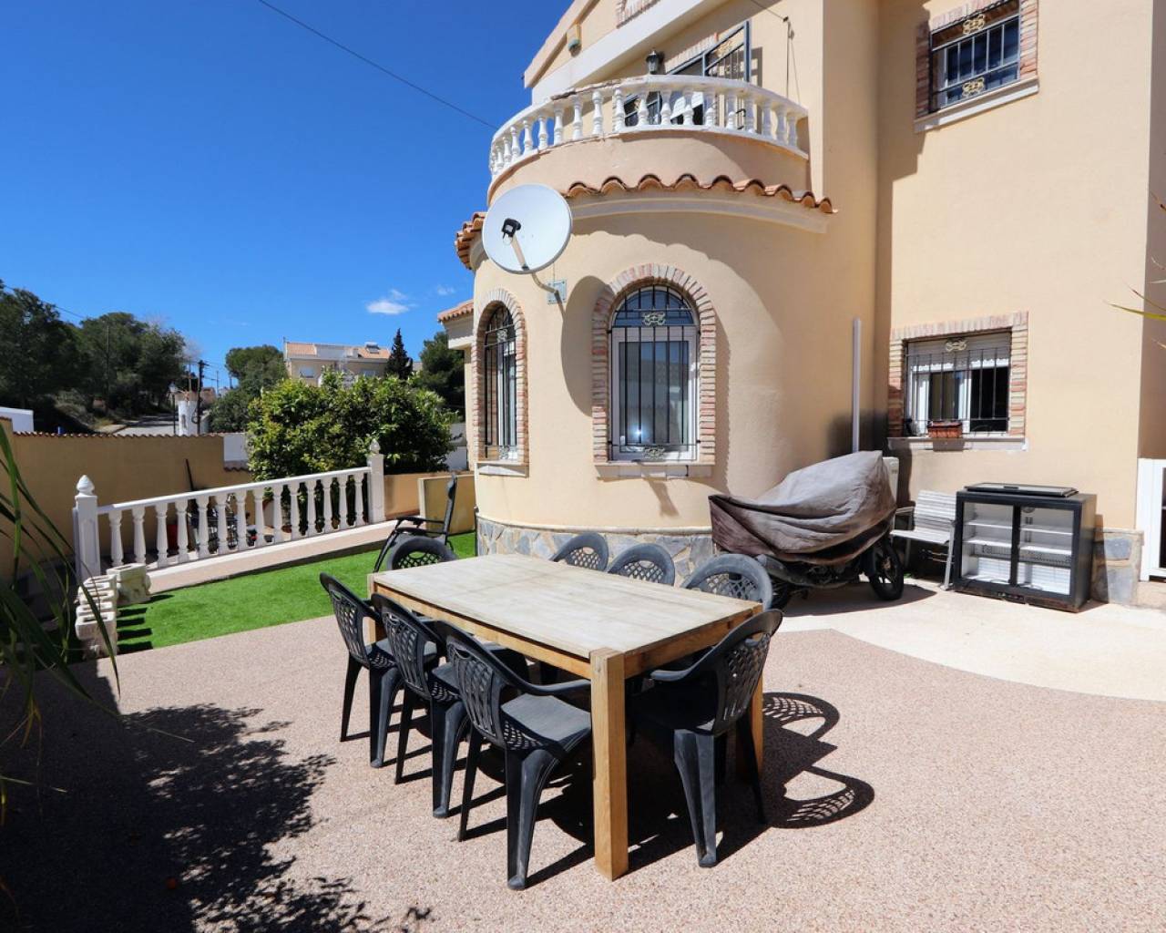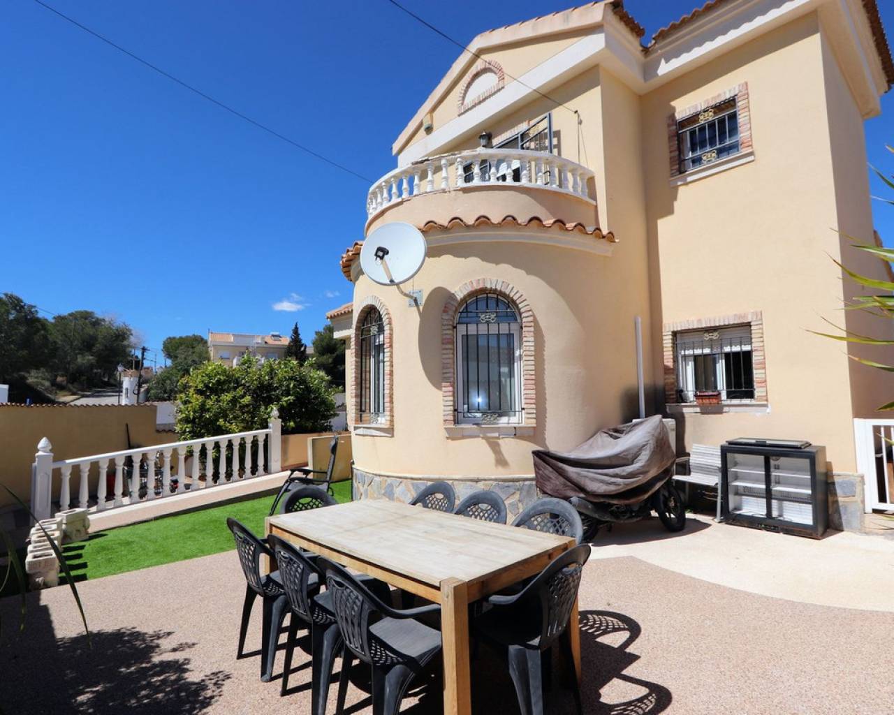 Esta impresionante villa independiente de 3 dormitorios se encuentra en una zona tranquila de Las Filipinas, Villamartín. La propiedad consta de 3 dormitorios, 2 de ellos con terraza privada, 2 baños, salón-comedor y cocina totalmente equipada. Dispone de aire acondicionado, soleadas terrazas que rodean la propiedad, jardín, sótano y piscina y jacuzzi privados. Se vende amueblada. Las Filipinas es una de las zonas más bonitas de Orihuela Costa, muy cerca de Playa Flamenca, La Zenia, Cabo Roig, Campoamor, Villamartín, Los Dolses, Punta Prima y La Regia. Además, se encuentra a pocos minutos del Centro Comercial La Zenia Boulevard, que cuenta con 150 locales comerciales en una superficie de 160.000 m² y 5.000 plazas de aparcamiento gratuitas para sus visitantes. Todo ello lo convierte en el mayor centro comercial de toda la provincia de Alicante. Asimismo, en el Boulevard se celebran eventos para toda la familia (conciertos, actividades infantiles, etc.). Los puertos deportivos y marinas de Las Filipinas organizan diversas actividades náuticas y cuentan con varias escuelas de vela. Hay cinco campos de golf en Las Filipinas que satisfacen las necesidades de los jugadores más experimentados y ofrecen la oportunidad de disfrutar de condiciones de nivel profesional. Las Filipinas cuenta con diversas rutas turísticas y paseos marítimos que ofrecen belleza natural, paisajes espectaculares y un entorno perfecto para toda la familia. Además, existen 6 km de carriles bici que permiten un recorrido tranquilo desde Dehesa de Campoamor, Cabo Roig y La Zenia. También hay una red de carriles bici que conecta las playas y paseos marítimos de Orihuela Costa.
