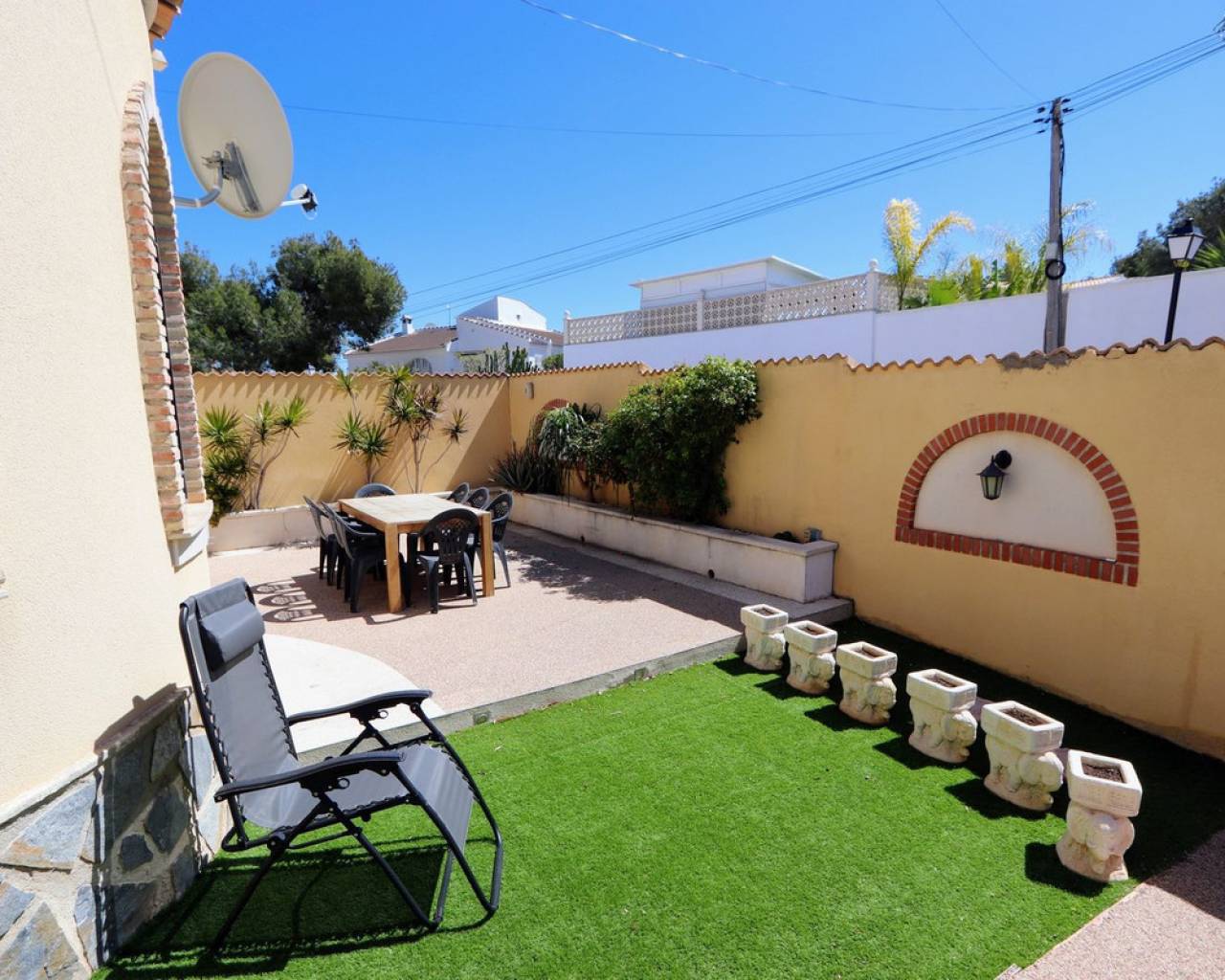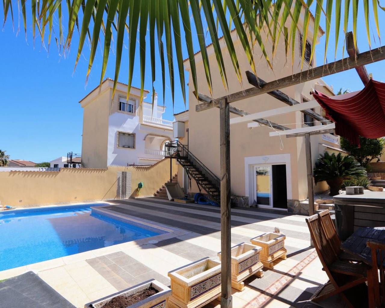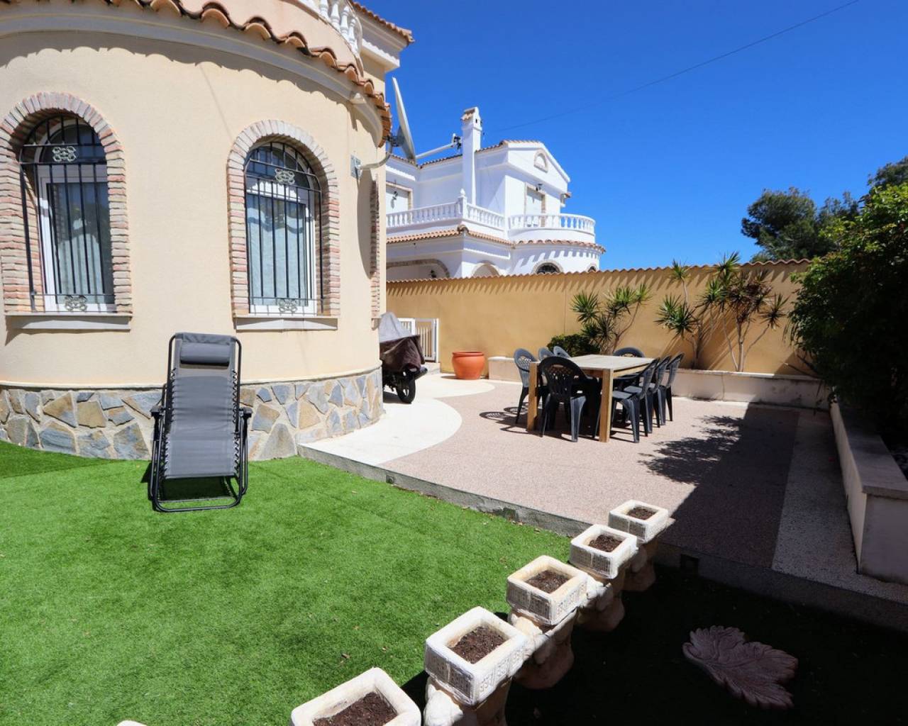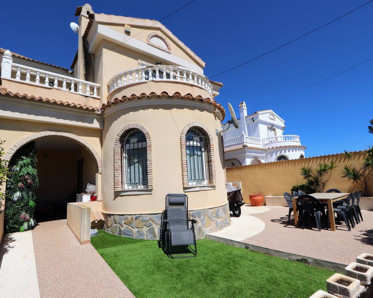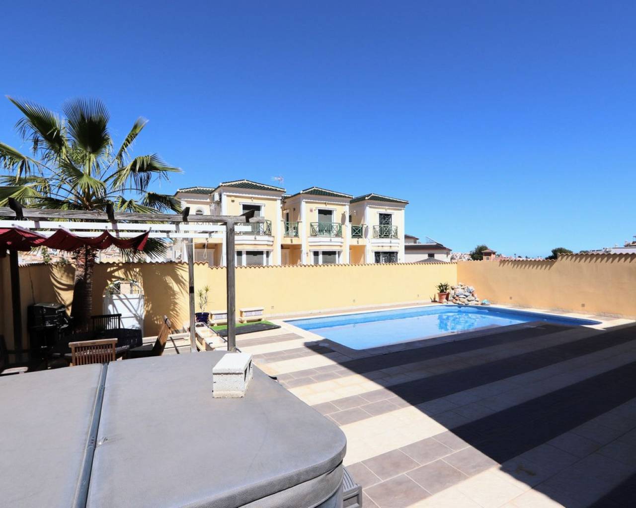 Esta impresionante villa independiente de 3 dormitorios se encuentra en una zona tranquila de Las Filipinas, Villamartín. La propiedad consta de 3 dormitorios, 2 de ellos con terraza privada, 2 baños, salón-comedor y cocina totalmente equipada. Dispone de aire acondicionado, soleadas terrazas que rodean la propiedad, jardín, sótano y piscina y jacuzzi privados. Se vende amueblada. Las Filipinas es una de las zonas más bonitas de Orihuela Costa, muy cerca de Playa Flamenca, La Zenia, Cabo Roig, Campoamor, Villamartín, Los Dolses, Punta Prima y La Regia. Además, se encuentra a pocos minutos del Centro Comercial La Zenia Boulevard, que cuenta con 150 locales comerciales en una superficie de 160.000 m² y 5.000 plazas de aparcamiento gratuitas para sus visitantes. Todo ello lo convierte en el mayor centro comercial de toda la provincia de Alicante. Asimismo, en el Boulevard se celebran eventos para toda la familia (conciertos, actividades infantiles, etc.). Los puertos deportivos y marinas de Las Filipinas organizan diversas actividades náuticas y cuentan con varias escuelas de vela. Hay cinco campos de golf en Las Filipinas que satisfacen las necesidades de los jugadores más experimentados y ofrecen la oportunidad de disfrutar de condiciones de nivel profesional. Las Filipinas cuenta con diversas rutas turísticas y paseos marítimos que ofrecen belleza natural, paisajes espectaculares y un entorno perfecto para toda la familia. Además, existen 6 km de carriles bici que permiten un recorrido tranquilo desde Dehesa de Campoamor, Cabo Roig y La Zenia. También hay una red de carriles bici que conecta las playas y paseos marítimos de Orihuela Costa.