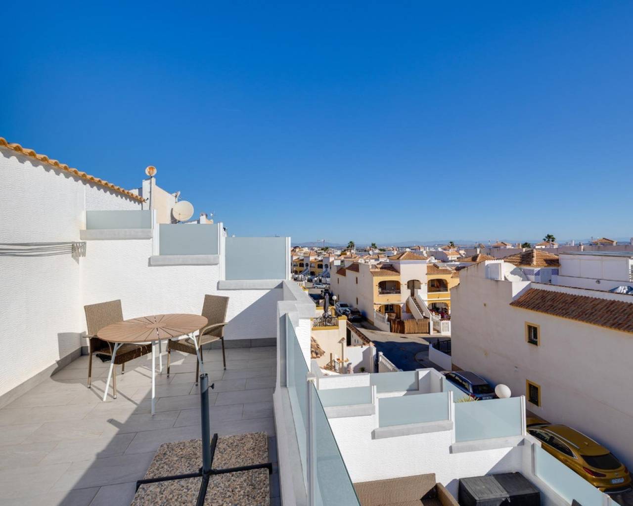 Te presentamos esta impresionante casa adosada de estilo cuadrado ubicada en la codiciada comunidad Dream Hills de Los Altos. Esta propiedad bellamente amueblada cuenta con tres amplias habitaciones ????️ y dos modernos baños ????, lo que la hace perfecta para familias o aquellos que buscan un retiro vacacional. Disfruta de mucho sol en tu extenso jardín ????, que incluye un encantador área de porche y una entrada adecuada para el estacionamiento de vehículos ????. También apreciarás la comodidad de tener instalaciones de lavandería privadas ???? y amplio espacio de almacenamiento con un trastero dedicado.En el primer piso, encontrarás otra gran terraza ideal para relajarte ☕????, así como acceso a tu propio solárium privado que ofrece impresionantes vistas despejadas ????. La ubicación está a solo 300 metros de las piscinas comunitarias ????♂️ rodeadas de exuberantes áreas verdes ???? y canchas de pádel gratuitas disponibles exclusivamente para residentes ????.El estacionamiento privado numerado para residentes garantiza comodidad al regresar a casa después de explorar todo lo que ofrece la cercana Torrevieja (a 10 minutos) ????. La playa de La Zenia también está a poca distancia, al igual que otras hermosas playas a diez minutos en coche ⏱️????!¡No te pierdas esta oportunidad excepcional; hazla tuya hoy!
