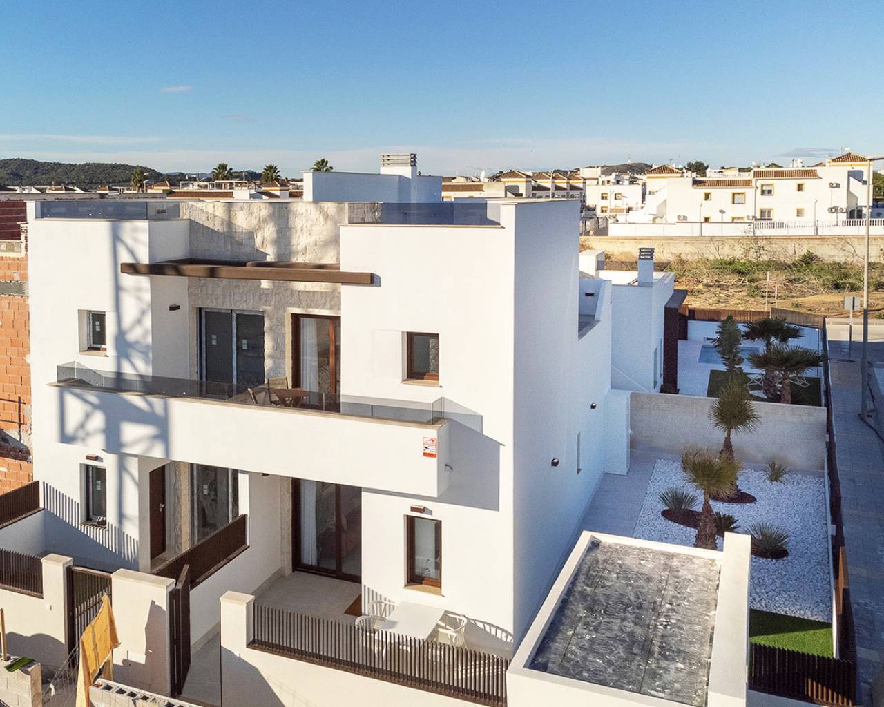 16 nuevas villas con certificado energético clase A. En el área residencial de Entrenaranjos, junto a Vistabella Golf. Con todos los servicios necesarios a escasos metros en el entorno: supermercado, bares, restaurantes. Perfectamente comunicado con otras zonas de interés como las lagunas de Torrevieja, Torrevieja, Guardamar del Segura, Villamartin, Orihuela Costa.. a 35 minutos del Aeropuerto Internacional de Alicante. Estas excelentes villas independientes ofrecen una óptima relación calidad-precio, todas con parcela independiente con espacio de parking, piscina privada de 5 x 3 m. o 6 x 3 m., cuidado diseño con nuevos materiales en interior, exterior y fachada, y una magnífica distribución: En la planta baja cuenta con amplia zona de salón-comedor y cocina abierta, 1 dormitorio con armario empotrado, 1 baño completo y terraza cubierta. La planta primera se distribuye en 2 dormitorios con armarios empotrados, 2 baños en suite y una gran terraza. Con solárium opcional. Las calidades y acabados de serie de esta obra nueva son excelentes: todas las viviendas incluyen persianas automatizadas, suelo radiante en todos los baños, preinstalación de aire acondicionado por conductos, columna de hidromasaje en baño principal y Certificación de Eficiencia Energética clase A. Esta Certificación A incluye: · Aislamientos termo-acústicos con incrementos de densidad en todos los cerramientos y cristales (ClimaGuard), así como en la cubierta. · Importante contribución de fuentes de energía renovables, incluyendo placa solar para producción de agua caliente sanitaria y 3 paneles fotovoltaicos para la producción de energía eléctrica. Además por tiemplo limitado también se incluye de regalo por cortesía del promotor: • Iluminación interior y exterior • Mamparas de ducha en baños • Electrodomésticos en la cocina Las villas tienen muy buena orientación al este o al oeste. ¡Contáctanos para visitas y más información