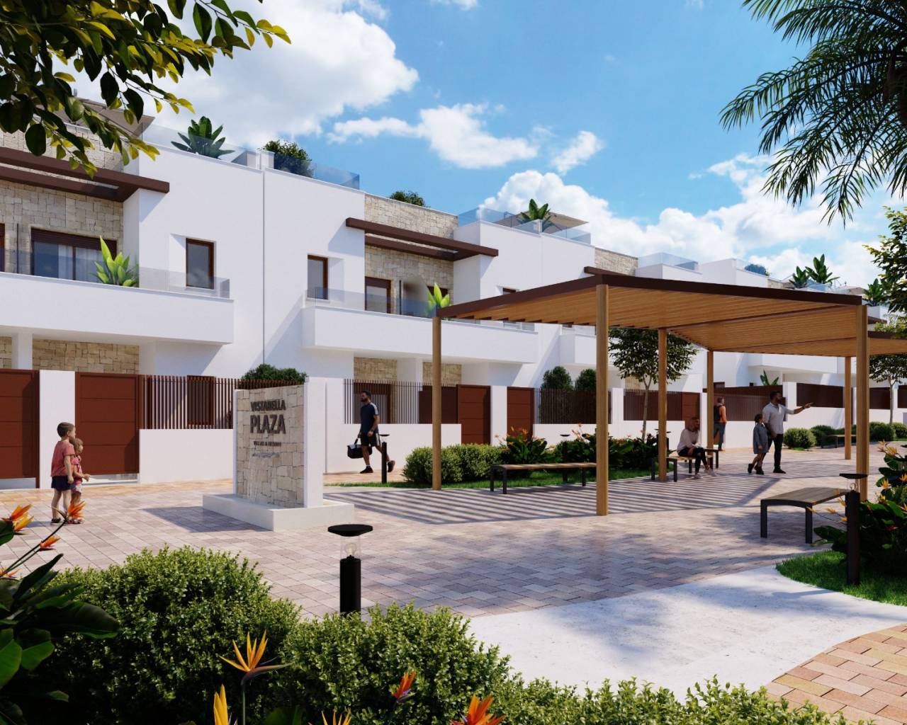 Acceso a zona comunitaria con piscina, jardines, parque infantil y plaza central con pérgola y fuente