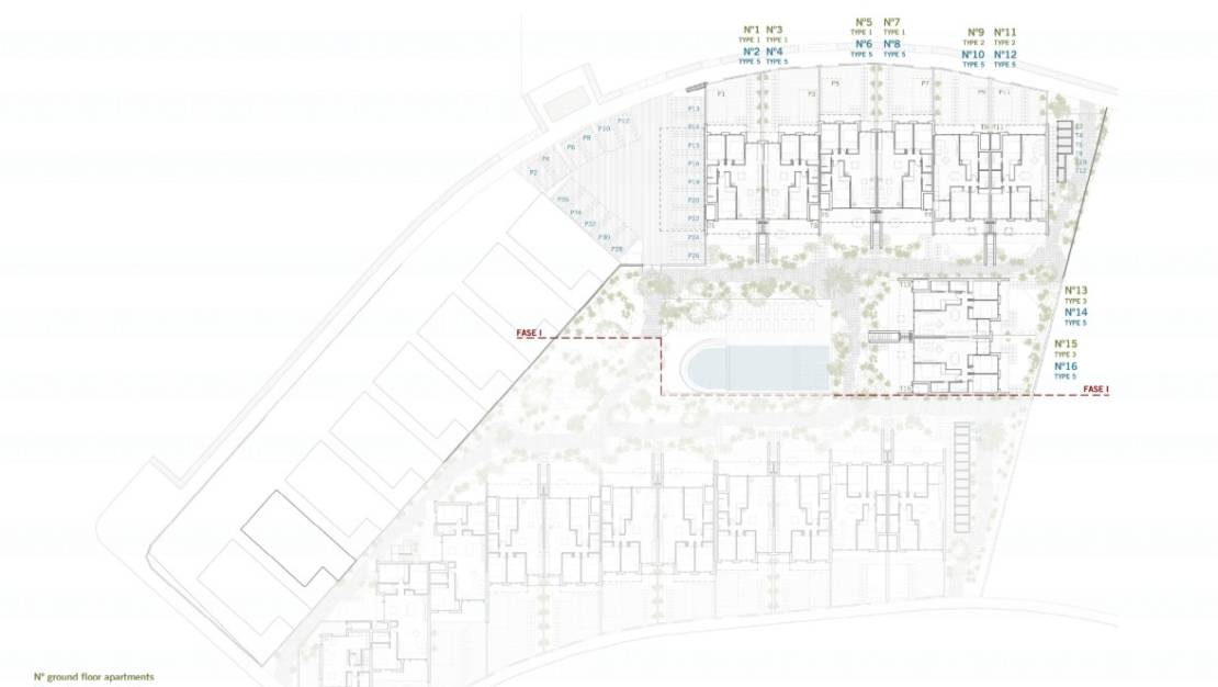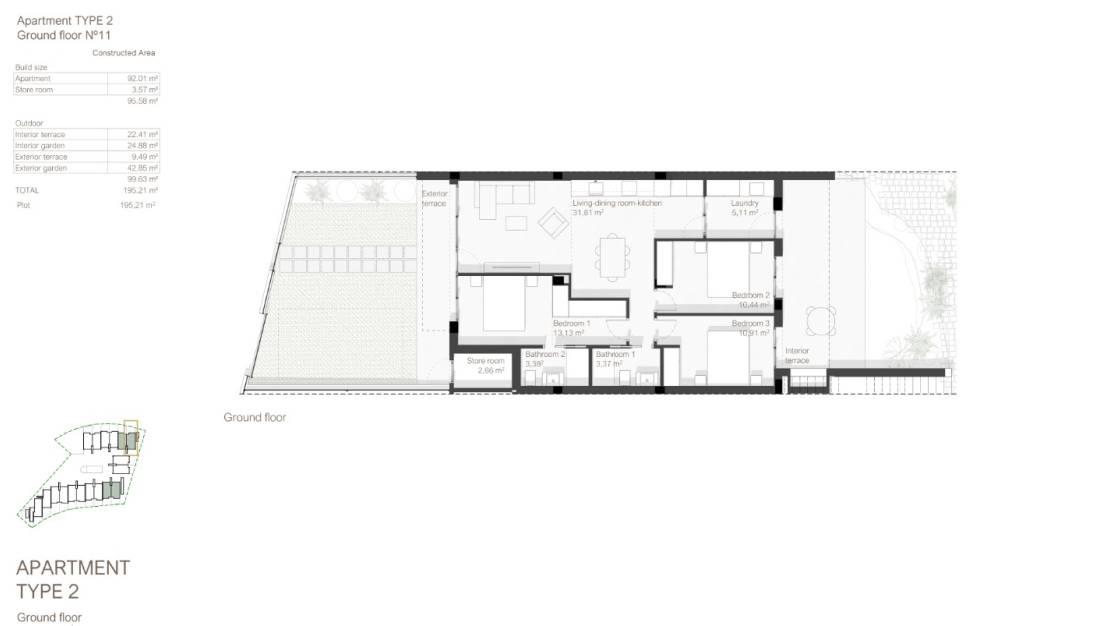 Planta baja: Viviendas de 3 dormitorios y 2 baños, con amplias terrazas y jardines privados tanto en la parte delantera como trasera, perfectos para disfrutar de la vida al aire libre.