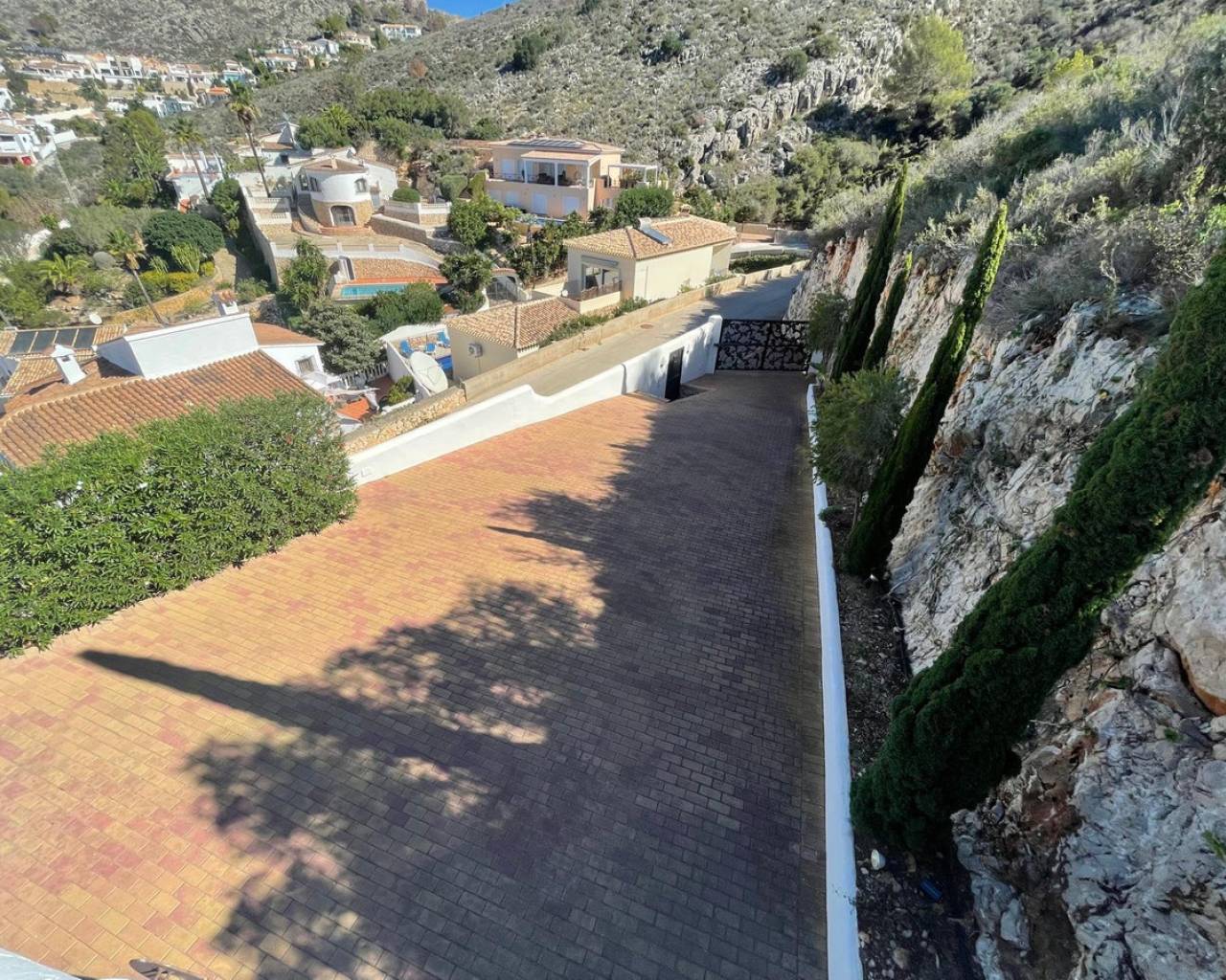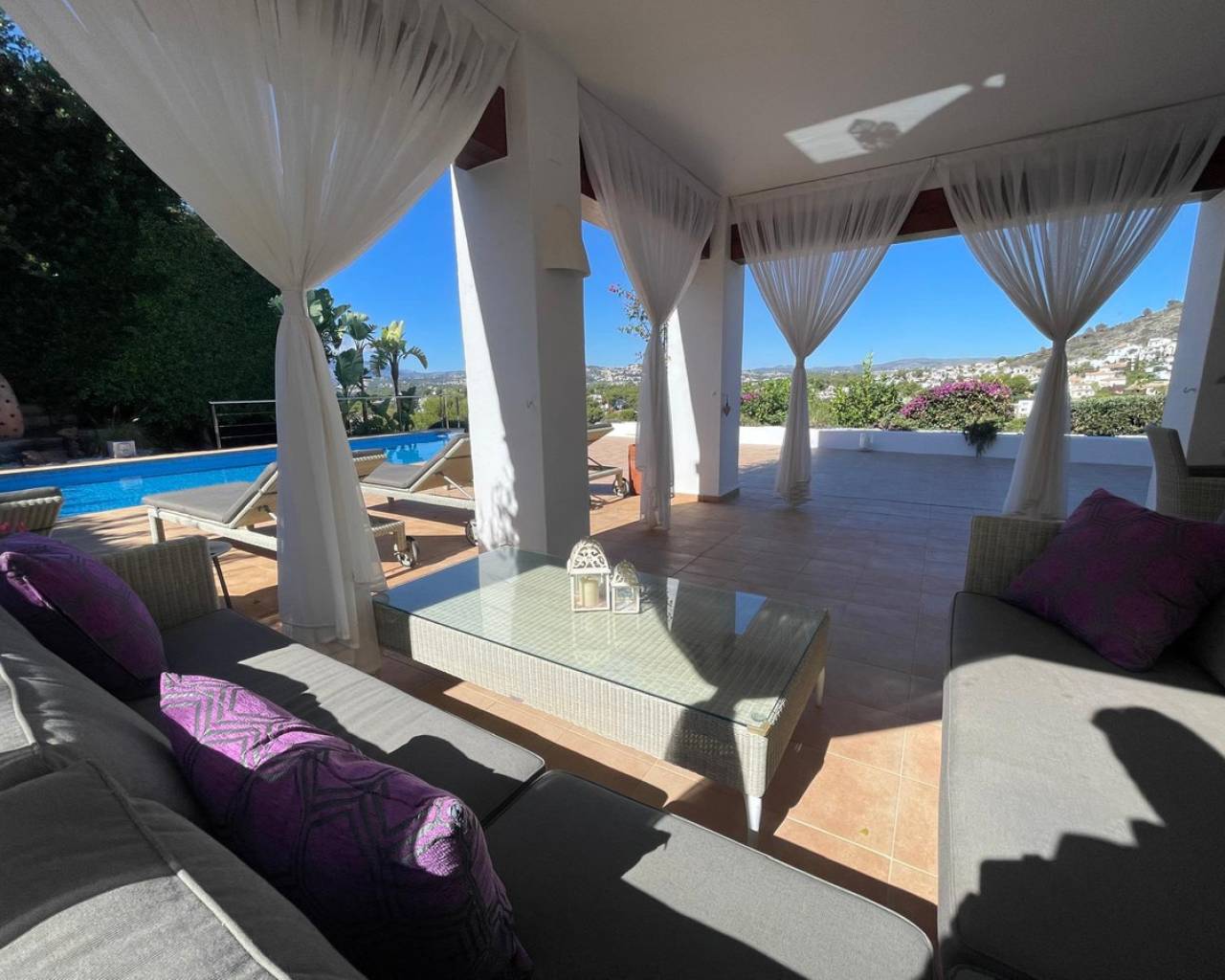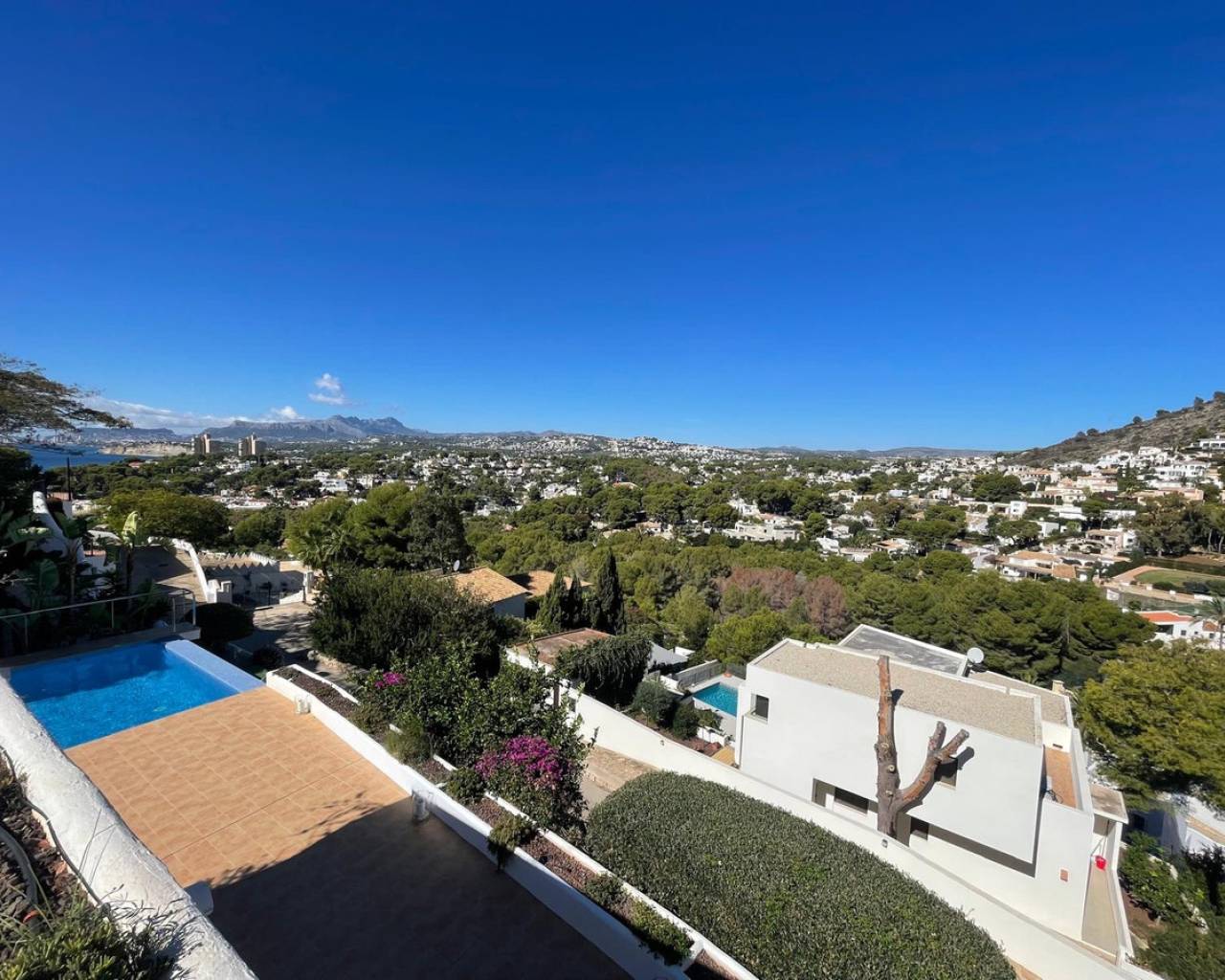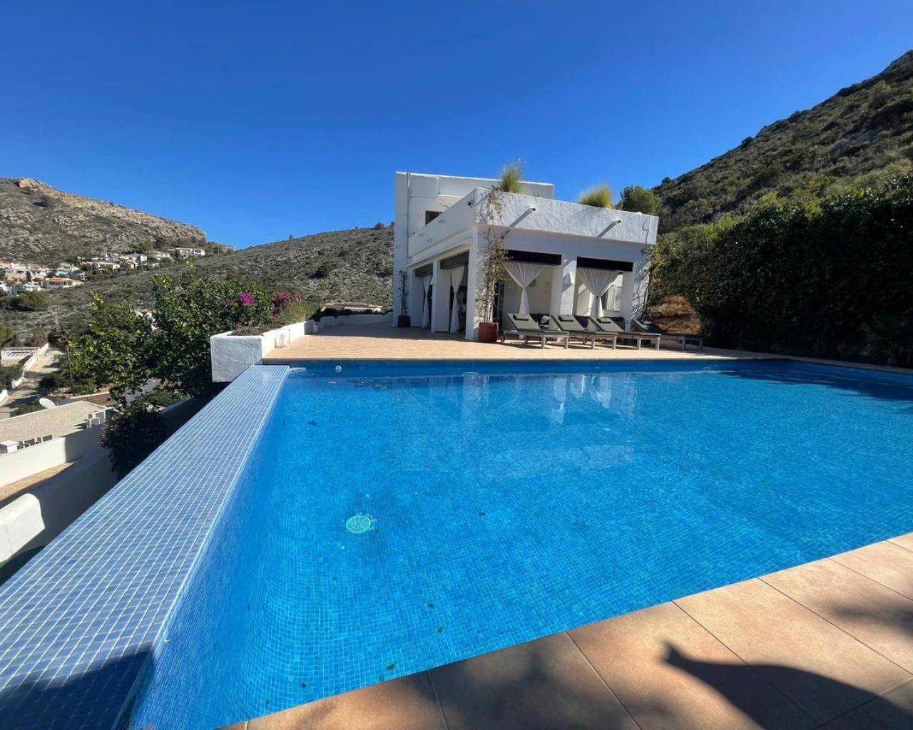 Villa consuelo, El Portet, Moraira. Villa Solace "La Villa Bond" Esta encantadora villa de estilo ibicenco es propiedad de dos productores de cine y teatro de renombre mundial, lo que da una pista de dónde proviene el nombre de esta villa. Los perales en la ladera sobre las villas vecinas miran hacia El Valle del Portet; esta villa podría ser el escenario de una película de James Bond, con espectaculares vistas panorámicas abiertas a las montañas de Benrnia y al mar azul turquesa. Al acercarse a Villa Solace, las puertas de entrada automatizadas de metal arquitectónico se abren y revelan un camino largo y amplio que lo lleva a una cochera espaciosa y a la entrada principal de esta exquisita propiedad. Al ingresar, lo recibirá una entrada amplia y luminosa. Pasillo que se abre a una gran sala de estar con una chimenea central que crea un ambiente acogedor. El salón se conecta a la perfección con la terraza cubierta para comer junto a la piscina, perfecta para recibir invitados o relajarse junto al agua. Junto al salón, encontrará una cocina moderna totalmente equipada con un lavadero en la parte trasera. Esta cocina ofrece un cómodo acceso a la amplia terraza cubierta, un lugar ideal para cenar al aire libre, relajarse o simplemente disfrutar del impresionante entorno. La piscina infinita, enmarcada por arbustos y árboles maduros y bien cuidados, ofrece un entorno sereno para nadar tranquilamente y tomar el sol. Al subir al primer piso, descubrirá dos elegantes dormitorios, cada uno con baño privado, armarios empotrados y aire acondicionado para mayor comodidad. Uno de estos dormitorios cuenta con acceso a una amplia terraza, lo que permite relajarse al aire libre en privado. El nivel superior de la villa está dedicado al lujoso dormitorio principal, que cuenta con un baño en suite con una amplia ducha a ras de suelo. Aquí, puede relajarse en la bañera mientras contempla la impresionante vista a través de la ventana panorámica diseñada especialmente. El dormitorio principal es excepcionalmente espacioso y luminoso, y también ofrece acceso a una gran terraza en la azotea donde podrá disfrutar de vistas panorámicas realmente impresionantes. El diseño interior combina maravillosamente paredes encaladas de piedra arenisca natural con vigas de madera y traviesas de jardín, encarnando la esencia de una villa de calidad ibicenca ubicada en la atractiva zona de El Portet de Moraira. Esta encantadora propiedad promete un estilo de vida sofisticado y tranquilo, perfecto para aquellos Buscando elegancia, comodidad y un entorno espectacular.