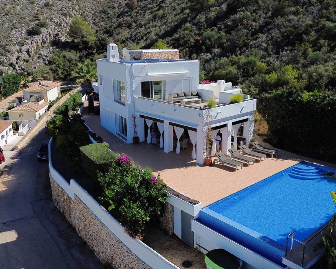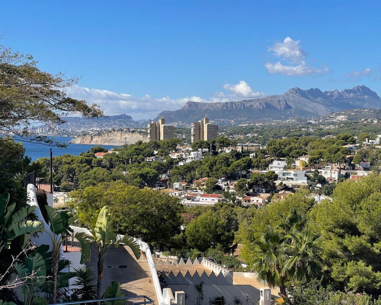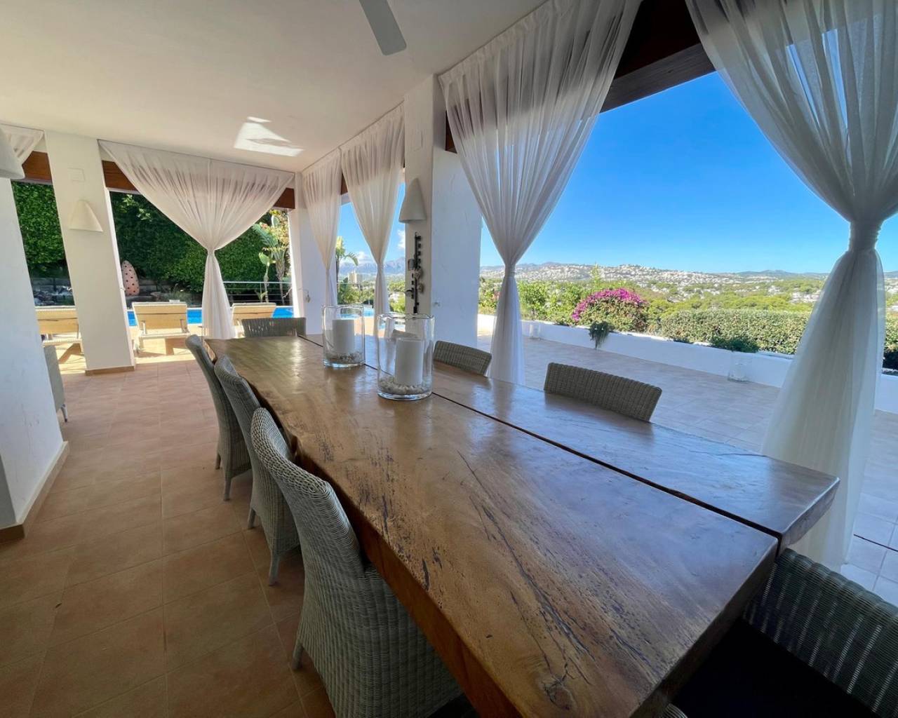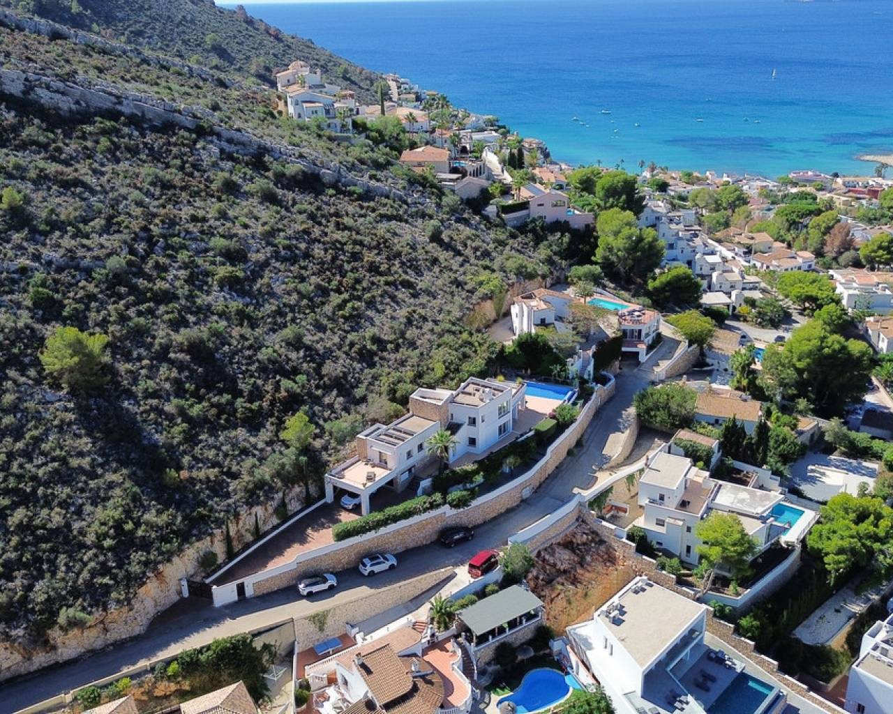 Villa consuelo, El Portet, Moraira. Villa Solace "La Villa Bond" Esta encantadora villa de estilo ibicenco es propiedad de dos productores de cine y teatro de renombre mundial, lo que da una pista de dónde proviene el nombre de esta villa. Los perales en la ladera sobre las villas vecinas miran hacia El Valle del Portet; esta villa podría ser el escenario de una película de James Bond, con espectaculares vistas panorámicas abiertas a las montañas de Benrnia y al mar azul turquesa. Al acercarse a Villa Solace, las puertas de entrada automatizadas de metal arquitectónico se abren y revelan un camino largo y amplio que lo lleva a una cochera espaciosa y a la entrada principal de esta exquisita propiedad. Al ingresar, lo recibirá una entrada amplia y luminosa. Pasillo que se abre a una gran sala de estar con una chimenea central que crea un ambiente acogedor. El salón se conecta a la perfección con la terraza cubierta para comer junto a la piscina, perfecta para recibir invitados o relajarse junto al agua. Junto al salón, encontrará una cocina moderna totalmente equipada con un lavadero en la parte trasera. Esta cocina ofrece un cómodo acceso a la amplia terraza cubierta, un lugar ideal para cenar al aire libre, relajarse o simplemente disfrutar del impresionante entorno. La piscina infinita, enmarcada por arbustos y árboles maduros y bien cuidados, ofrece un entorno sereno para nadar tranquilamente y tomar el sol. Al subir al primer piso, descubrirá dos elegantes dormitorios, cada uno con baño privado, armarios empotrados y aire acondicionado para mayor comodidad. Uno de estos dormitorios cuenta con acceso a una amplia terraza, lo que permite relajarse al aire libre en privado. El nivel superior de la villa está dedicado al lujoso dormitorio principal, que cuenta con un baño en suite con una amplia ducha a ras de suelo. Aquí, puede relajarse en la bañera mientras contempla la impresionante vista a través de la ventana panorámica diseñada especialmente. El dormitorio principal es excepcionalmente espacioso y luminoso, y también ofrece acceso a una gran terraza en la azotea donde podrá disfrutar de vistas panorámicas realmente impresionantes. El diseño interior combina maravillosamente paredes encaladas de piedra arenisca natural con vigas de madera y traviesas de jardín, encarnando la esencia de una villa de calidad ibicenca ubicada en la atractiva zona de El Portet de Moraira. Esta encantadora propiedad promete un estilo de vida sofisticado y tranquilo, perfecto para aquellos Buscando elegancia, comodidad y un entorno espectacular.