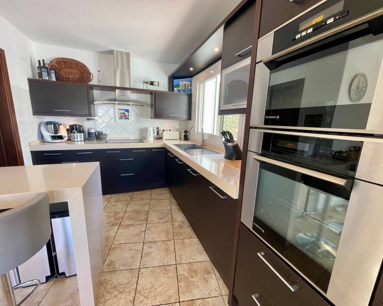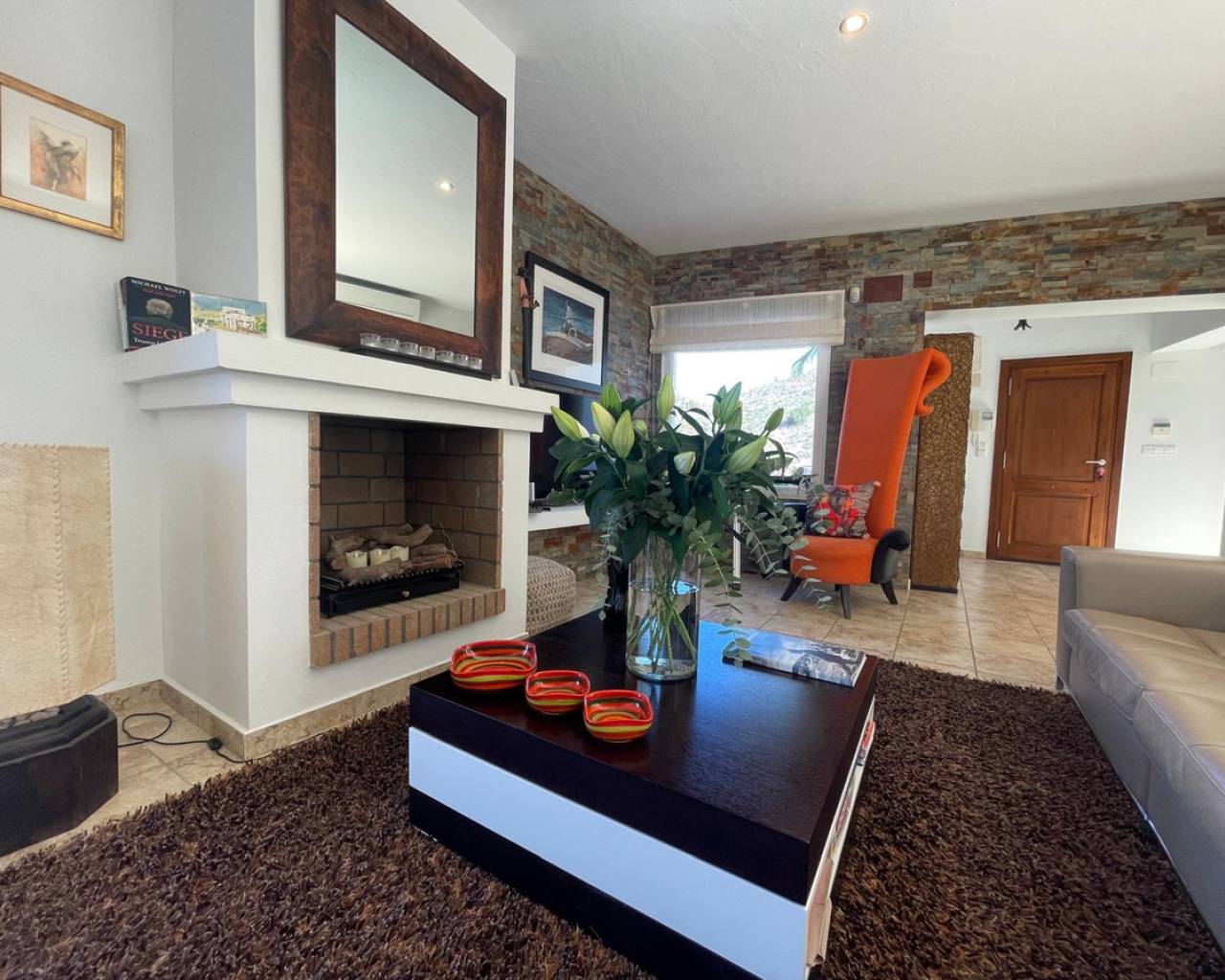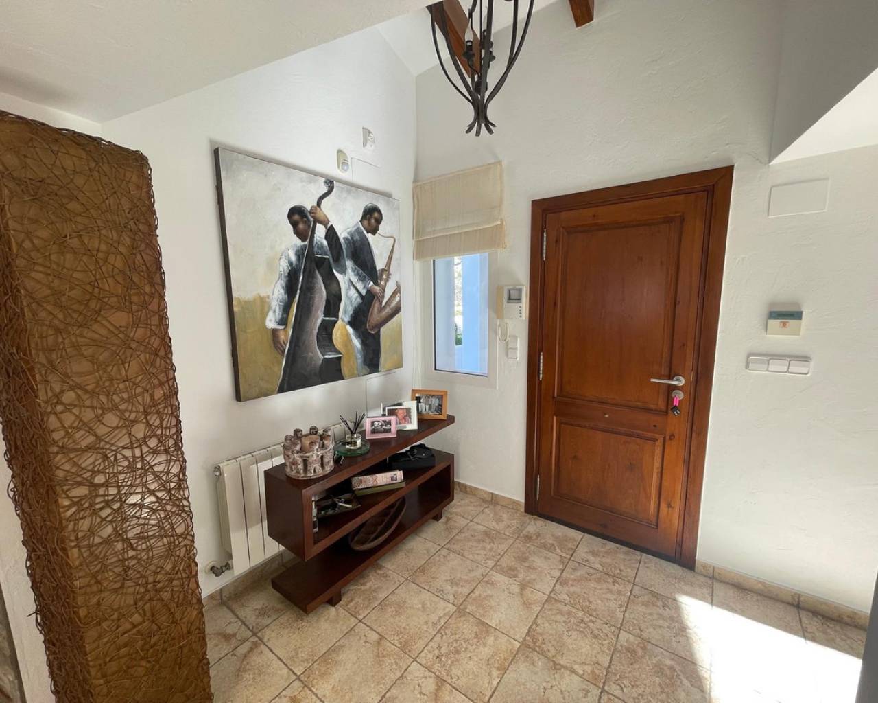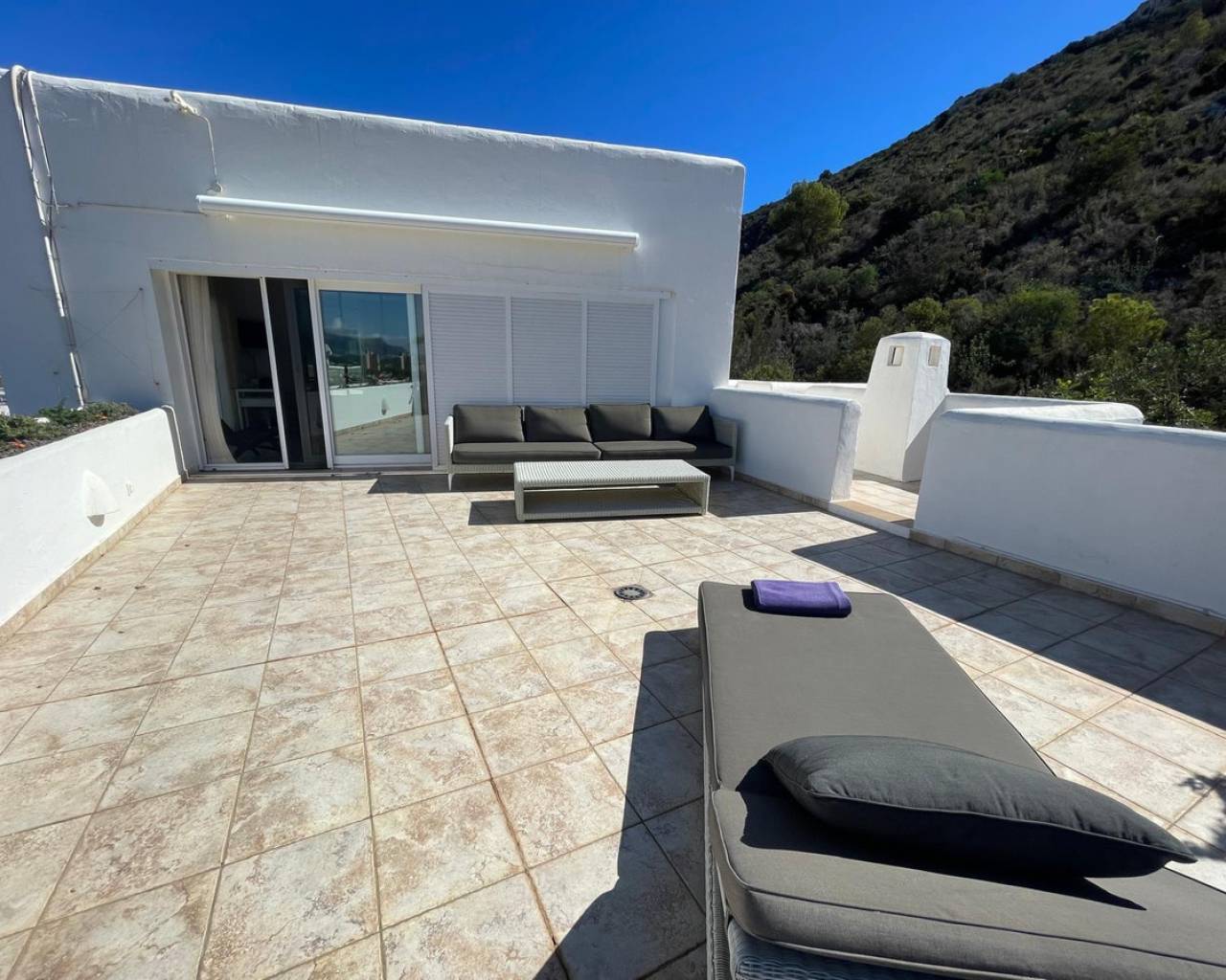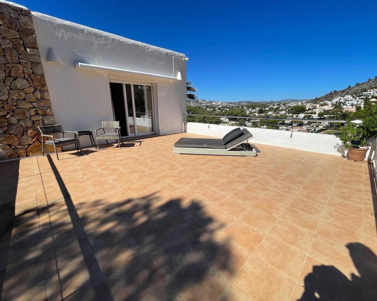 Villa consuelo, El Portet, Moraira. Villa Solace "La Villa Bond" Esta encantadora villa de estilo ibicenco es propiedad de dos productores de cine y teatro de renombre mundial, lo que da una pista de dónde proviene el nombre de esta villa. Los perales en la ladera sobre las villas vecinas miran hacia El Valle del Portet; esta villa podría ser el escenario de una película de James Bond, con espectaculares vistas panorámicas abiertas a las montañas de Benrnia y al mar azul turquesa. Al acercarse a Villa Solace, las puertas de entrada automatizadas de metal arquitectónico se abren y revelan un camino largo y amplio que lo lleva a una cochera espaciosa y a la entrada principal de esta exquisita propiedad. Al ingresar, lo recibirá una entrada amplia y luminosa. Pasillo que se abre a una gran sala de estar con una chimenea central que crea un ambiente acogedor. El salón se conecta a la perfección con la terraza cubierta para comer junto a la piscina, perfecta para recibir invitados o relajarse junto al agua. Junto al salón, encontrará una cocina moderna totalmente equipada con un lavadero en la parte trasera. Esta cocina ofrece un cómodo acceso a la amplia terraza cubierta, un lugar ideal para cenar al aire libre, relajarse o simplemente disfrutar del impresionante entorno. La piscina infinita, enmarcada por arbustos y árboles maduros y bien cuidados, ofrece un entorno sereno para nadar tranquilamente y tomar el sol. Al subir al primer piso, descubrirá dos elegantes dormitorios, cada uno con baño privado, armarios empotrados y aire acondicionado para mayor comodidad. Uno de estos dormitorios cuenta con acceso a una amplia terraza, lo que permite relajarse al aire libre en privado. El nivel superior de la villa está dedicado al lujoso dormitorio principal, que cuenta con un baño en suite con una amplia ducha a ras de suelo. Aquí, puede relajarse en la bañera mientras contempla la impresionante vista a través de la ventana panorámica diseñada especialmente. El dormitorio principal es excepcionalmente espacioso y luminoso, y también ofrece acceso a una gran terraza en la azotea donde podrá disfrutar de vistas panorámicas realmente impresionantes. El diseño interior combina maravillosamente paredes encaladas de piedra arenisca natural con vigas de madera y traviesas de jardín, encarnando la esencia de una villa de calidad ibicenca ubicada en la atractiva zona de El Portet de Moraira. Esta encantadora propiedad promete un estilo de vida sofisticado y tranquilo, perfecto para aquellos Buscando elegancia, comodidad y un entorno espectacular.