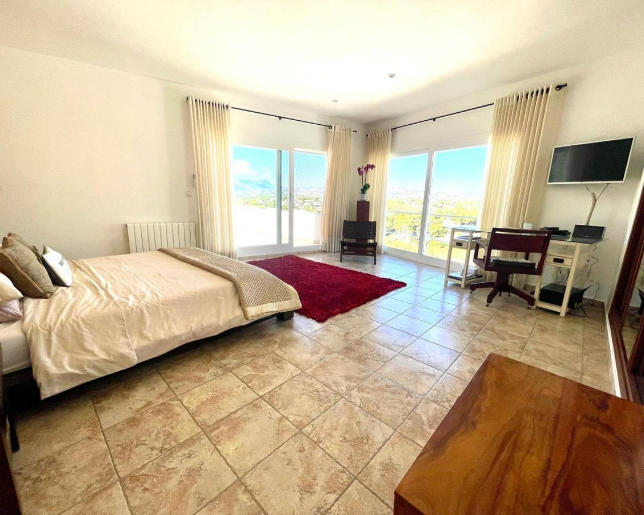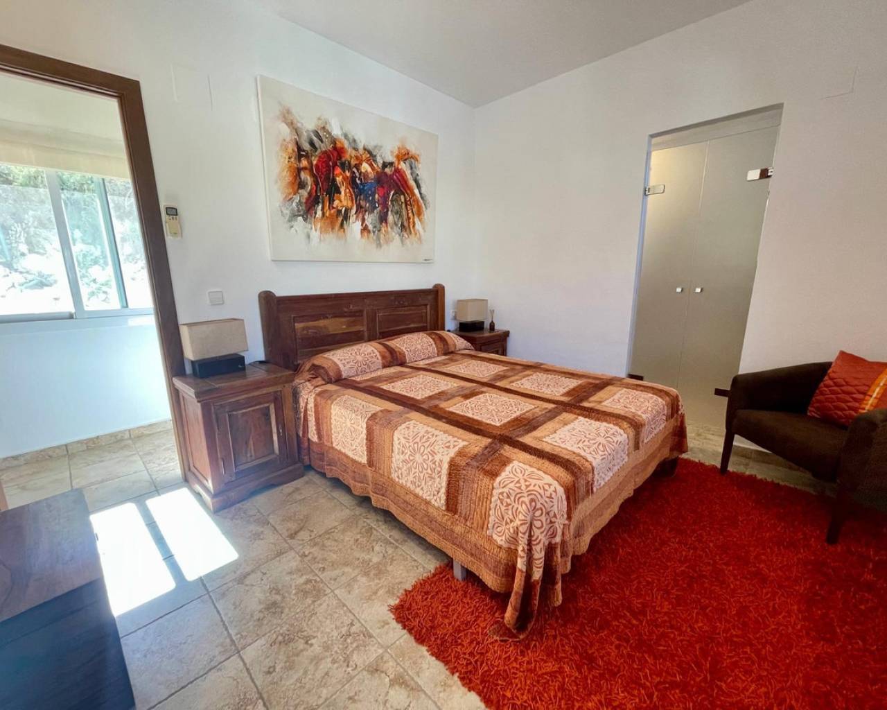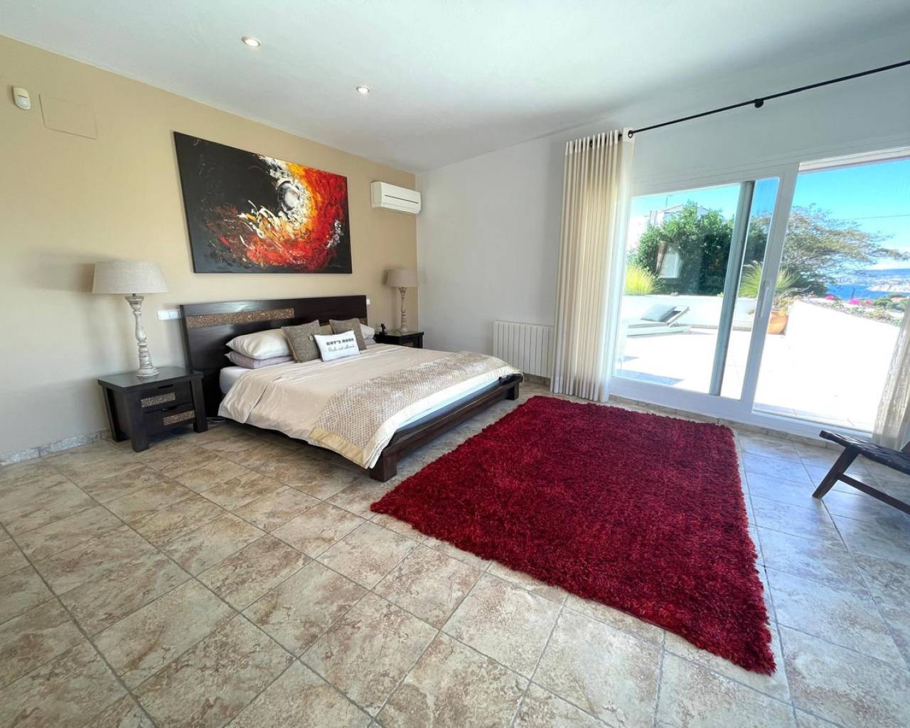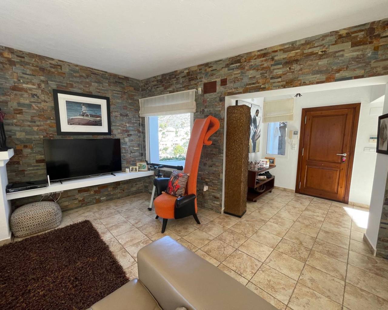 Villa consuelo, El Portet, Moraira. Villa Solace "La Villa Bond" Esta encantadora villa de estilo ibicenco es propiedad de dos productores de cine y teatro de renombre mundial, lo que da una pista de dónde proviene el nombre de esta villa. Los perales en la ladera sobre las villas vecinas miran hacia El Valle del Portet; esta villa podría ser el escenario de una película de James Bond, con espectaculares vistas panorámicas abiertas a las montañas de Benrnia y al mar azul turquesa. Al acercarse a Villa Solace, las puertas de entrada automatizadas de metal arquitectónico se abren y revelan un camino largo y amplio que lo lleva a una cochera espaciosa y a la entrada principal de esta exquisita propiedad. Al ingresar, lo recibirá una entrada amplia y luminosa. Pasillo que se abre a una gran sala de estar con una chimenea central que crea un ambiente acogedor. El salón se conecta a la perfección con la terraza cubierta para comer junto a la piscina, perfecta para recibir invitados o relajarse junto al agua. Junto al salón, encontrará una cocina moderna totalmente equipada con un lavadero en la parte trasera. Esta cocina ofrece un cómodo acceso a la amplia terraza cubierta, un lugar ideal para cenar al aire libre, relajarse o simplemente disfrutar del impresionante entorno. La piscina infinita, enmarcada por arbustos y árboles maduros y bien cuidados, ofrece un entorno sereno para nadar tranquilamente y tomar el sol. Al subir al primer piso, descubrirá dos elegantes dormitorios, cada uno con baño privado, armarios empotrados y aire acondicionado para mayor comodidad. Uno de estos dormitorios cuenta con acceso a una amplia terraza, lo que permite relajarse al aire libre en privado. El nivel superior de la villa está dedicado al lujoso dormitorio principal, que cuenta con un baño en suite con una amplia ducha a ras de suelo. Aquí, puede relajarse en la bañera mientras contempla la impresionante vista a través de la ventana panorámica diseñada especialmente. El dormitorio principal es excepcionalmente espacioso y luminoso, y también ofrece acceso a una gran terraza en la azotea donde podrá disfrutar de vistas panorámicas realmente impresionantes. El diseño interior combina maravillosamente paredes encaladas de piedra arenisca natural con vigas de madera y traviesas de jardín, encarnando la esencia de una villa de calidad ibicenca ubicada en la atractiva zona de El Portet de Moraira. Esta encantadora propiedad promete un estilo de vida sofisticado y tranquilo, perfecto para aquellos Buscando elegancia, comodidad y un entorno espectacular.