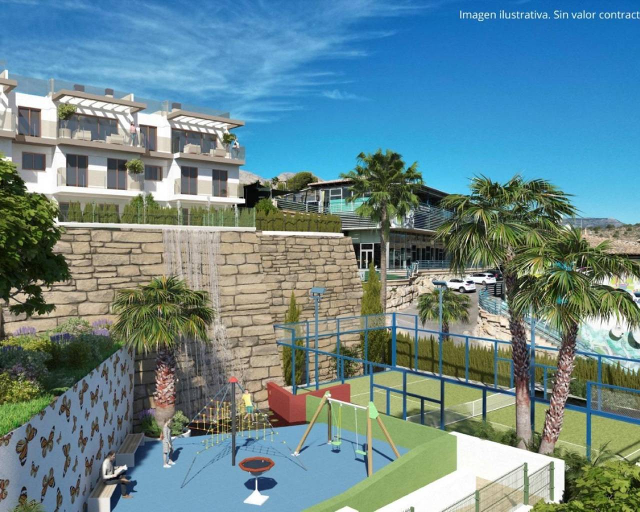 Nuevas villas adosadas de estilo mediterráneo en La NuciaNuevo proyecto de 28 villas, situado en un enclave excepcional y con unas vistas panorámicas extraordinarias a las bahías de Albir y Benidorm. Inmerso en un paisaje mediterráneo idílico y con todos los servicios cercanos, este proyecto supone el renacer de una forma de vida confortable, saludable y segura.Un conjunto de 28 villas adosadas, pareadas o aisladas, en los que la construcción cumplirá con los exigentes Eurocódigos y normas nacionales, y las obras serán certificadas por organismos independientes de control técnico (OCT) y dirigidas por técnicos acreditados por sus respectivos colegios profesionales.El diseño ha sido adaptado para ofrecer una estética contemporánea de inspiración mediterránea, atractiva y serena. Los tonos blancos tradicionales de la Marina se matizan y encuadran con tonos cálidos. Soluciones innovadoras y avanzadas se combinan con materiales tradicionales de gran durabilidad de forma armoniosa, buscando un desempeño fiable a largo plazo. Las distribuciones de las viviendas se transforman buscando el confort y un estilo de vida relajado, con una gran presencia de luz y vegetación autóctona que permita la continuidad del disfrute en el exterior. Se han observado principios de sostenibilidad en cuanto a consumo energético e hídrico y eficiencia de los sistemas de climatización, ventilación y riego.Construidas con las mejores calidades, incluyen: carpintería exterior de PVC con rotura del puente térmico, cristales dobles, carpintería interior lacada y armarios empotrados, aire acondicionado por conductos, agua caliente por aerotermia, etc.Urbanización con piscina comunitaria, pista de pádel y parque infantil.Situadas en la zona de urbanizaciones de La Nucia, a medio camino entre esta población y Benidorm. Bien comunicadas por carretera CV-70, a 10 minutos de Benidorm, sus playas y centros comerciales.Fecha de entrega prevista: Septiembre 2025