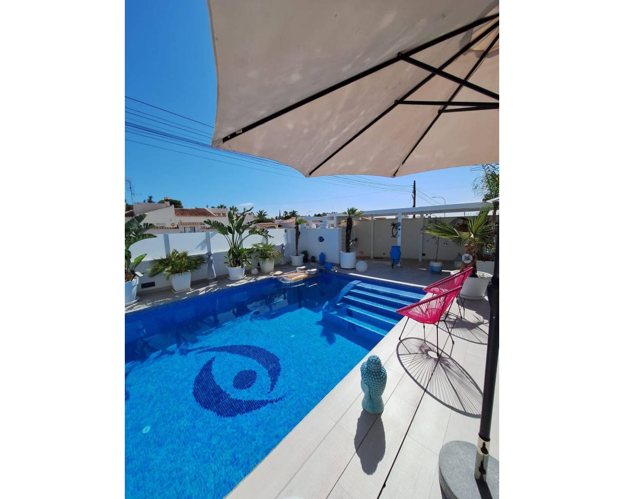 Se vende magnifico chalet 130m2 / 400m de terreno / 3 dormitorios / 2 baños / piscina climatizada 4X8 / aire acondicionado individual para cada habitación / suelo radiante en baños / video portero / puerta eléctrica / domótica / se vende completamente amueblado y plantado / cocina de verano / porche y cochera El Chaparral Torrevieja