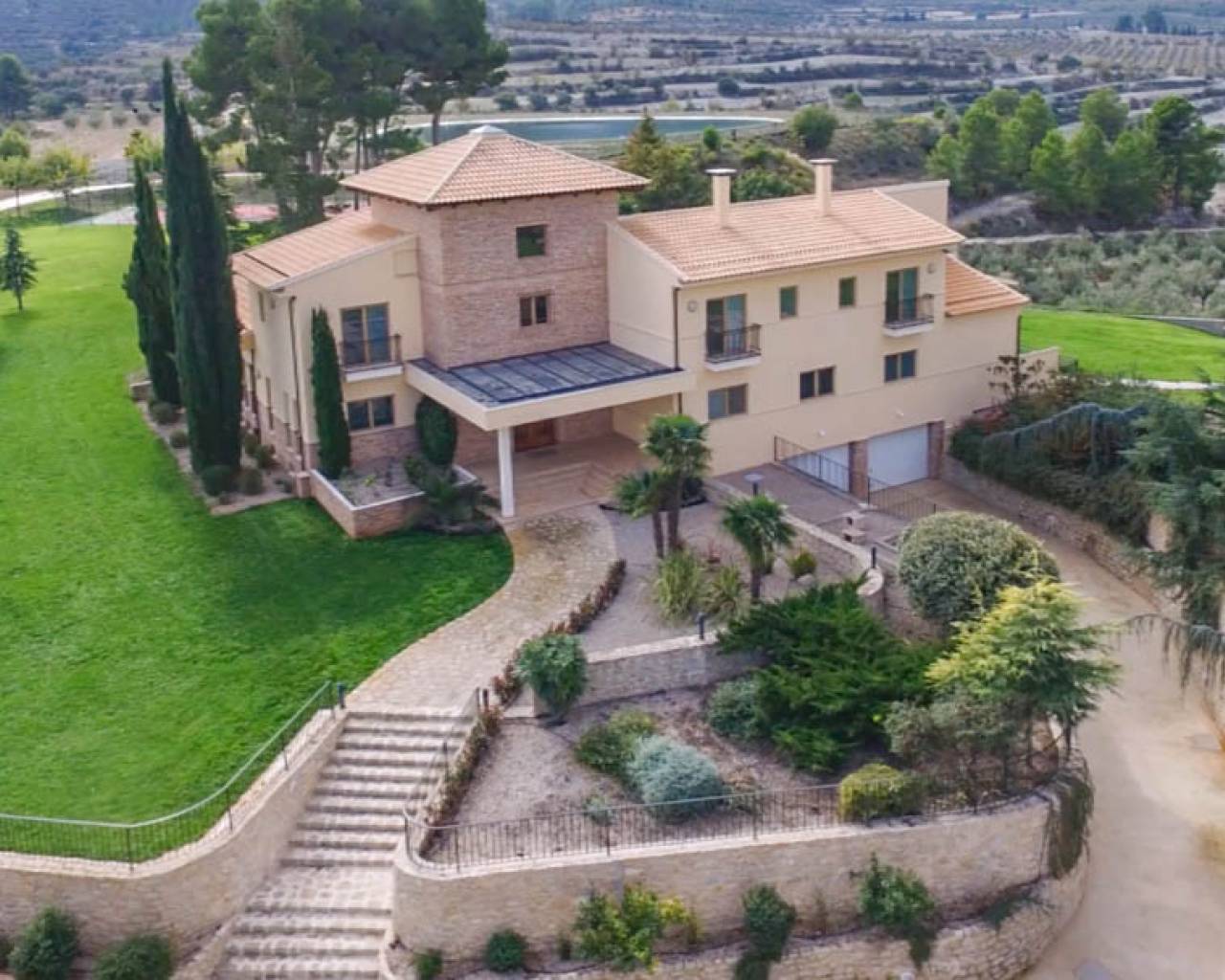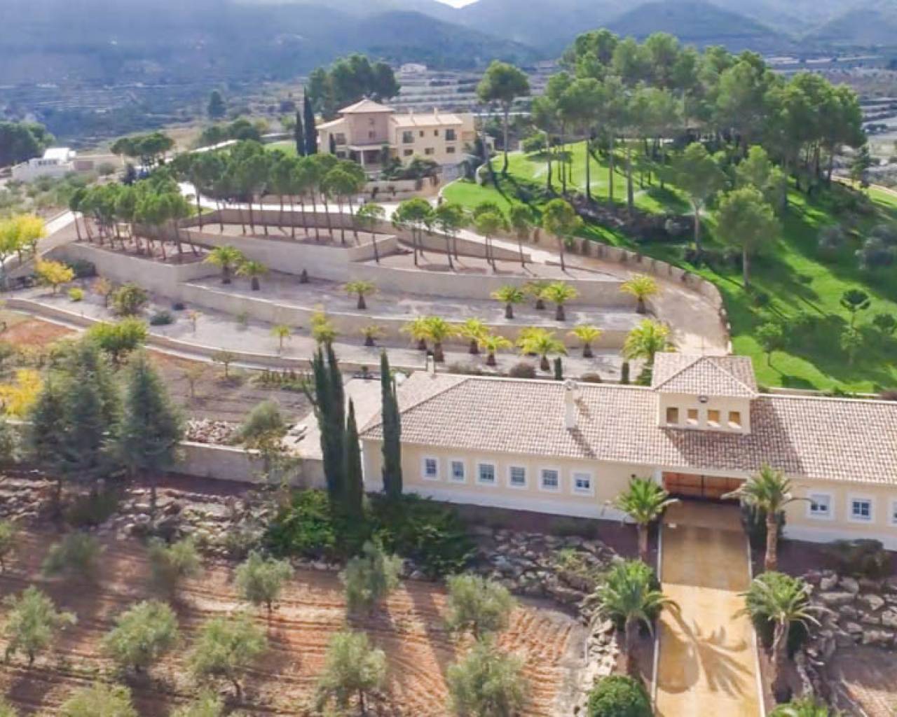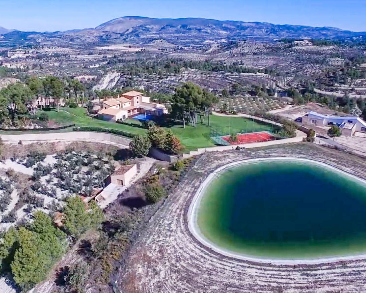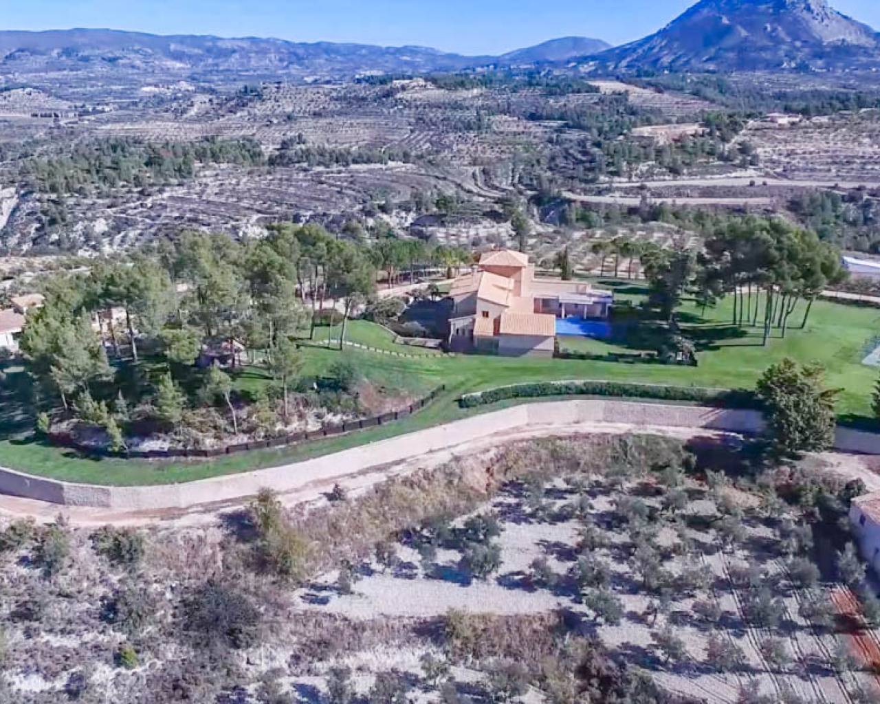 Esta hermosa Finca con villa de nueva construcción, la casa del portero, el almacén y una antigua ruina tienen una superficie total construida de 1.529 m2 en una parcela vallada de 22.420 m2, dentro de un área privada de 350.000 m2. La finca está rodeada de hermosas montañas, valles y campos, con el privilegio de contar con un suministro inagotable de agua de manantial. Esta hermosa finca se encuentra a sólo 50 minutos del mar Mediterráneo. Perfecta para una especie de retiro de yoga debido a todos los elementos naturales presentes. La villa se distribuye en 3 plantas. Hay un enorme garaje subterráneo con áreas técnicas. En la planta baja hay un hall de entrada con escalera, una oficina, un enorme dormitorio principal con vestidor y un amplio cuarto de baño, un lavadero, una gran cocina con trastero y una cámara frigorífica, un comedor, una sala de estar y un amplio espacio de vida con un hermoso techo alto de madera. Tanto el espacio de estar como el dormitorio principal y los pasillos tienen acceso a la terraza con una bonita piscina. En la parte trasera del jardín hay una pista de tenis iluminada. Detrás del lavadero, en una ladera, hay un bonito cenador, ideal para hacer las veces de bar al aire libre. En la 1ª planta hay una espaciosa escalera con un bonito techo de madera, 5 dormitorios y 5 baños en suite y un balcón. En la entrada de esta finca hay una hermosa casita grande con garaje, 3 dormitorios, cocina, sala de estar, una gran terraza, un trastero industrial para maquinaria agrícola, entre otros, etc. La casa principal está totalmente equipada y tiene la posibilidad de ampliar los edificios asociados, ideal para convertirla en un exclusivo hotel rural. El garaje tiene capacidad para unos 10 coches. La carpintería de toda la villa está realizada con materiales de alta calidad. Se ha solicitado permiso al ayuntamiento para convertirla en un hotel rural. Se han presentado planes para construir 25 casas de vacaciones adicionales que se integrarán plenamente en el bello entorno. También puede adaptarse para ofrecer diversos servicios adicionales, como un spa o centro de bienestar, eventos, bodas o reuniones de negocios. Además, la propia villa puede ampliarse con 10 habitaciones adicionales, hasta un total de 17 habitaciones. Actualmente hay una producción totalmente ecológica de aceitunas y almendras en la finca que proporciona ingresos adicionales, y una finca con posibilidades y potencial excepcionales. O simplemente disfrutar de total privacidad por sí mismo en este oasis de paz y hermosos campos vastos.