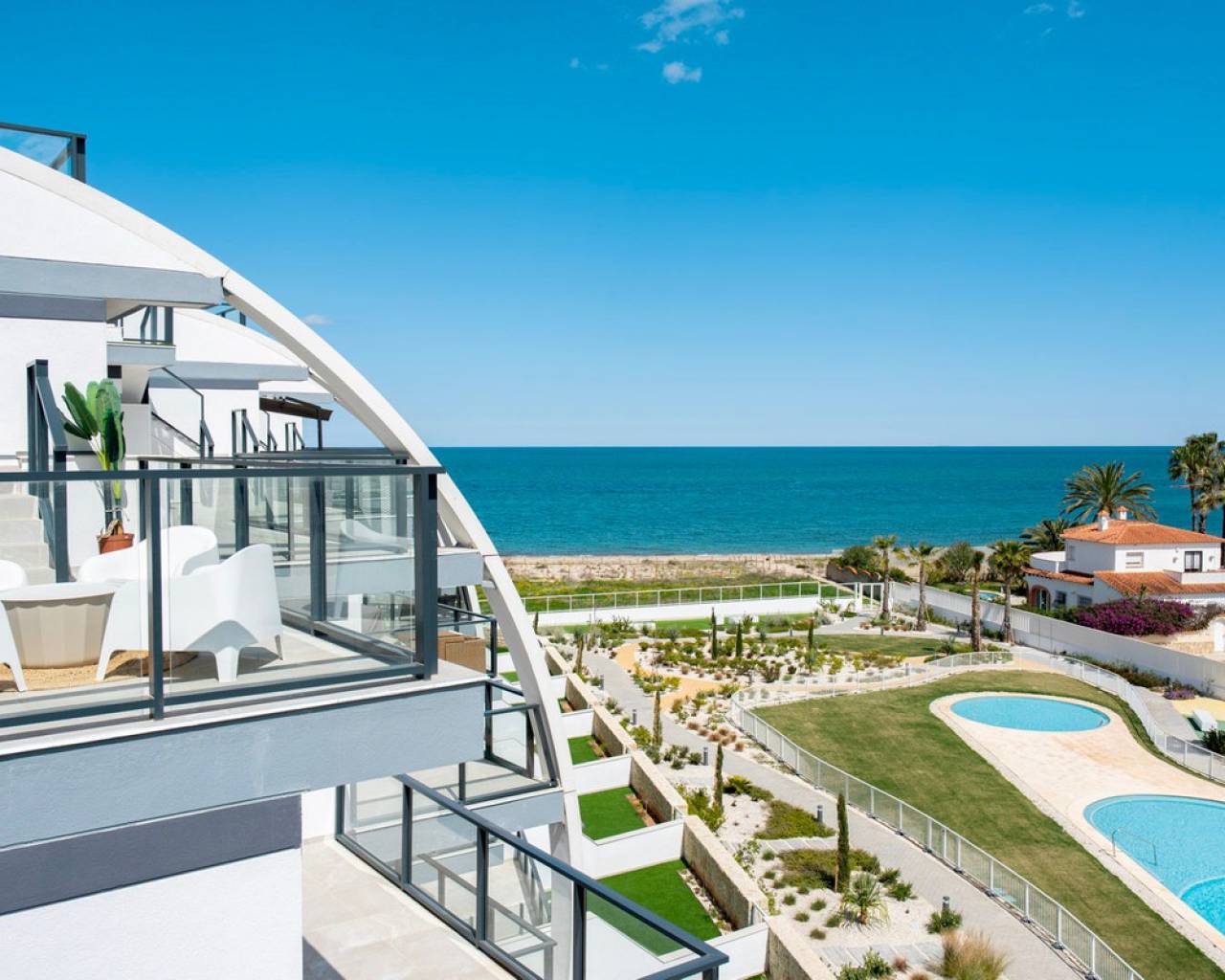 Fantástico ático de lujo con vistas panorámicas al mar, en primera línea de la playa de arena de Playa de la Almadraba, situado en el moderno complejo de Taylor Wimpey Bella Beach. Este exclusivo ático tiene impresionantes vistas al mar desde todas las habitaciones y también cuenta con una terraza en la azotea de nada menos que 94,85 m2 donde se puede disfrutar de espectaculares vistas de 360°. Al este, la costa se extiende hasta Gandía, al oeste las torres de la montaña del Montgó, al norte se ve directamente el mar y al sur tiene vistas a la impresionante Sierra de Segaria. Con una superficie útil de 84,90 m2 y una terraza de 51,46 m2 en la misma planta, este ático ofrece espacio y comodidad. Se accede a un elegante vestíbulo con un amplio dormitorio doble a la izquierda y un cuarto de baño a la derecha. El vestíbulo conduce a una sala de estar, donde la espectacular vista al mar llama inmediatamente la atención y donde las ventanas correderas dan acceso a la terraza. La moderna cocina, totalmente equipada, se encuentra junto al salón y también tiene acceso directo a la terraza. Más adelante en el pasillo hay un segundo dormitorio doble con conexión a la terraza y al final del pasillo está el dormitorio principal con baño en-suite, vestidor y también acceso directo a la terraza. El ático dispone de aire acondicionado para calefacción y refrigeración y todas las ventanas están equipadas con persianas eléctricas. Se vende completamente amueblado, lo que le permite mudarse inmediatamente. En la terraza también hay un práctico trastero y un armario empotrado con lavadora. Además, dispondrá de una plaza de aparcamiento privada y un trastero independiente de 7,15 m² en el garaje subterráneo. La ubicación es ideal: disfrutará de total tranquilidad y privacidad, mientras que la bulliciosa Denia con sus restaurantes de ambiente, tiendas y puerto deportivo está a sólo 15 minutos en coche. Este ático único es parte de un nuevo complejo terminado en 2024, dándole la oportunidad de tener en sus manos un piso de ensueño listo para entrar a vivir, tan bueno como nuevo. Póngase en contacto con nosotros hoy mismo para visitarlo.