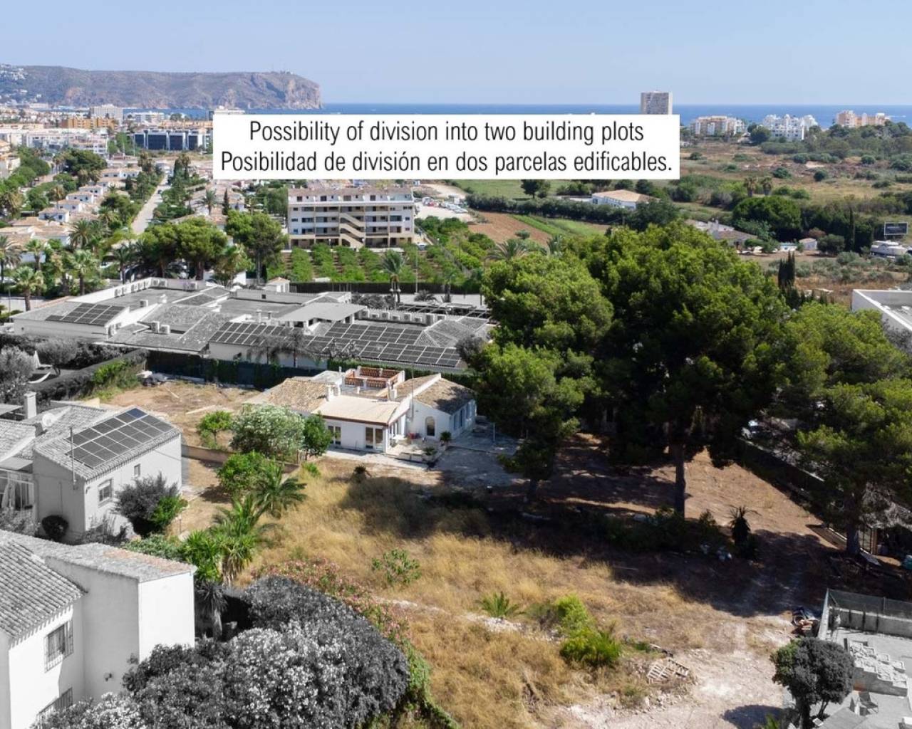 Parcela de 2.600 m2 con casa y posibilidad de división en dos parcelas edificables Esta parcela se encuentra a muy poca distancia de la playa de arena de Jávea y ofrece una excelente oportunidad de inversión. La parcela se puede dividir perfectamente en dos parcelas edificables independientes de unos 1.300 m2 cada una, aptas para realizar dos villas de lujo. Actualmente, la parcela contiene una villa de una sola planta con una superficie construida de 152 m². La propiedad cuenta con un salón con cocina abierta, un segundo salón-comedor con cocina cerrada, tres dormitorios, dos baños y un patio con trastero. Esta parcela se encuentra a poca distancia de la playa de arena de Jávea y goza de una excelente ubicación cerca de todos los servicios. Supermercados, restaurantes, consultas médicas, instalaciones deportivas y otras necesidades diarias se encuentran a poca distancia. Esta ubicación combina la privacidad con la comodidad de una ubicación céntrica.
