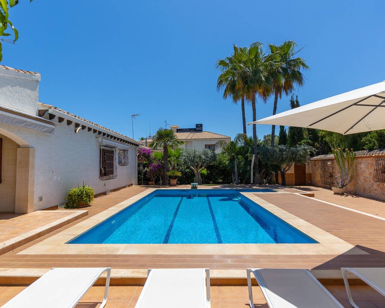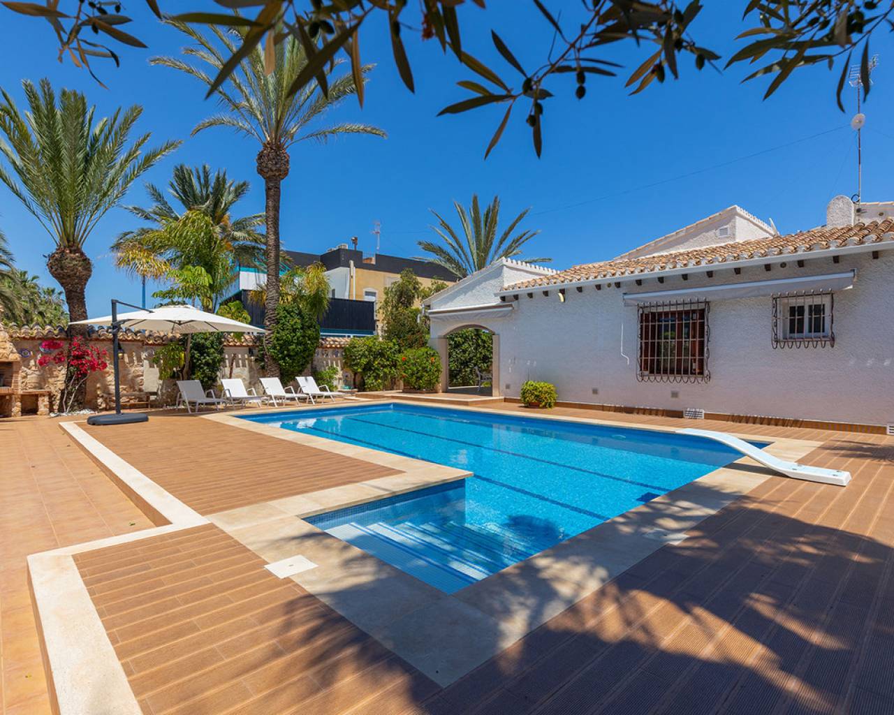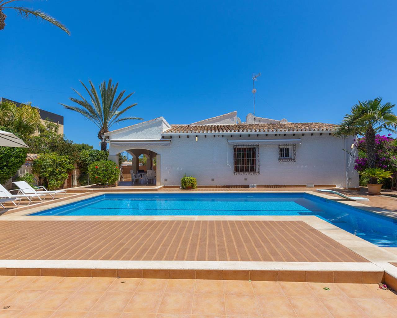 Presentamos esta encantadora villa situada en una de las zonas más privilegiadas de la Costa Blanca: Punta Prima, a tan solo unos pasos del mar. La vivienda cuenta con una superficie construida de 168 m², ubicada sobre una amplia parcela de 540 m², ofreciendo privacidad, comodidad y espacio para disfrutar al aire libre. La villa se distribuye en 4 amplios dormitorios, 2 baños completos, un luminoso salón-comedor con acceso directo al exterior y una moderna cocina americana totalmente equipada. En el exterior, la propiedad ofrece una magnífica piscina privada, zona de barbacoa, terrazas soleadas y un jardín mediterráneo – ideal para disfrutar del clima durante todo el año. Punta Prima es una zona costera consolidada, famosa por su acceso directo al mar, playas de arena fina, calas naturales y un entorno tranquilo. A poca distancia se encuentran todos los servicios necesarios: restaurantes, supermercados, farmacias, centros comerciales como La Zenia Boulevard, y una excelente conexión con las principales vías de comunicación. A tan solo 10 minutos en coche del centro de Torrevieja y rodeada de campos de golf, centros deportivos y zonas verdes.