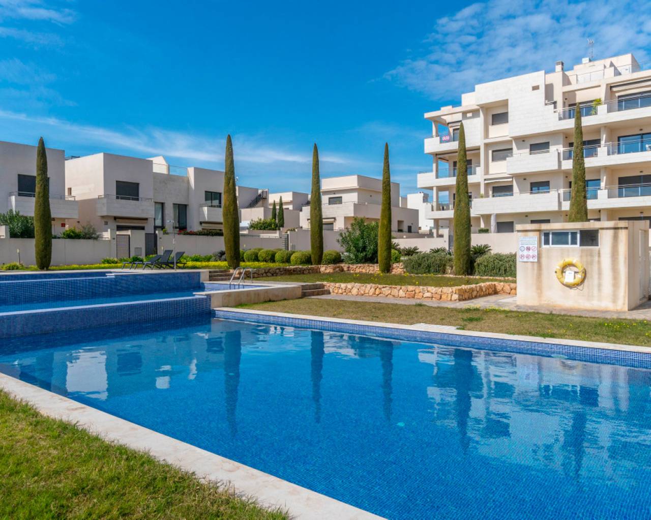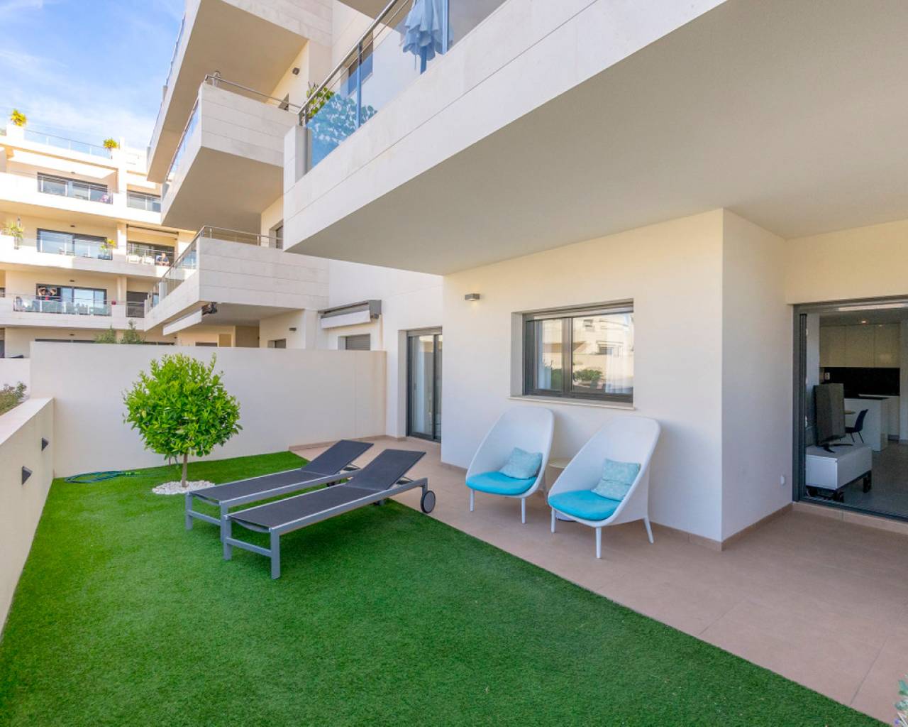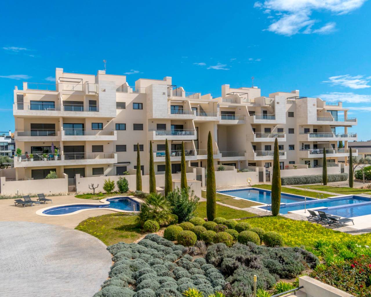 Moderno apartamento en Jardines de Montesolana, Orihuela Costa. Apartamento distribuido en dos habitaciones y dos baños. Dispone de un amplio salón-comedor con cocina americana y acceso directo al amplio jardín de 43m2 con vistas a las zonas comunes del residencial con orientación sur. Se encuentra en la urbanización de Jardines de Montesolana que dispone de piscina comunitaria y zonas ajardinadas. Este residencial se encuentra cerca del Centro Comercial La Zenia Boulevard (Orihuela Costa). La Zenia está cerca de Cabo Roig, Campoamor y Playa Flamenca. Se trata de una zona de cultivo, cerca de todas las comodidades y el famoso centro comercial La Zenia Boulevard. A pocos minutos de la N -332 y la autopista del Mediterráneo AP-7 en dirección Alicante y Cartagena. También existen alrededor de los campos de golf de Villamartín, Las Ramblas, Campoamor y Las Colinas.
