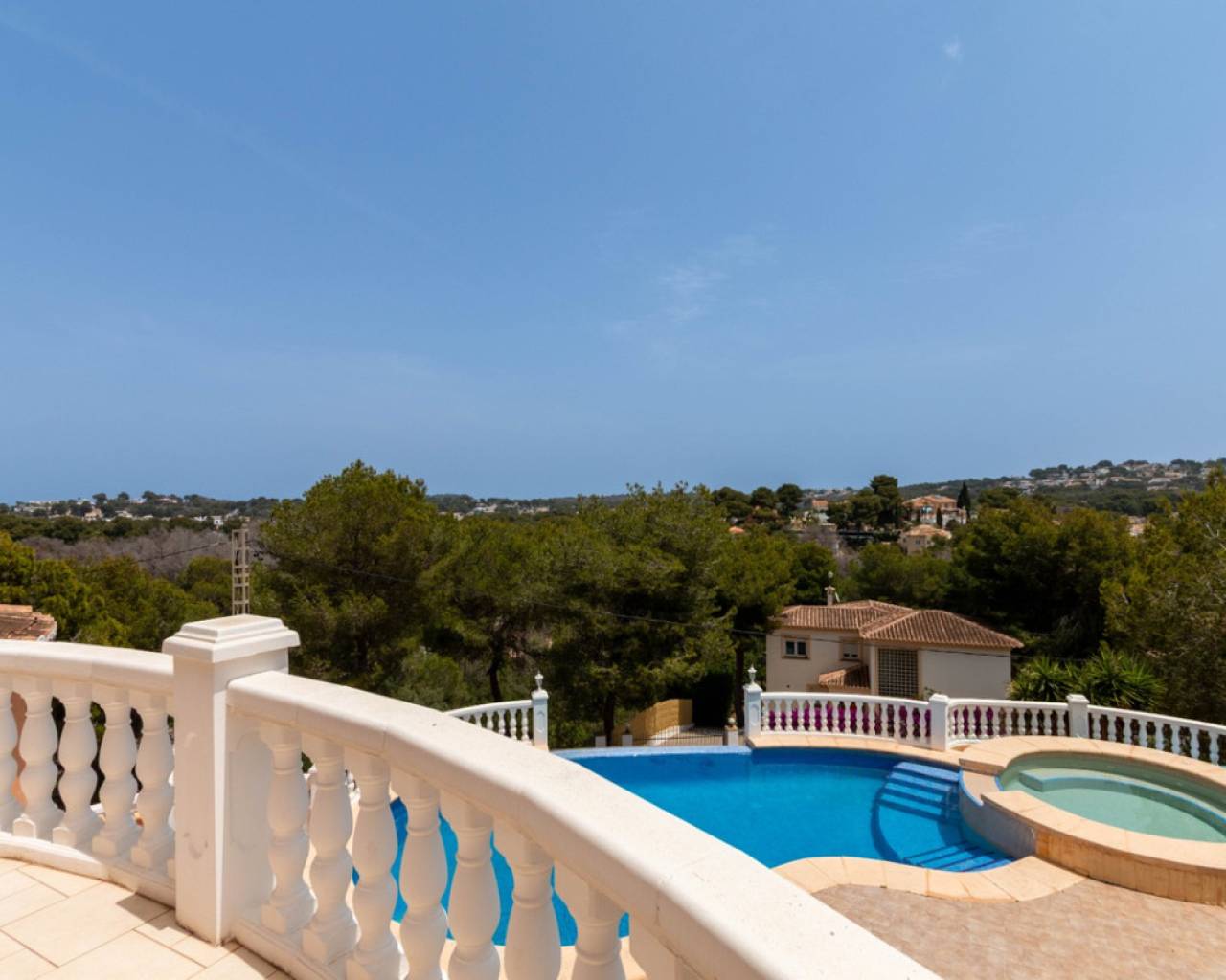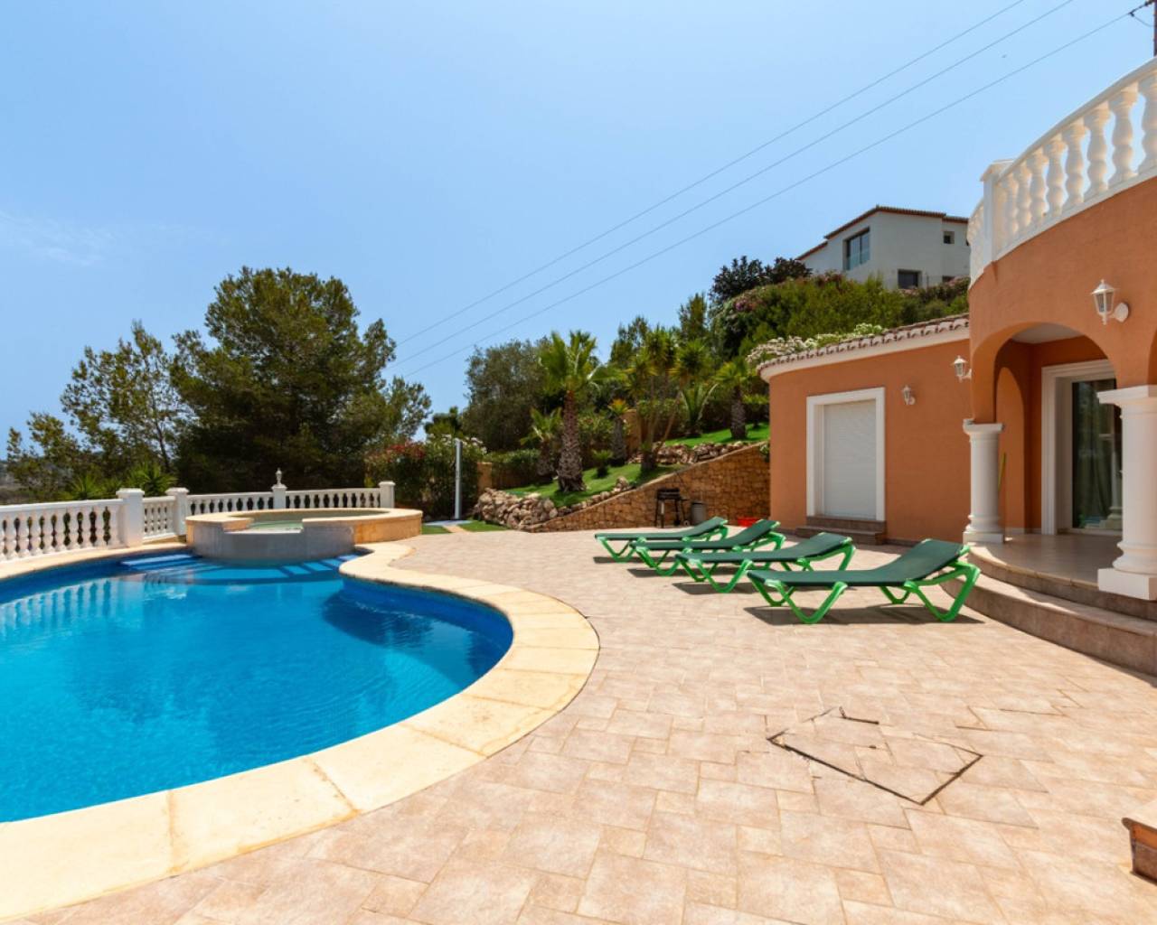 Lavadero, suelo radiante a gas, muro de contención de piedra natural, aparcamiento, piscina desbordante de 8x4 en forma de riñón y depósito de agua de 10.000 litros.