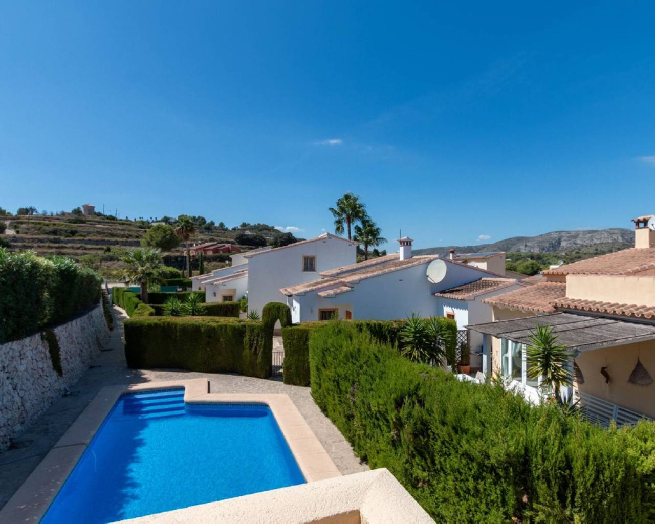 Chalet en una sola planta con piscina comunitaria compartida entre cuatro villas.