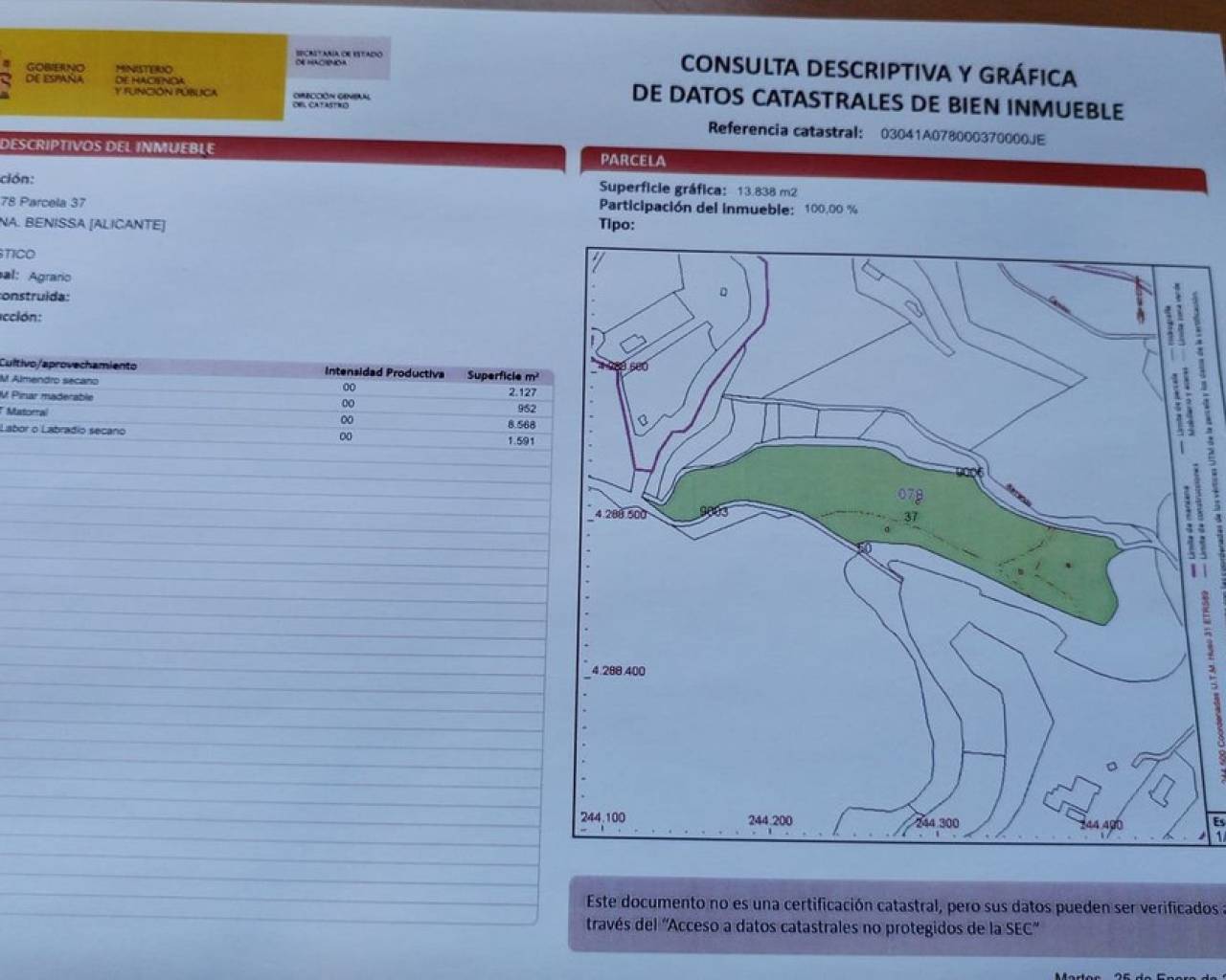 Se vende excelente finca de 13.838 m² en zona muy tranquila, cerca de Benissa con vistas a la montaña. a) Almendro secano 2.127 m² b) Pinar maderable 952 m² c) Matorral 8.568 m² d) Labor o Labradío secano 1.591 m²