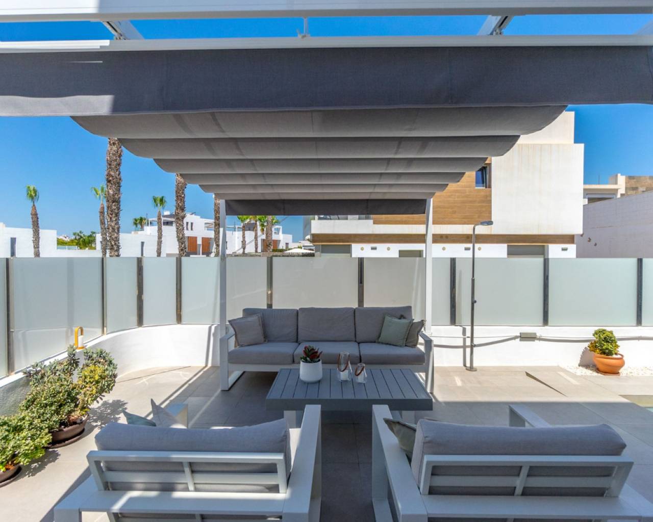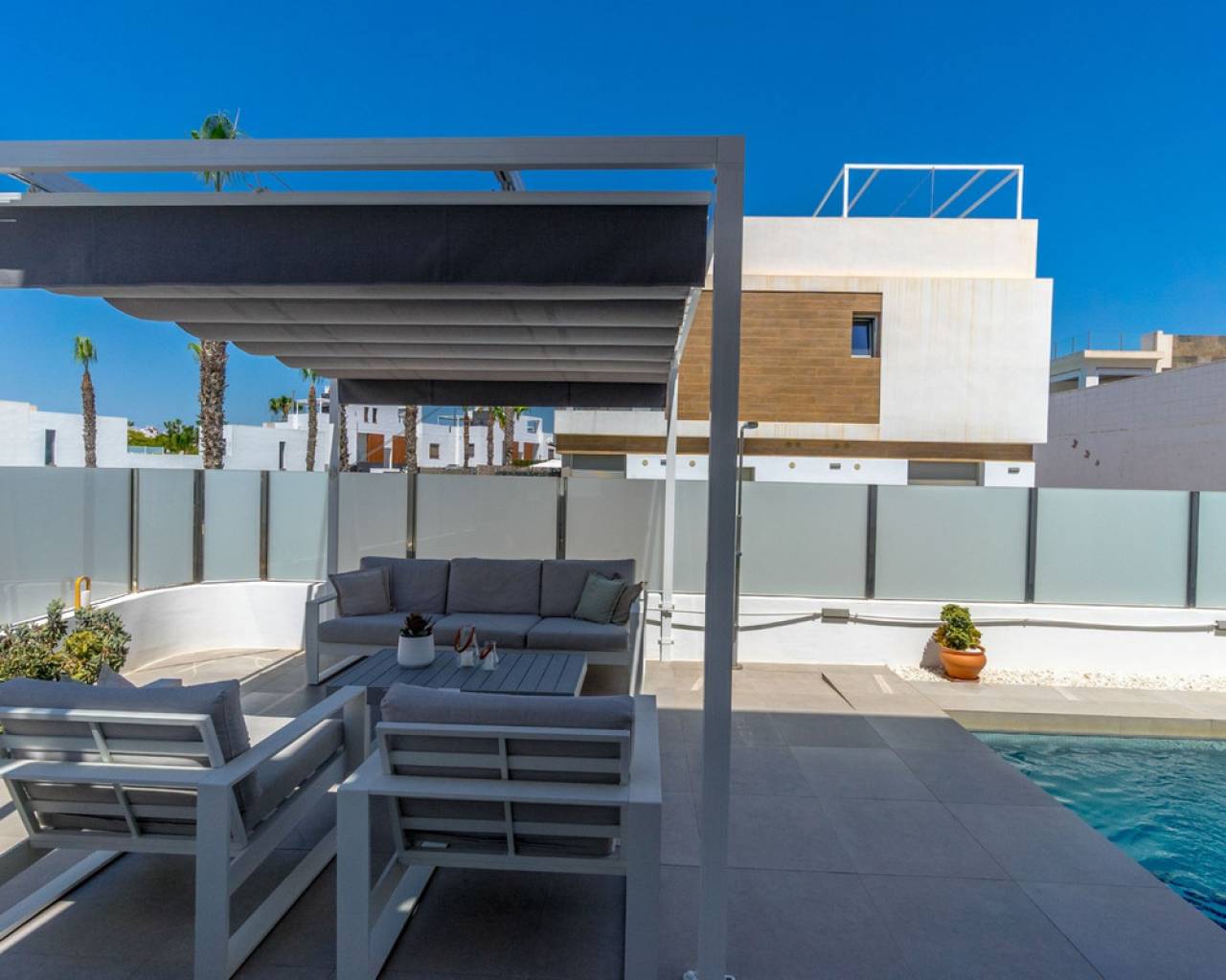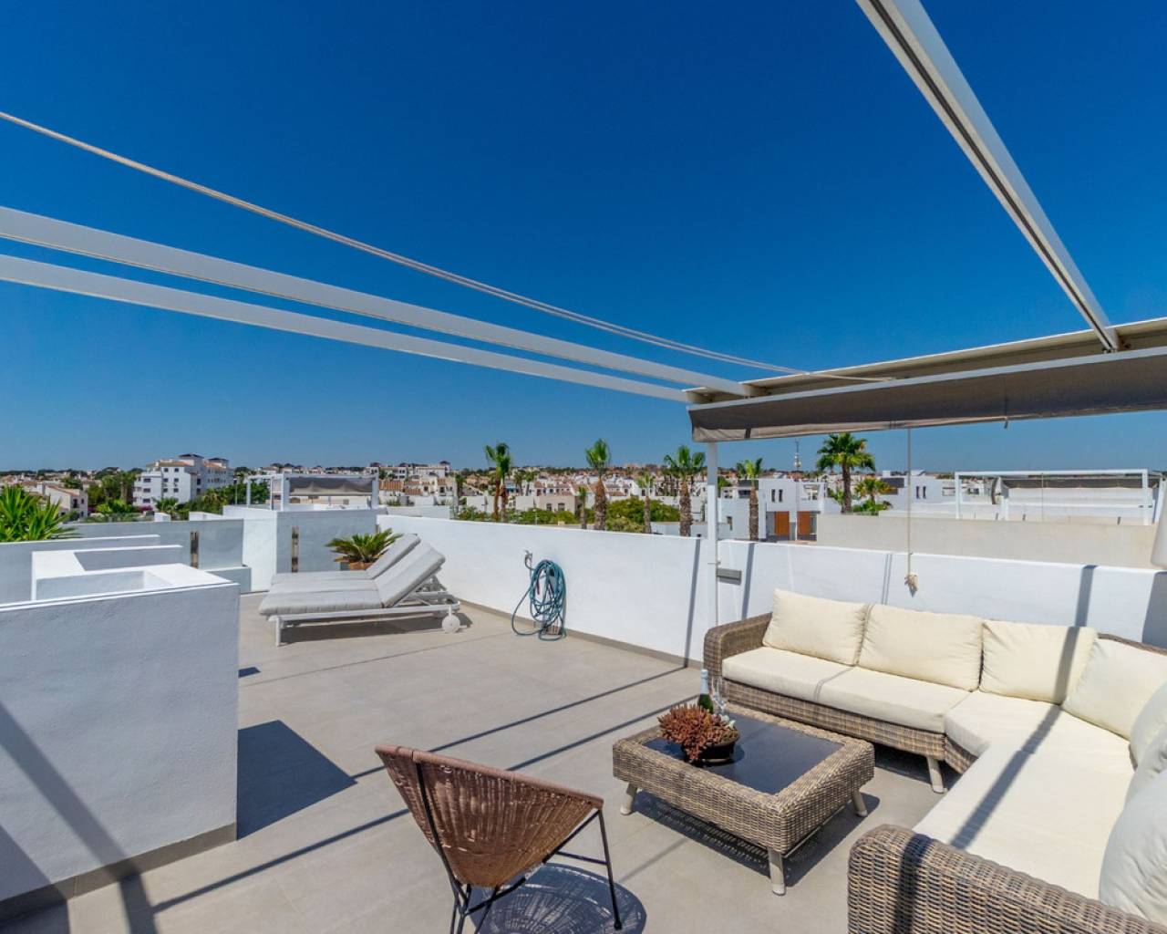 Esta hermosa villa, construida en 2018 y en buen estado, es un hogar ideal para quienes buscan comodidad y un estilo de vida soleado en la Costa Blanca. Con orientación suroeste, podrás disfrutar de días y noches soleadas. La propiedad está completamente amueblada, lo que la deja lista para entrar a vivir de inmediato. La propiedad ofrece: 3 amplios dormitorios 3 baños modernos, cada uno cuenta con calefacción por suelo radiante. Superficie habitable: 199 m² Parcela: 204 m² Terrazas: La villa cuenta con varias zonas exteriores privadas: El dormitorio principal tiene una terraza privada de 6.58 m². Además, hay una espaciosa azotea de 47.06 m² que ofrece espacio exterior adicional y oportunidades para tomar el sol y disfrutar de las vistas. Esta cuenta también con una cocina exterior con suministro de agua. Piscina privada climatizada para disfrutar todo el año Parking privado con espacio para 2 coches Interior y distribución: En la planta baja encontrarás un salón-cocina de concepto abierto, perfecto para socializar. Desde esta planta también tienes acceso directo a la piscina y a la zona exterior inferior, lo que facilita disfrutar de los días soleados. Esta planta también cuenta con un baño. Subiendo a la segunda planta encontrarás tres dormitorios y dos baños. El dormitorio principal tiene un baño en-suite propio, que proporciona privacidad y comodidad adicionales. Desde la segunda planta también hay acceso a la fantástica azotea. Las instalaciones y características incluyen: Vistas al mar y a la piscina Sistema de alarma y puerta reforzada para mayor seguridad Iluminación exterior e interior Persianas eléctricas Aire acondicionado central y calefacción central Intercomunicador Trastero Armarios empotrados Acceso a zonas verdes comunes y piscina comunitaria (además de la privada) La zona de Villamartín Villamartín es una urbanización bien desarrollada y cosmopolita en la Costa Blanca Sur, conocida por su vibrante comunidad y excelentes instalaciones. La zona presume de alrededor de 320 días de sol al año y una temperatura media anual de aproximadamente 20°C, lo que contribuye a un agradable clima mediterráneo durante todo el año. Villamartín es un paraíso para los amantes del golf. Aquí encontrarás el histórico Campo de Golf Villamartín, inaugurado en 1972 y diseñado por Robert Dean Puttman. Este campo de 18 hoyos (par 72) es reconocido como uno de los mejores de la región, y ha sido sede de rondas clasificatorias para el European Tour. El campo se caracteriza por su vegetación madura y ofrece fantásticas vistas al mar. El restaurante de la casa club también tiene una terraza en la azotea con excelentes vistas al hoyo 18. Además de Villamartín Golf, hay otros campos de golf reconocidos en las inmediaciones, incluidos Las Ramblas Golf, Las Colinas Golf & Country Club, La Finca Golf y Lo Romero Golf. La zona también es conocida por su animado ambiente con una variedad de restaurantes, bares y tiendas. La famosa Villamartín Plaza es un punto de encuentro popular con una amplia selección de opciones gastronómicas y de ocio. Grandes centros comerciales como Zenia Boulevard también se encuentran cerca. Las hermosas playas a lo largo de Orihuela Costa, incluidas las playas con "Bandera Azul" como La Zenia, Playa Flamenca y Cabo Roig, están a poca distancia en coche. Esta villa es perfecta para quienes buscan una combinación de privacidad, golf y fácil acceso a todo lo que Villamartín y la Costa Blanca tienen para ofrecer.