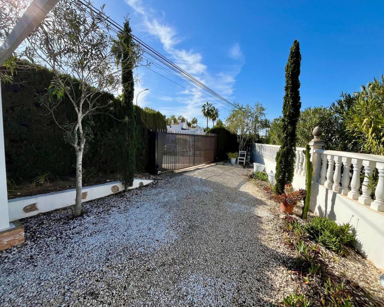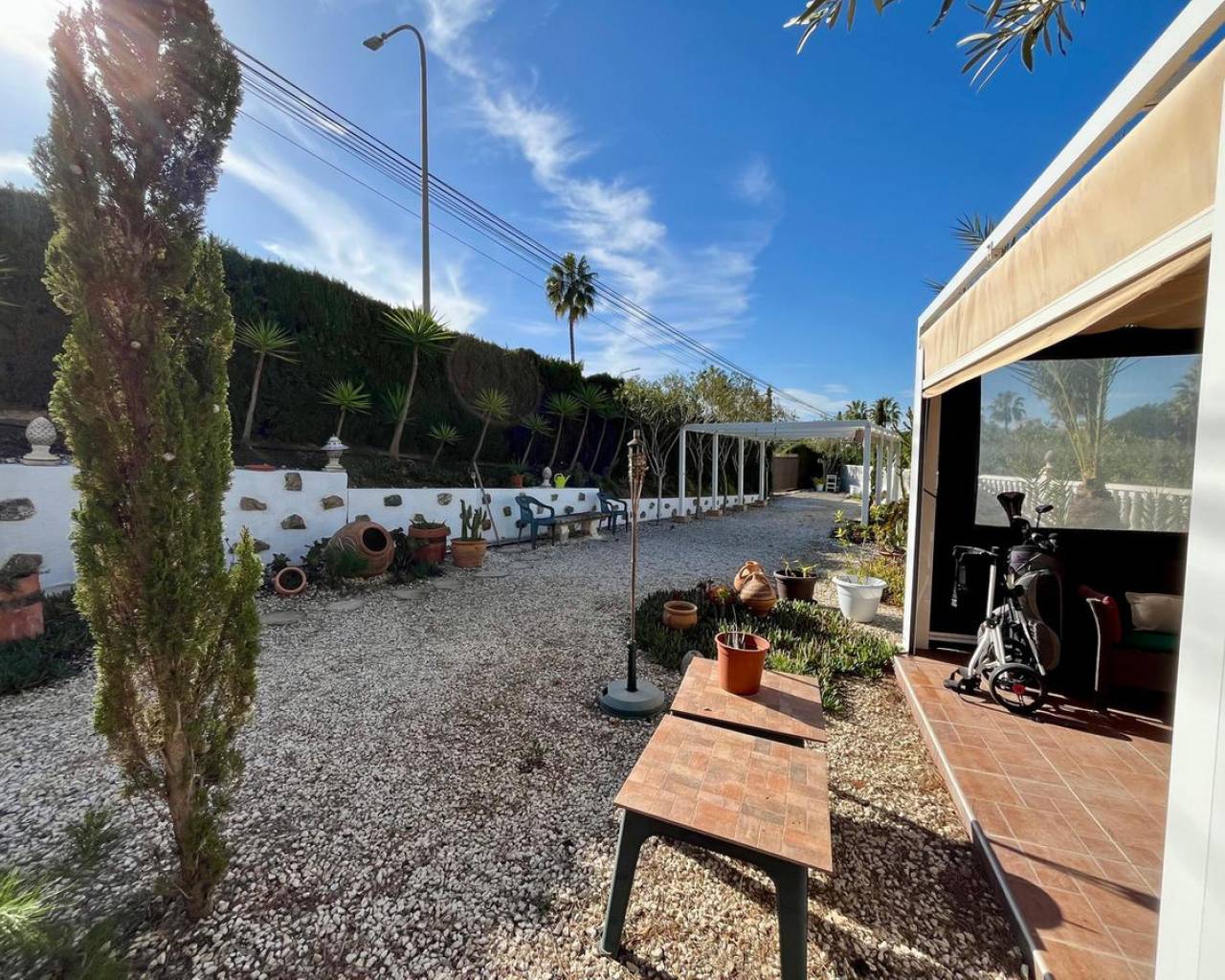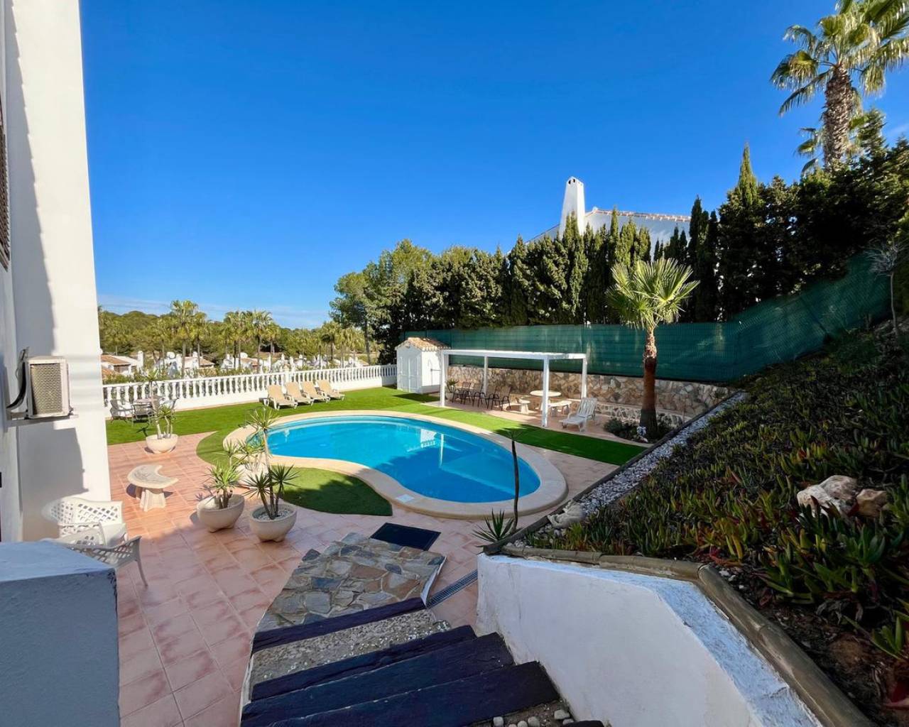 Descubra esta espectacular villa independiente de 4 dormitorios situada en una parcela de 900 m² cerca del conocido Campo de Golf de Villamartín. Hermosamente renovada, combina el encanto tradicional con las comodidades modernas, lo que la hace ideal para familias, amantes del golf y de la naturaleza. La propiedad está rodeada de un exuberante jardín con portón eléctrico, entrada privada, piscina, jacuzzi, zona de barbacoa y una pérgola sombreada. En el interior, el espacioso salón-comedor con chimenea de leña conecta con una cocina totalmente equipada y una terraza con barbacoa integrada, que ofrece impresionantes vistas al campo de golf. Además, su amplio solárium ofrece vistas panorámicas de 360°. Todos los dormitorios están equipados con aire acondicionado, y uno de ellos se utiliza actualmente como vestidor con acceso directo al jardín. El baño principal incluye un lavabo doble, bañera y área de aseo. Con calefacción central, amplio espacio de almacenamiento y licencia turística, esta propiedad es una oportunidad única para disfrutar o invertir en Villamartín.