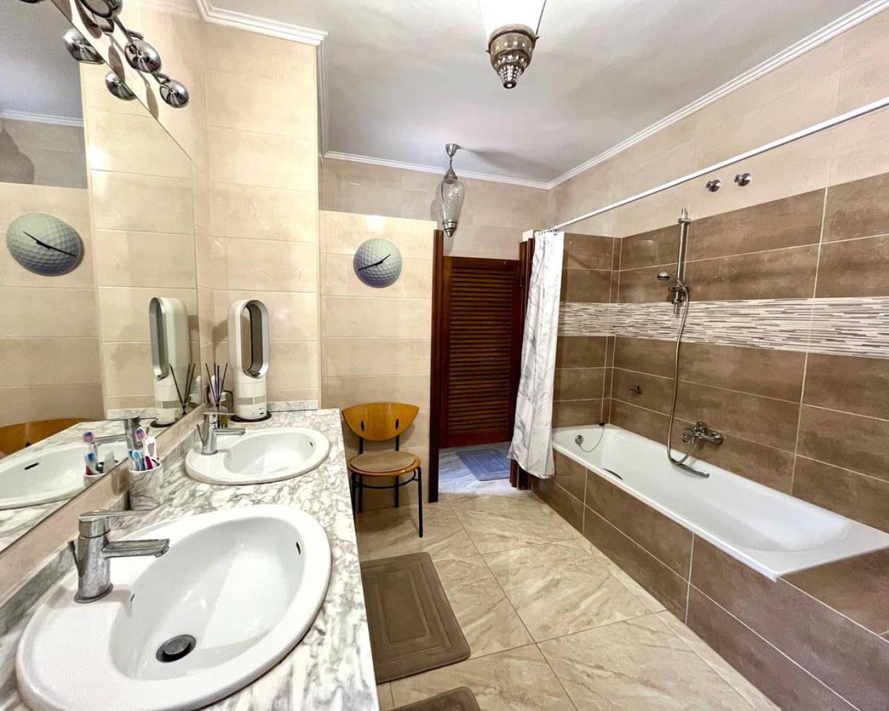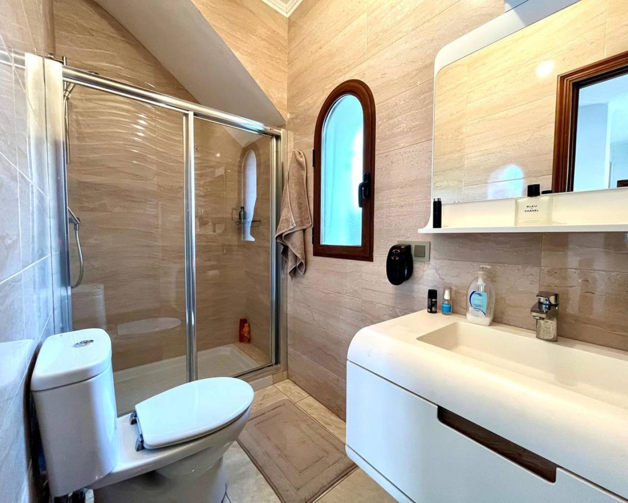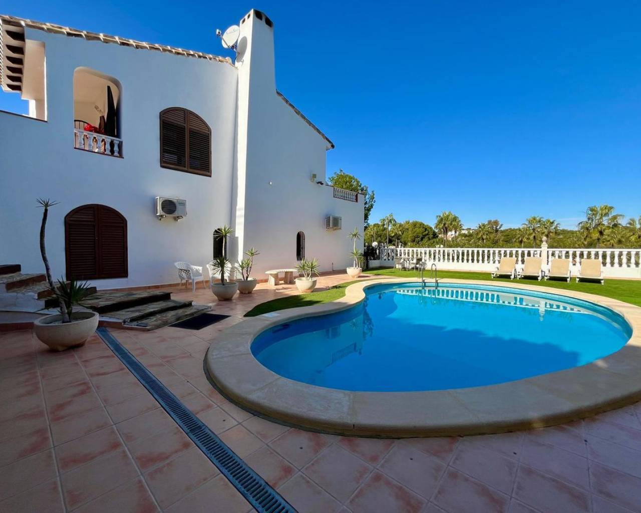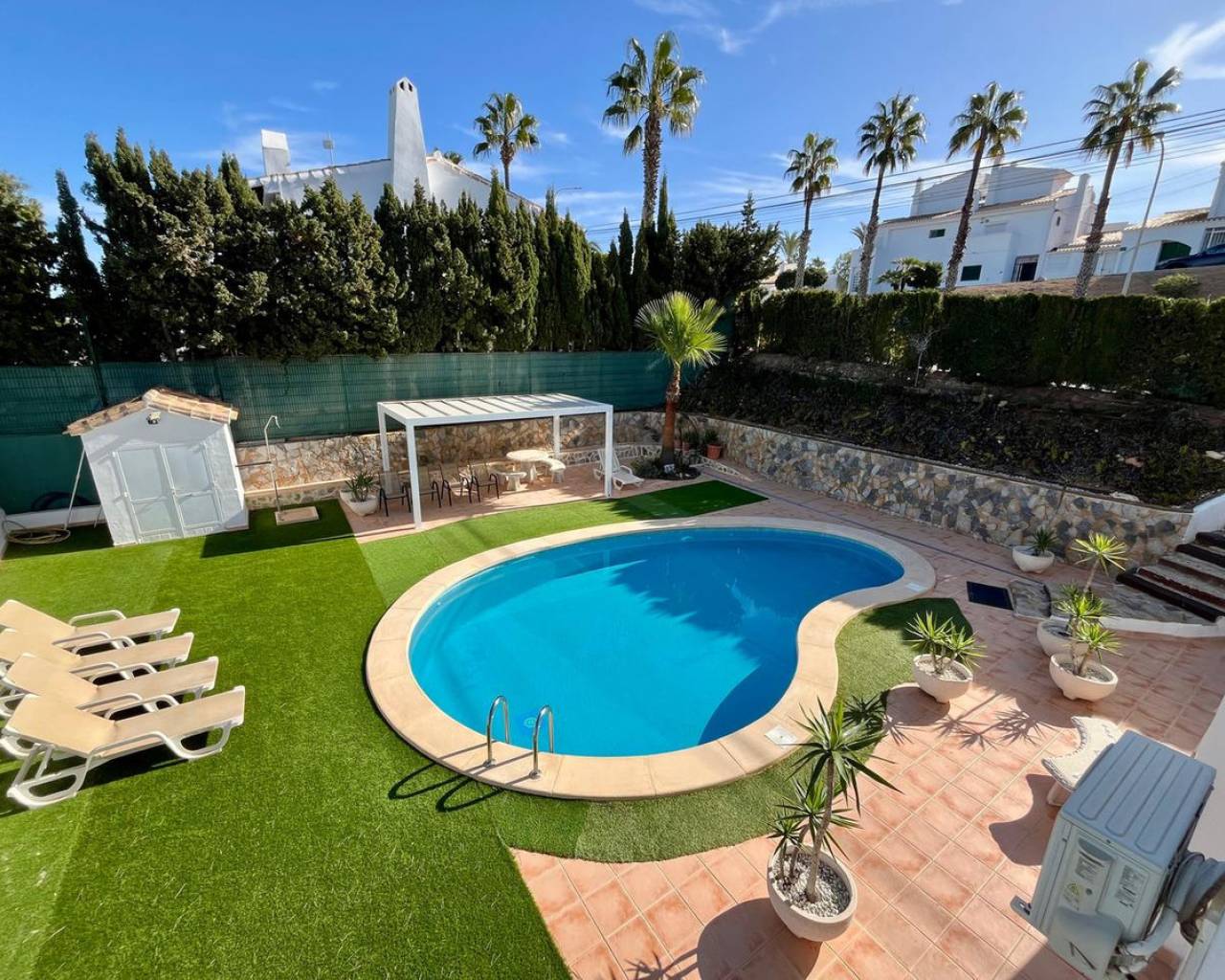 Descubra esta espectacular villa independiente de 4 dormitorios situada en una parcela de 900 m² cerca del conocido Campo de Golf de Villamartín. Hermosamente renovada, combina el encanto tradicional con las comodidades modernas, lo que la hace ideal para familias, amantes del golf y de la naturaleza. La propiedad está rodeada de un exuberante jardín con portón eléctrico, entrada privada, piscina, jacuzzi, zona de barbacoa y una pérgola sombreada. En el interior, el espacioso salón-comedor con chimenea de leña conecta con una cocina totalmente equipada y una terraza con barbacoa integrada, que ofrece impresionantes vistas al campo de golf. Además, su amplio solárium ofrece vistas panorámicas de 360°. Todos los dormitorios están equipados con aire acondicionado, y uno de ellos se utiliza actualmente como vestidor con acceso directo al jardín. El baño principal incluye un lavabo doble, bañera y área de aseo. Con calefacción central, amplio espacio de almacenamiento y licencia turística, esta propiedad es una oportunidad única para disfrutar o invertir en Villamartín.